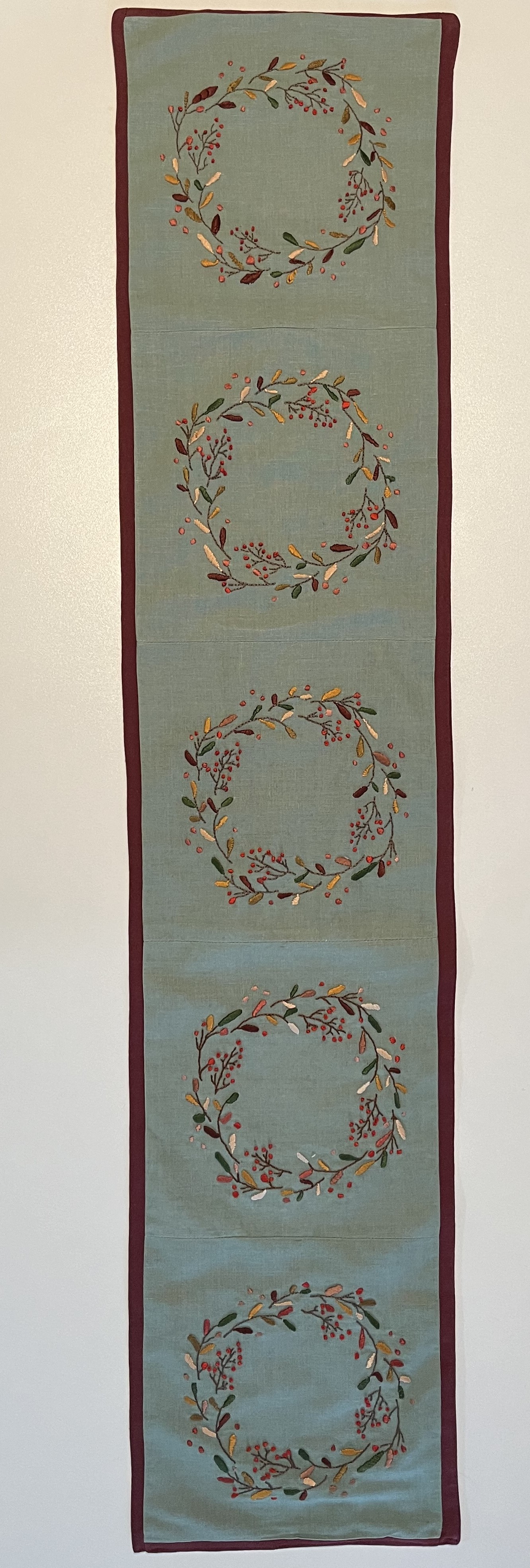 So, out of a table runner, I made some wall decorations. I have already given two away as gifts. While I was working on this, it occured to me that I could make a series 4 wall decorations, one for each season. The one already done is kind of autumn-y; so, I’d just need to embroider the same pattern with colors appropriate for Spring, Summer, and Winter. The perfect project for the coming months – stay tuned!