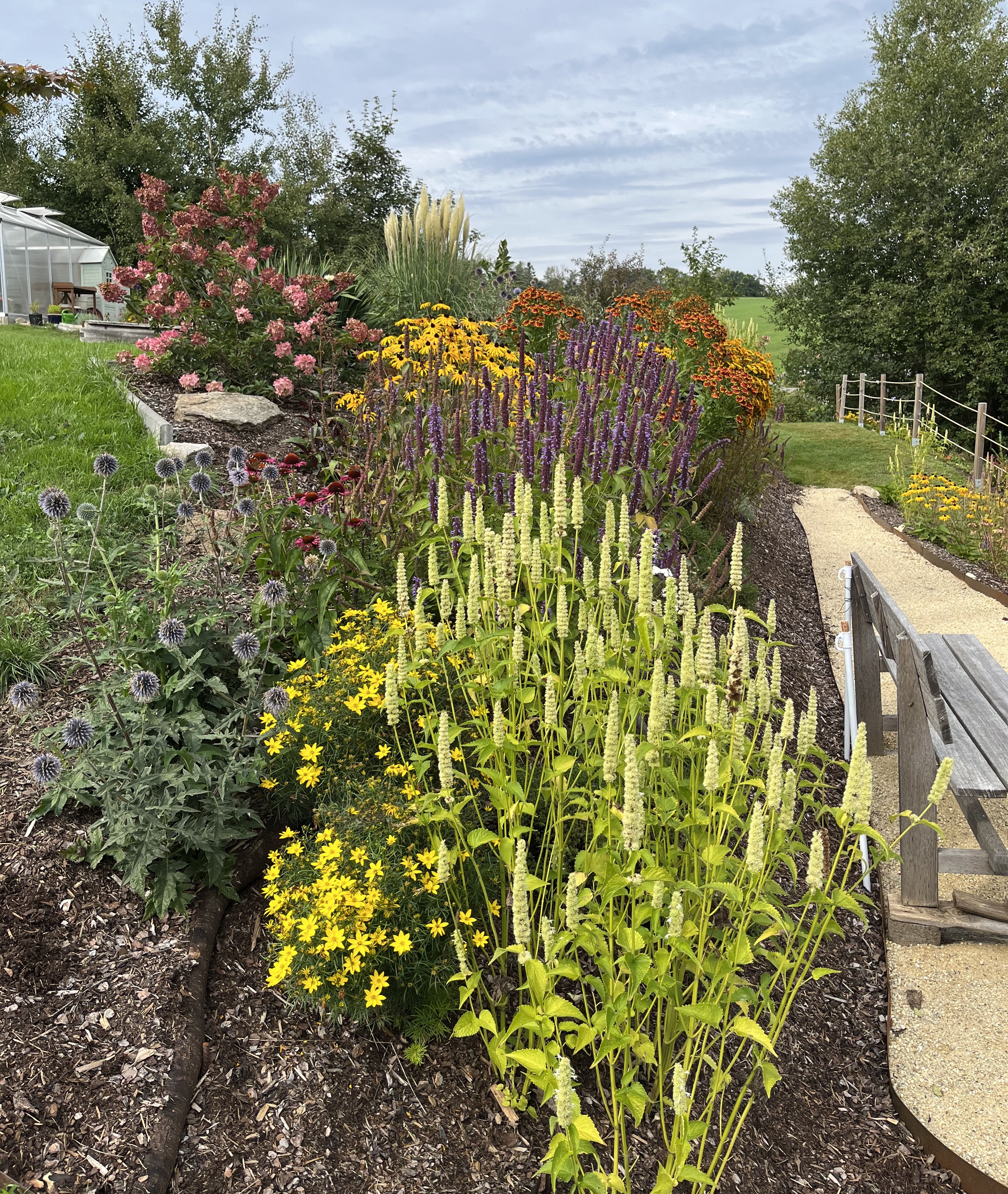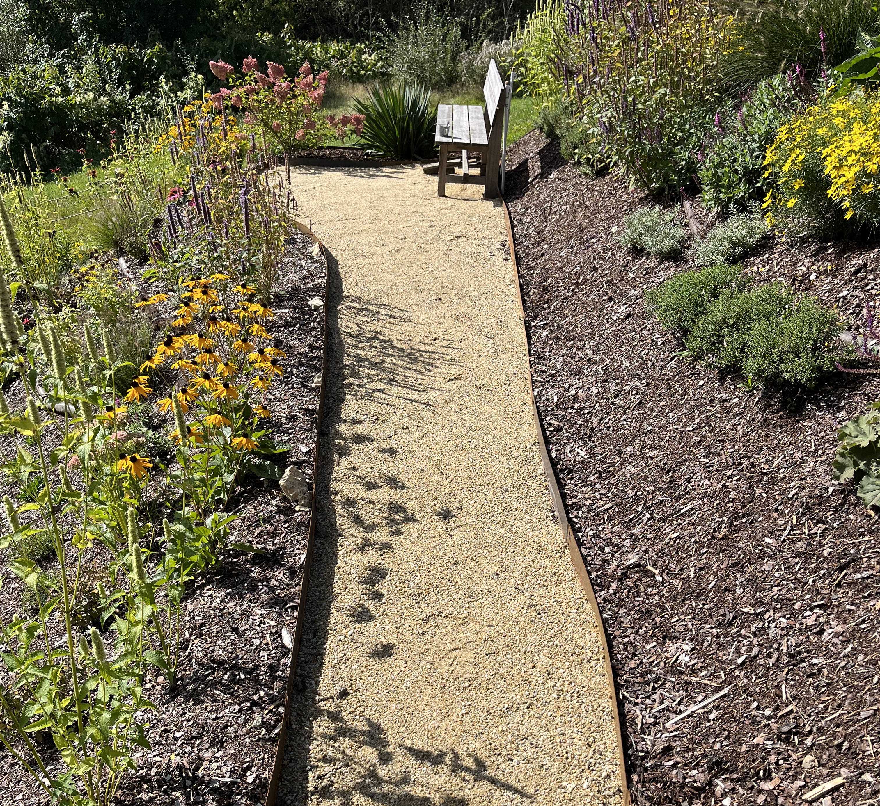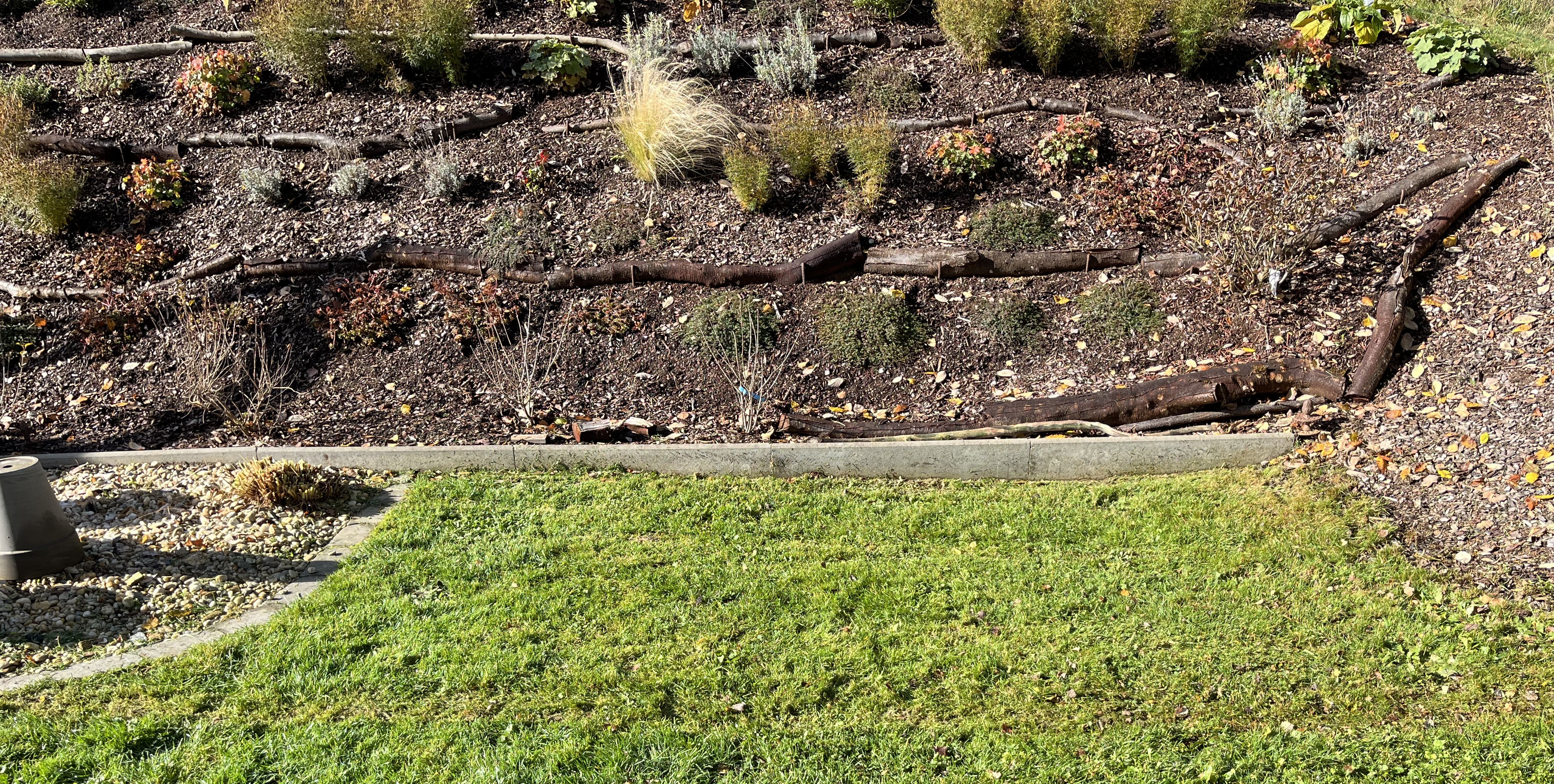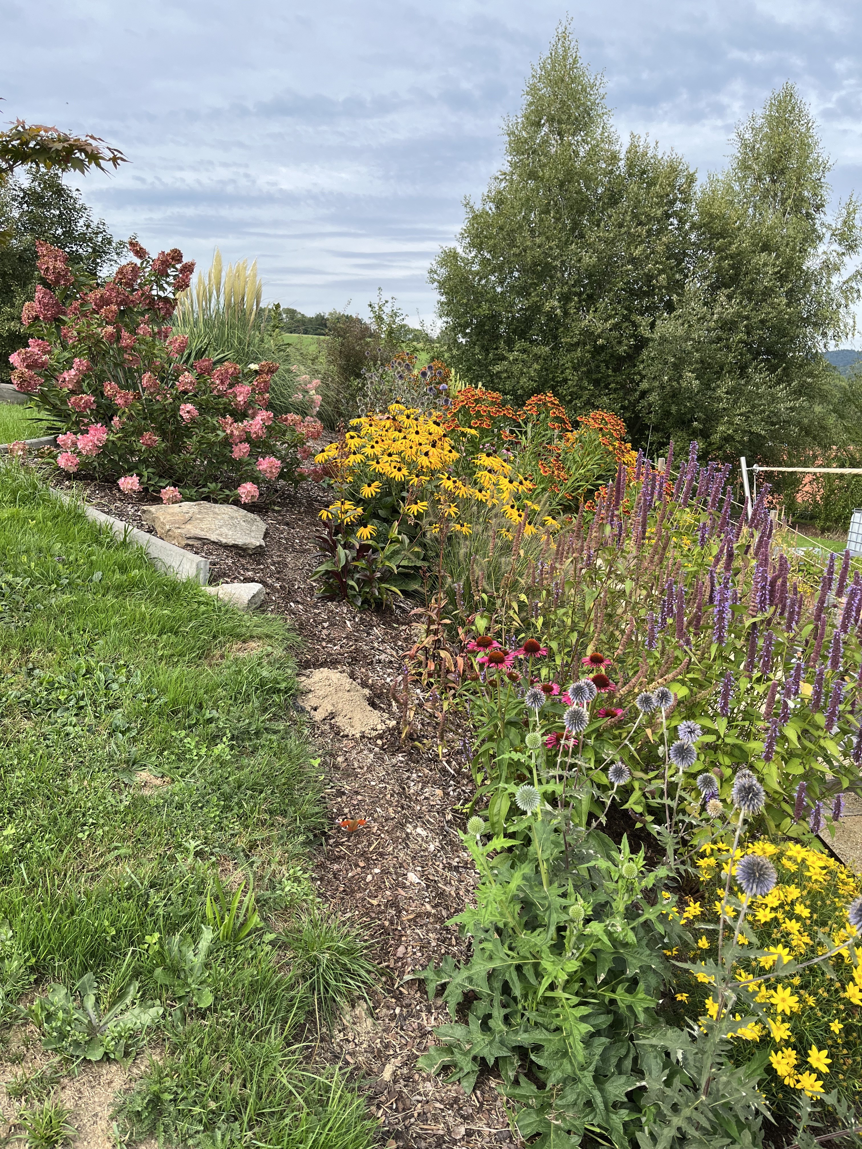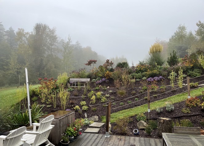 What’s been happening since July (!)? I did (finally) finish the “stone” path … and asked myself why I didn’t think of the solution at the beginning. The flowers on the slopes have really filled in and look wonderful. The set of metal stairs was finally installed … but with some hiccups. But, to be honest, I’ve pretty much just been enjoying the garden and our surroundings. That was the whole point of the move, after all. So, let’s get into it.