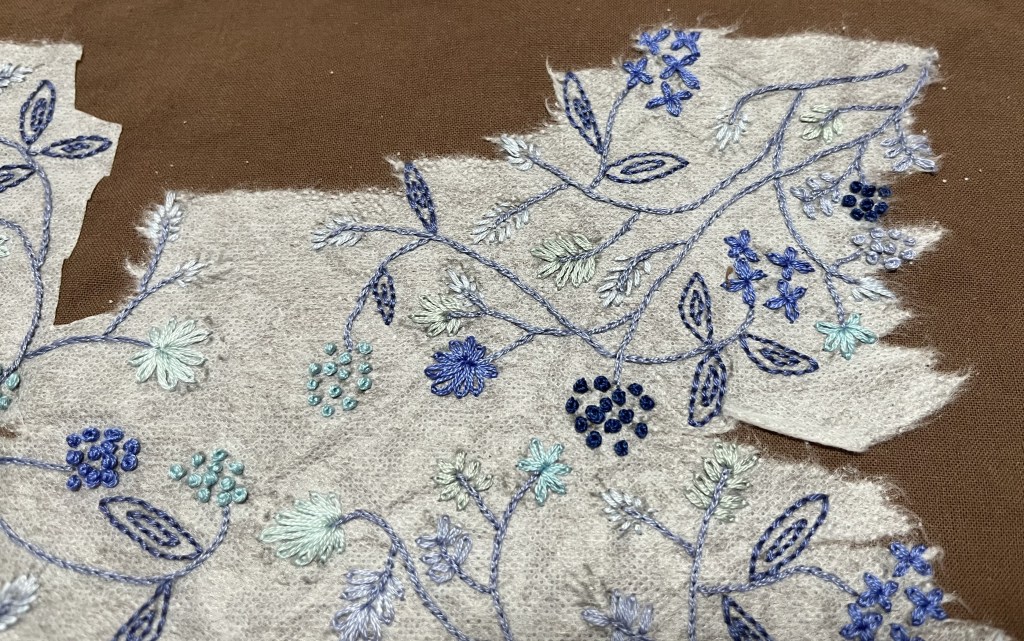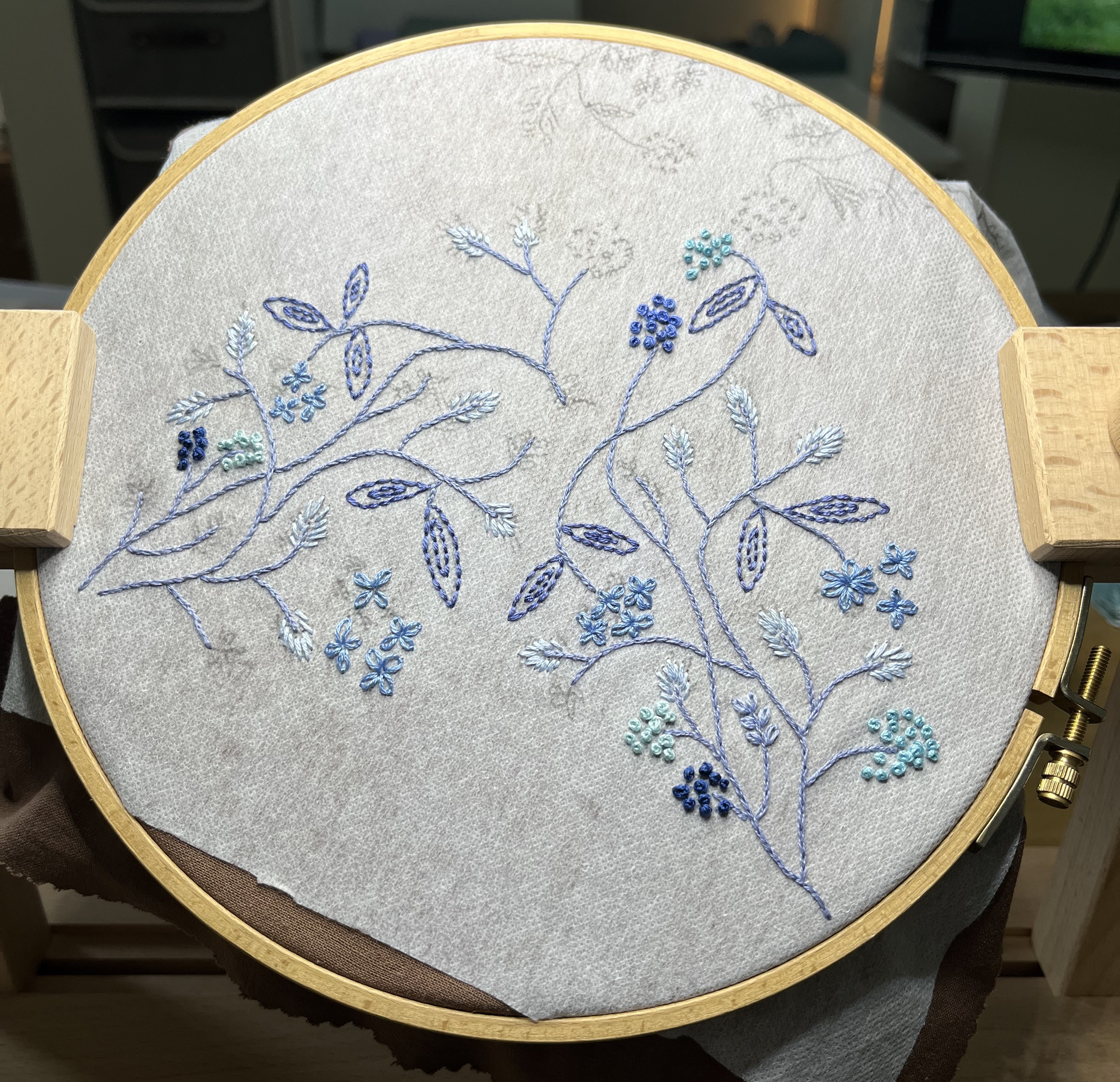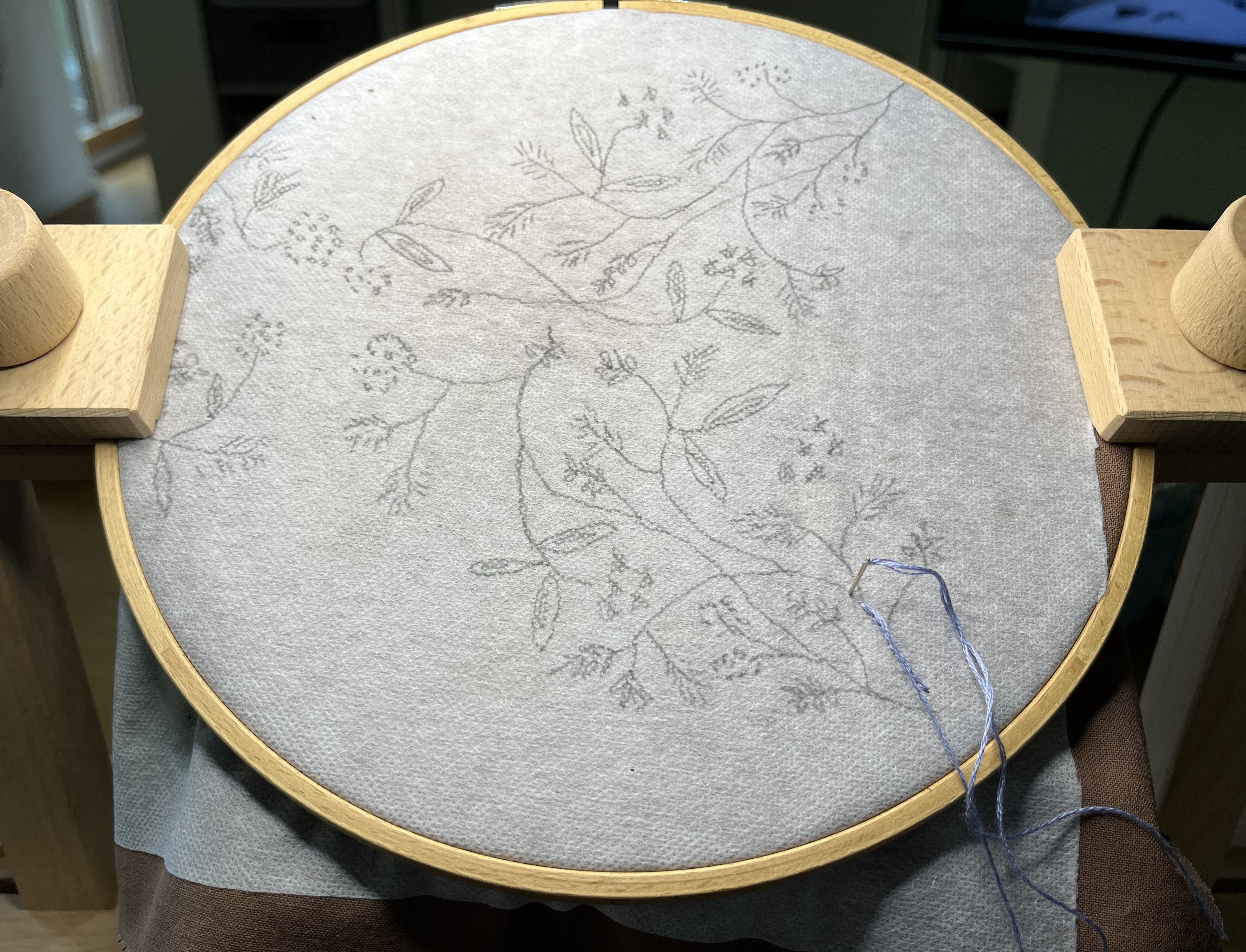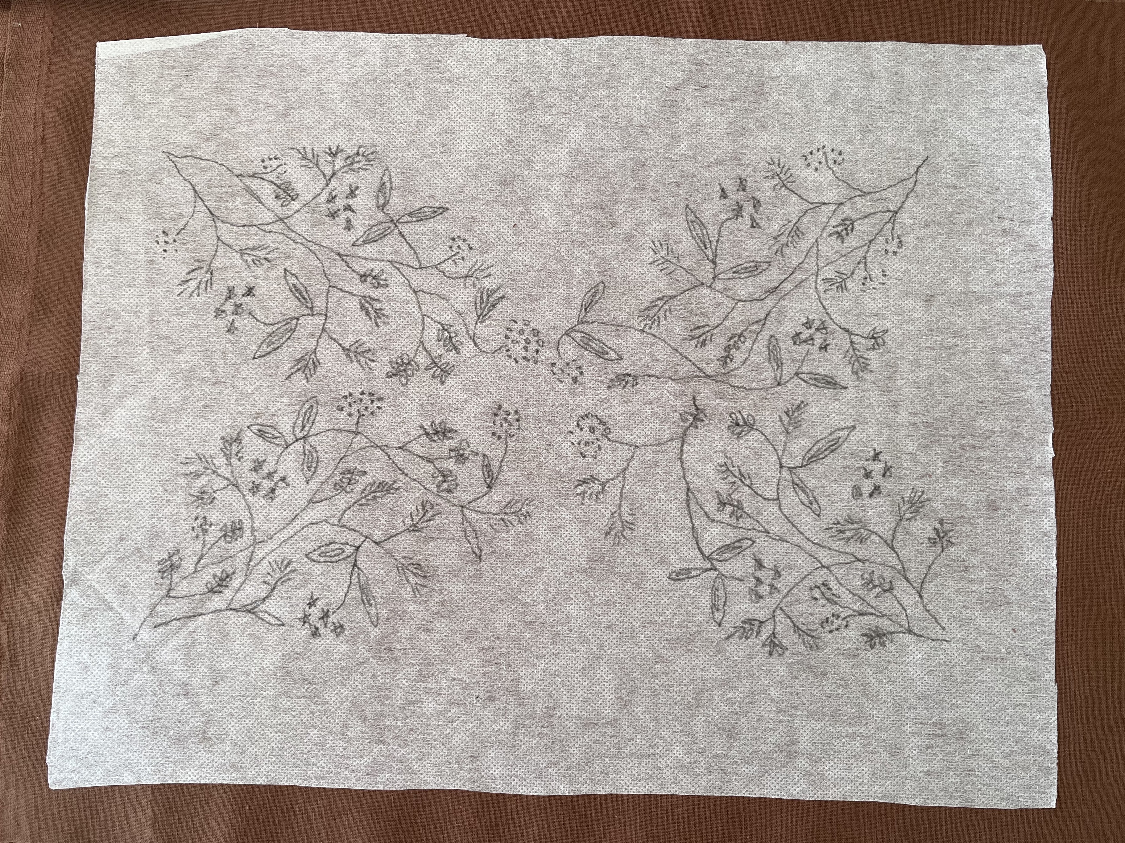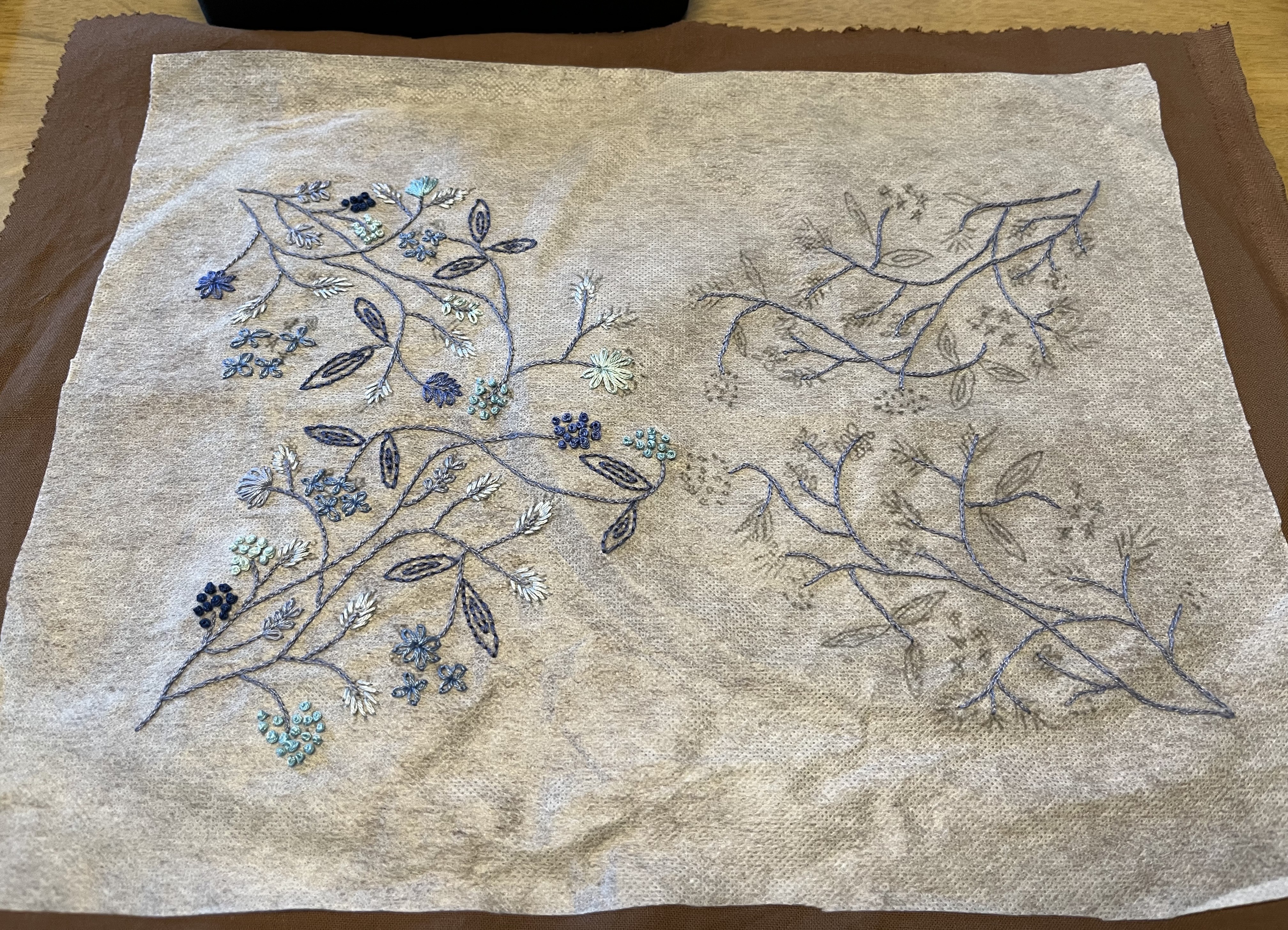 Anyway, after coming up with the design, applying it to vlies and then to the fabric, and choosing the colors, it was time to put thread to needle and get started. Unlike sashiko emobroidery, these placemats use traditional (“western”) embroidery techniques. For the vine-stems, I used the chain stitch and then a combination of stitches for the leaves and various flowers. The colors harmonize well but it is kind of maddening not to know how it all looks against the brown fabric because of the vlies. I’ll just have to wait until the first placemat is completely embroidered to see if my color choices were indeed the right ones. So far, it looks really good, though!