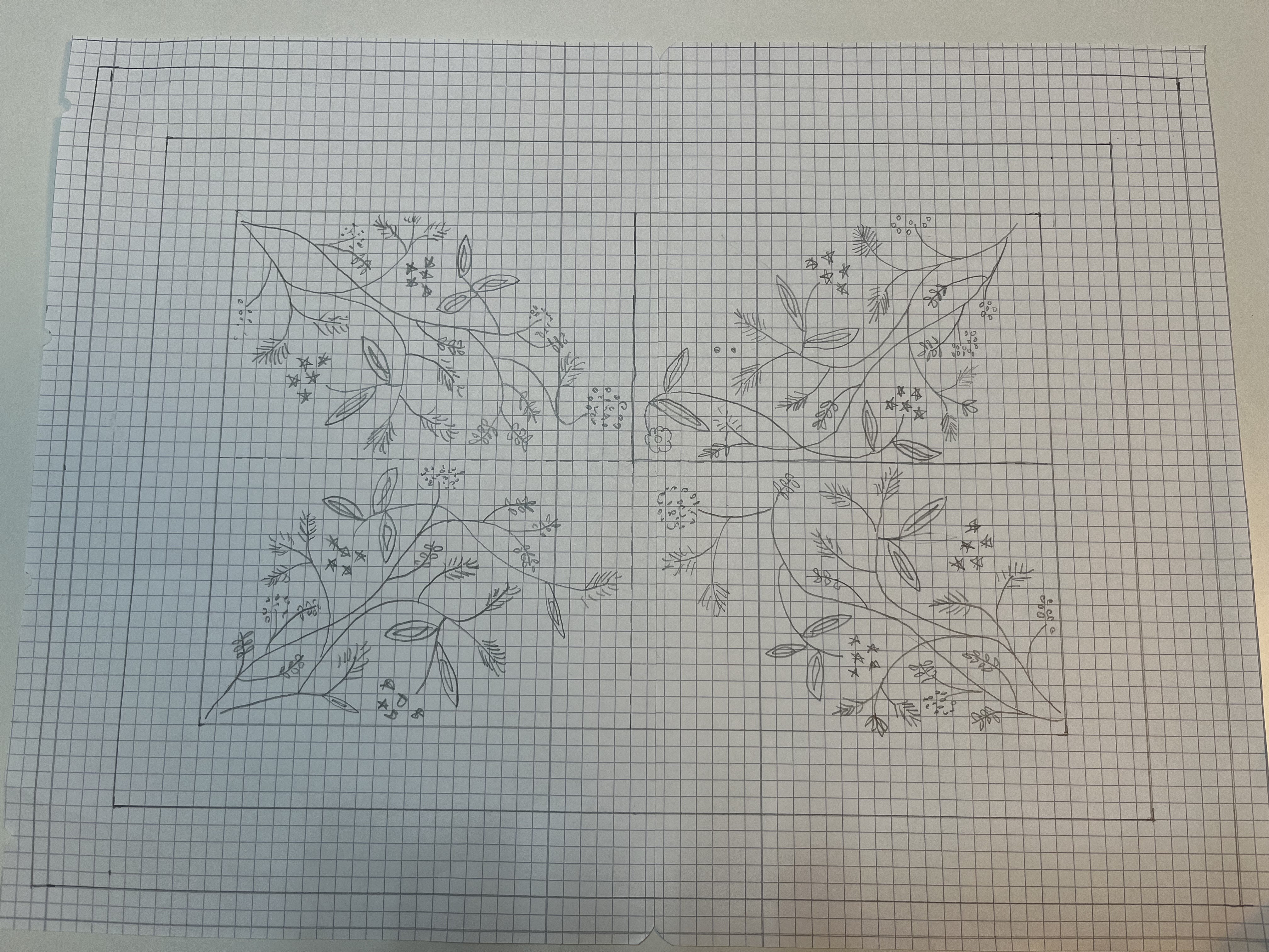 I came up with a floral design but it was too small to fill an entire side of a placemat, so I arranged it in quadrants, dividing the the placemat into four sections and then positioning my design to meet in the center. Clearly, I am not an artist because you can see that the four quadrants don’t match each other perfectly. But, that’s OK, especially when you consider that a plate will be covering the design anyway.
