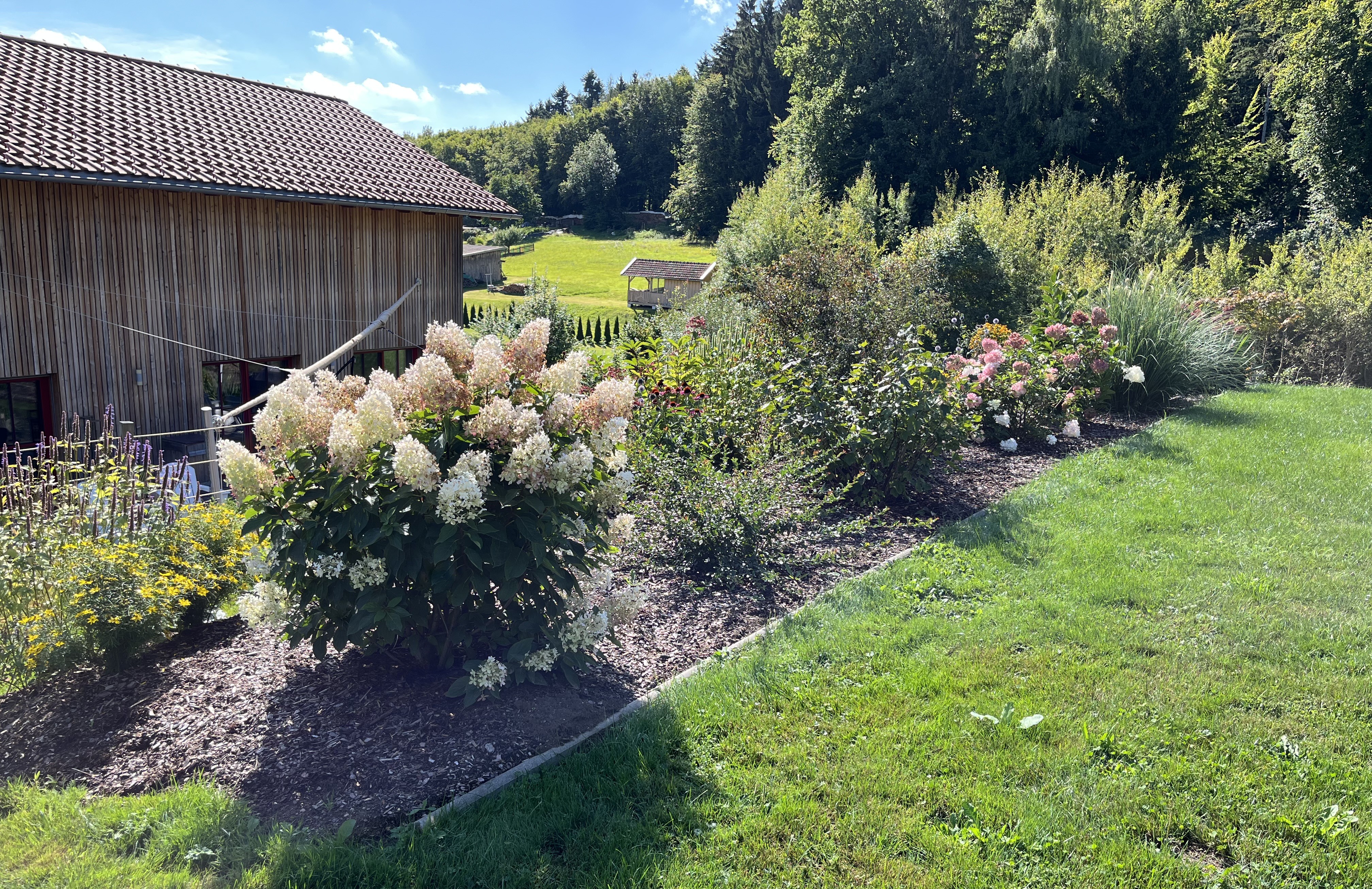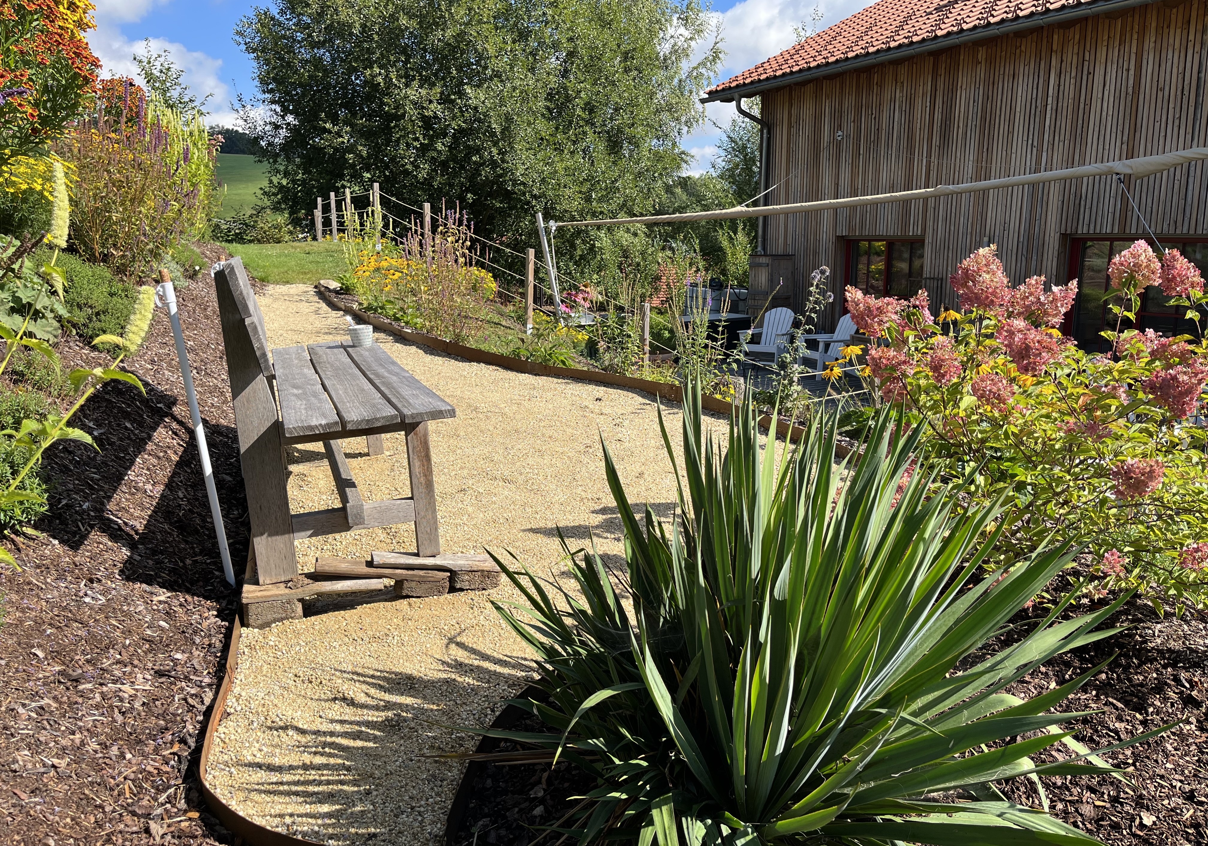The whole point of this path was to have something we didn’t have to mow, thus the idea of a slate walkway. But, without a solid surface, the weeds are going to grow. I do not believe in using chemicals in the garden and using “manual elimination”, i.e. grabbing the things with my hands and pulling, was not going to work if there was a fleece layer underneath the sand. There was only way to move forward: cut the weeds as best I could; push the sand aside, pull up the garden-fleece with the weeds and toss it all; then, spread out the sand again. And, that is what I did. It was one of those 30°C days, no shade in sight, and I am out there fighting with 10 meter long rolls of garden-fleece. But, I finally got it all removed, saved as much of the garden-fleece as I could (you never know when you might need garden-fleece), smoothed out the sand, and then placed one of our wooden benches on the spot where our chairs should have gone. Will the weeds grow back? Naturally, but now I will be able to remove them easily without the fleece. And, how does it all look now? Judge for yourself…