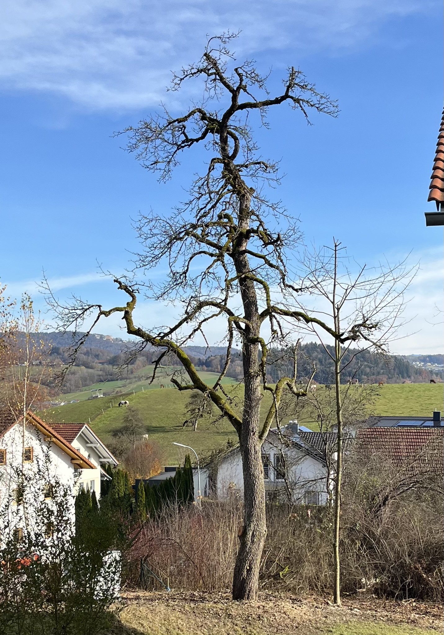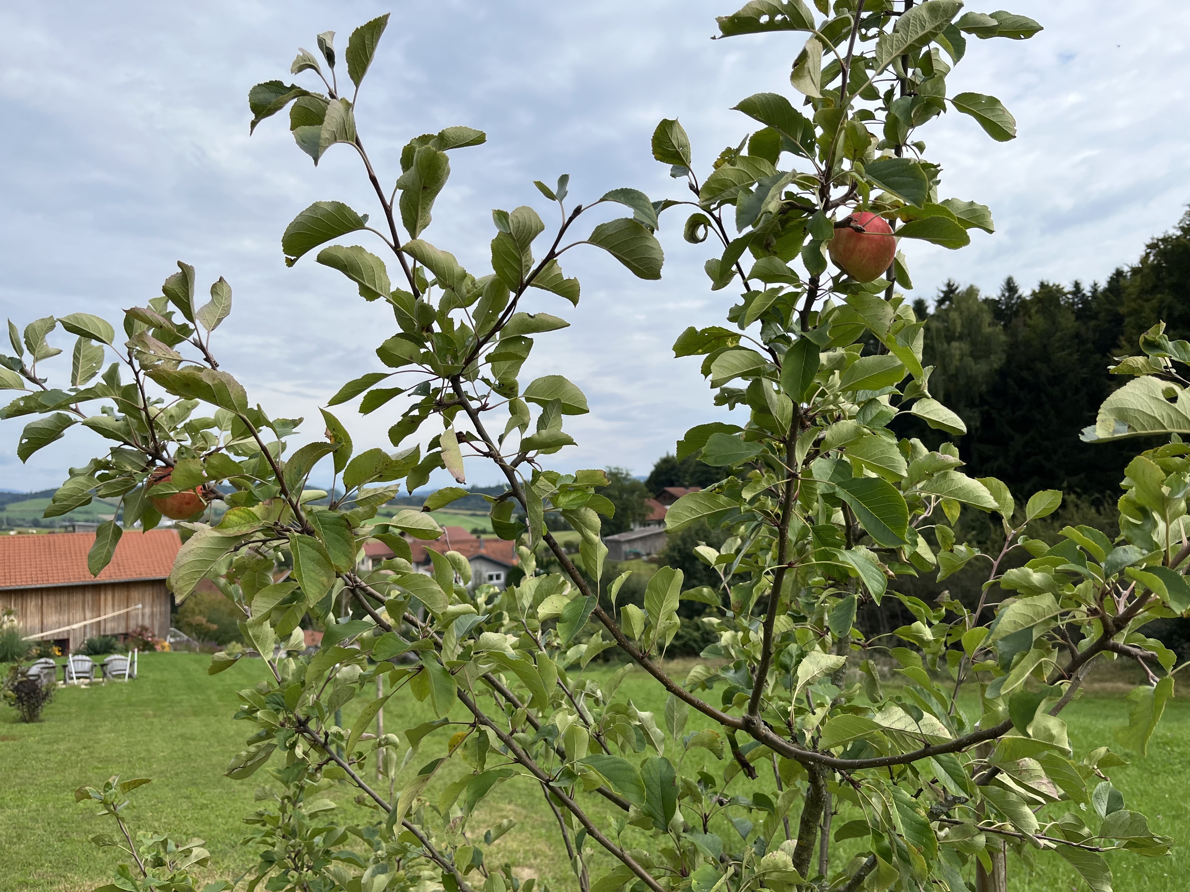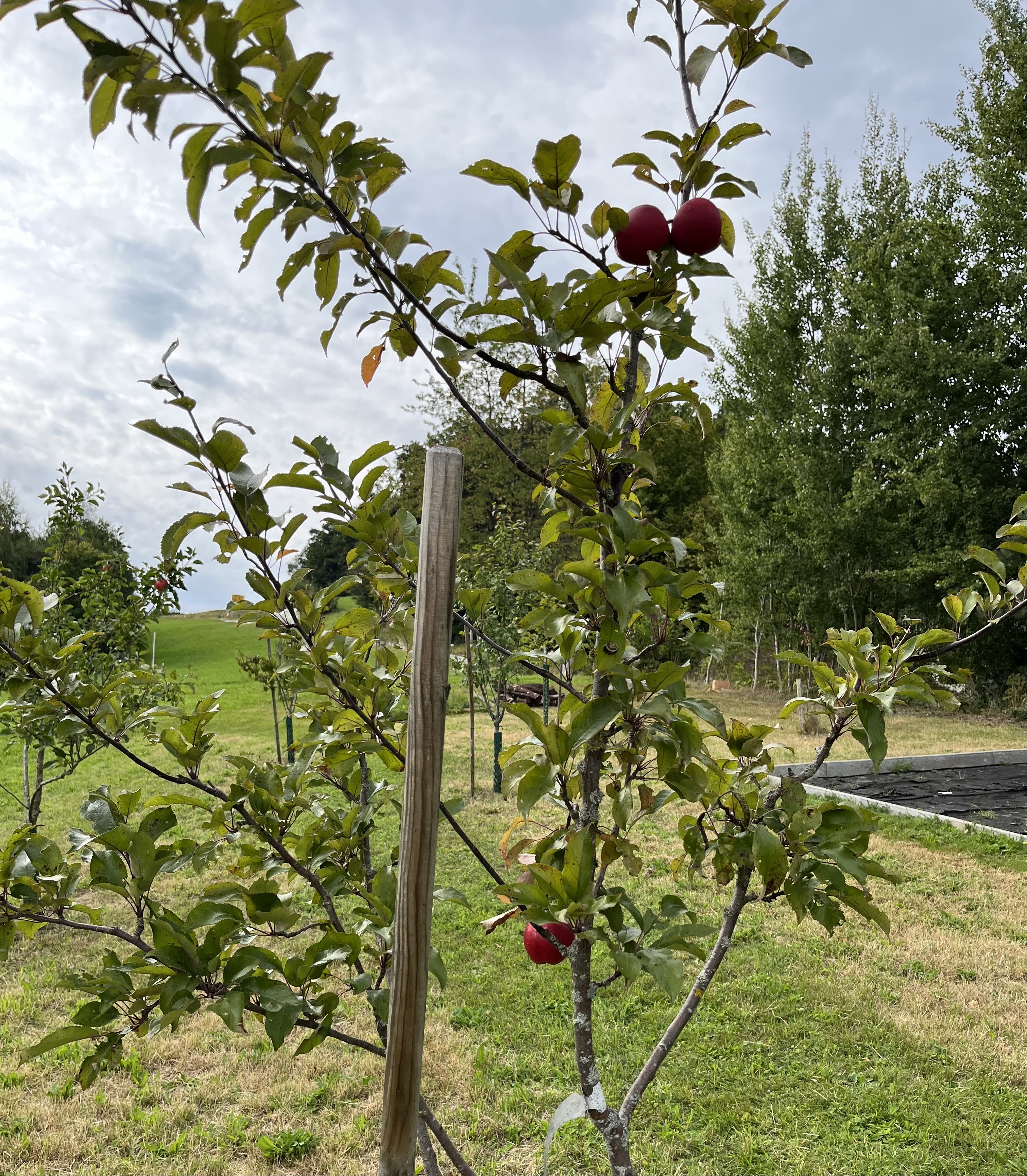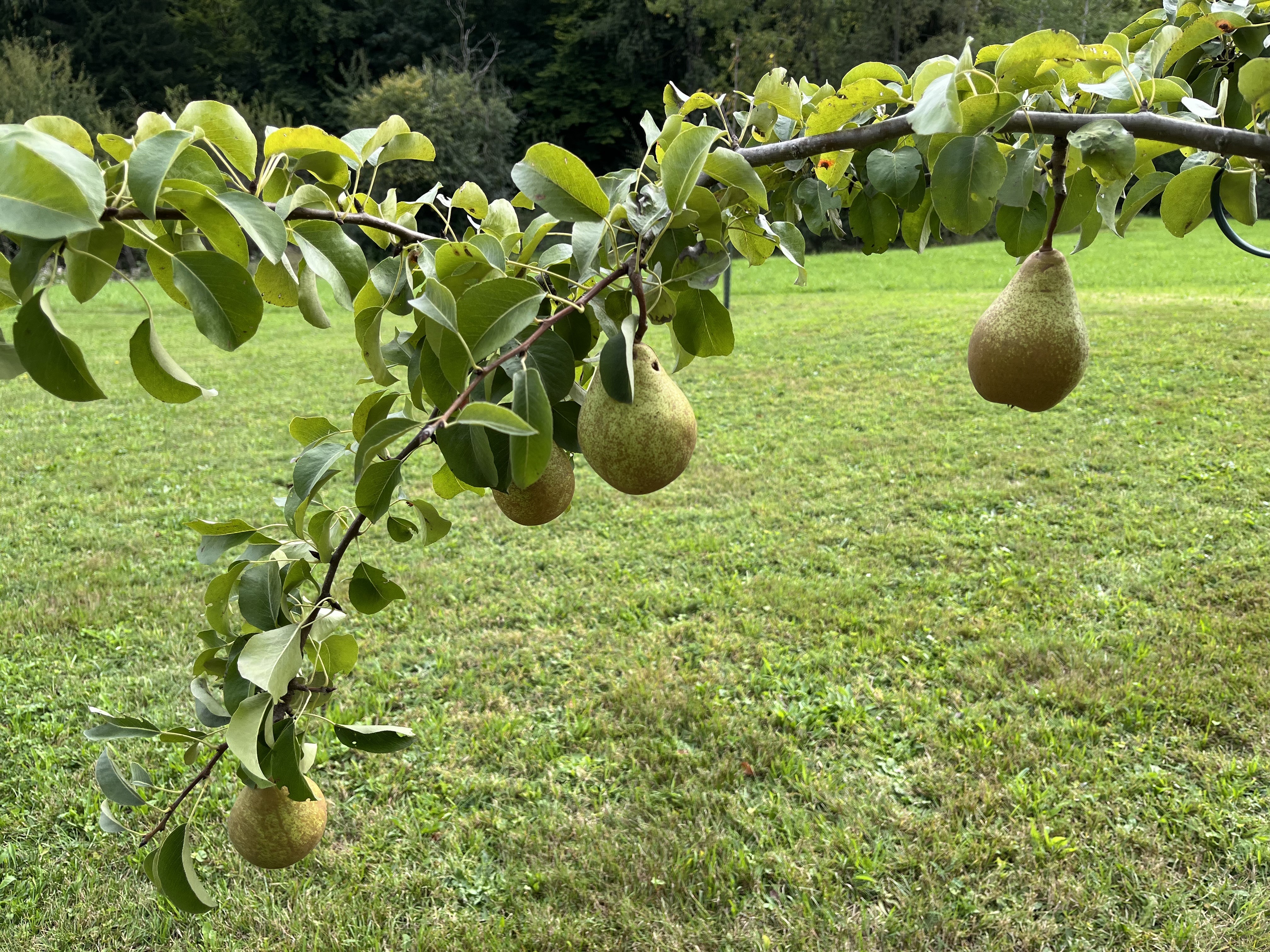The fruit trees are coming along nicely. We spent a couple of hours recently binding and bending the limbs of various trees to ensure better fruit production. Thanks to a fantastic Austrian youtube channel (Obstbaumschule Schreiber), we learned a lot about how to care for young fruit trees. There are 7 fruit trees and a walnut tree. Aside from one apple (I think) tree, I have identified them: 1 cherry tree, 3 pear trees, and 2 (3?) apple trees. The previous owners had put chicken wire around the trunks of the trees to protect them from deer, etc. I decided to switch this out with a more professional protective barrier. They are all really young and three are already producing fruit!