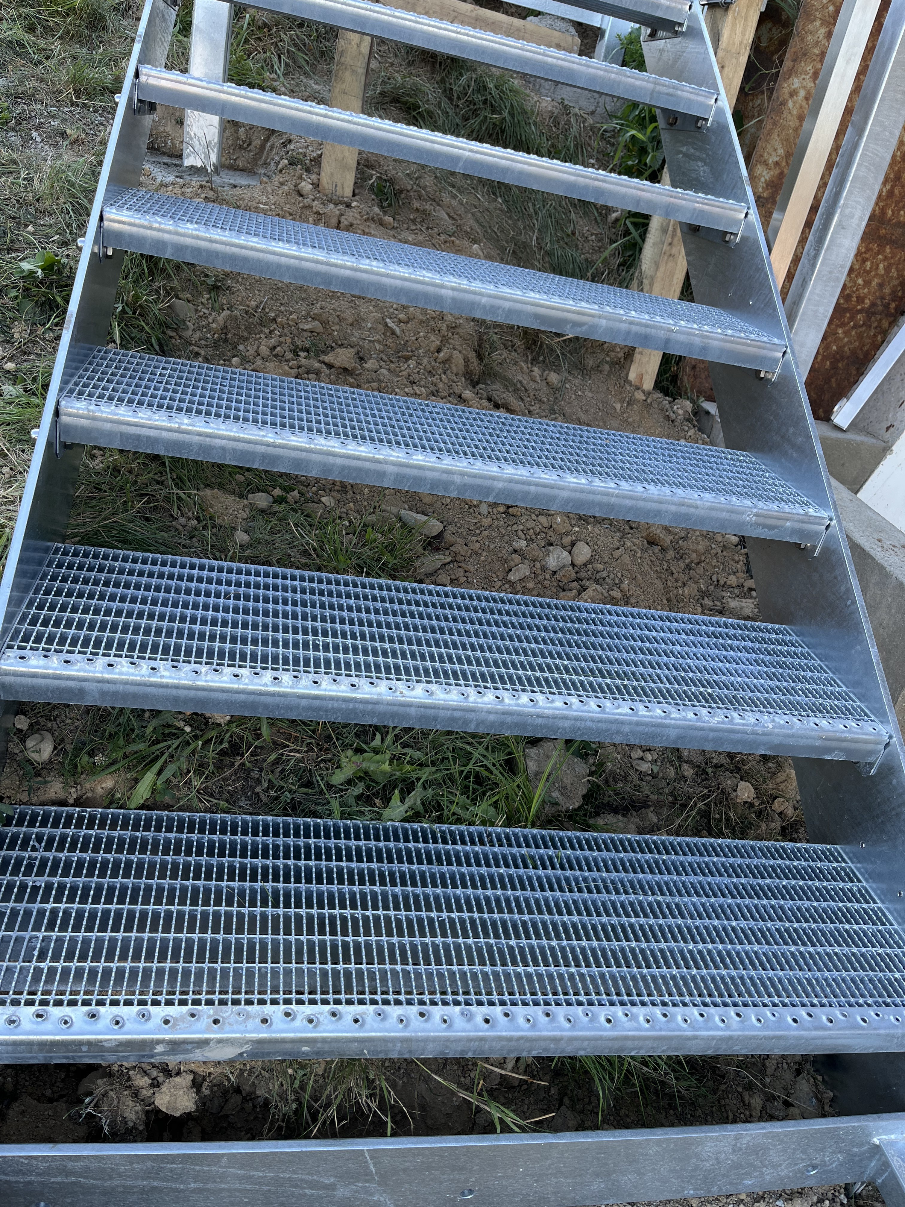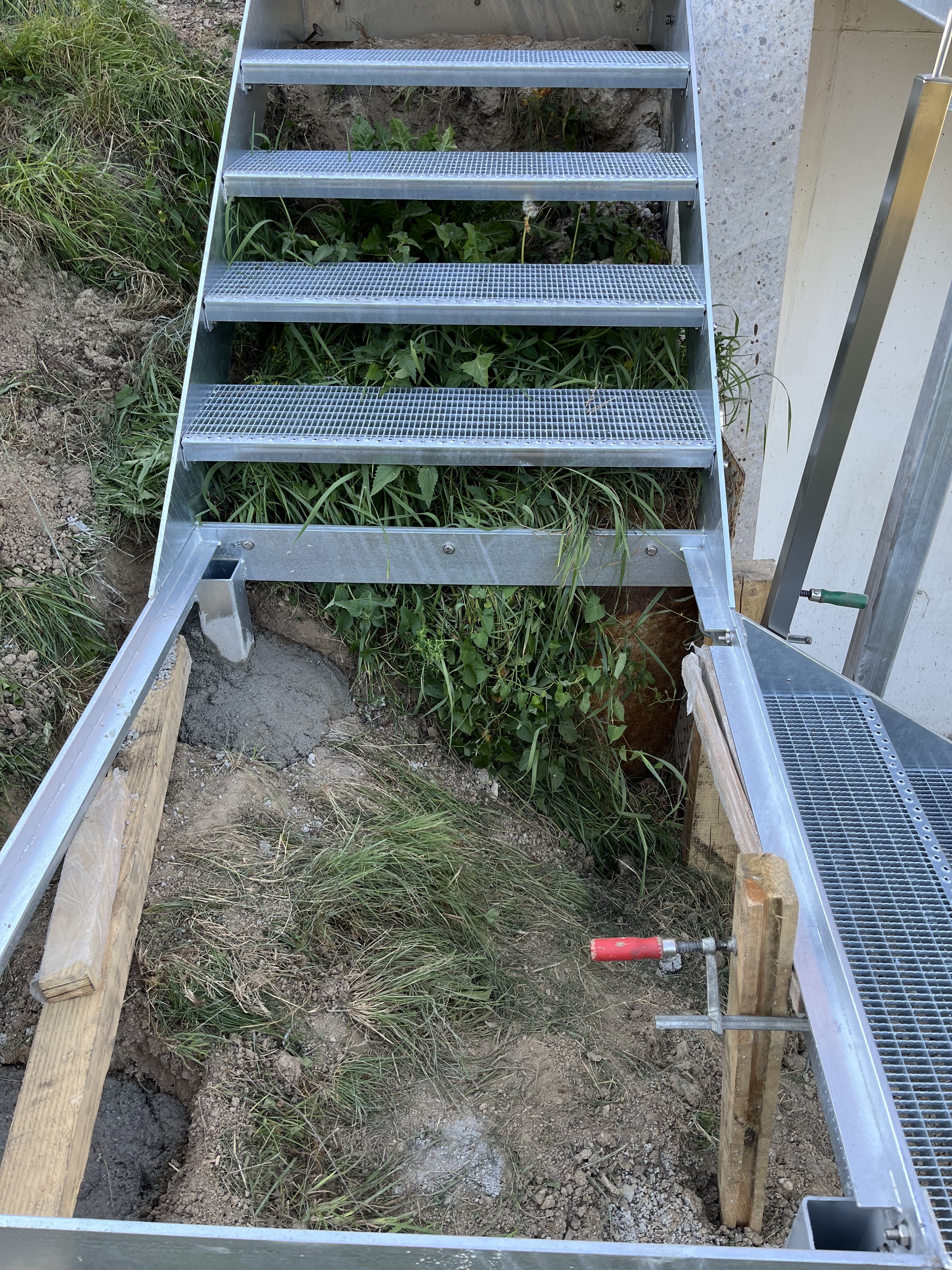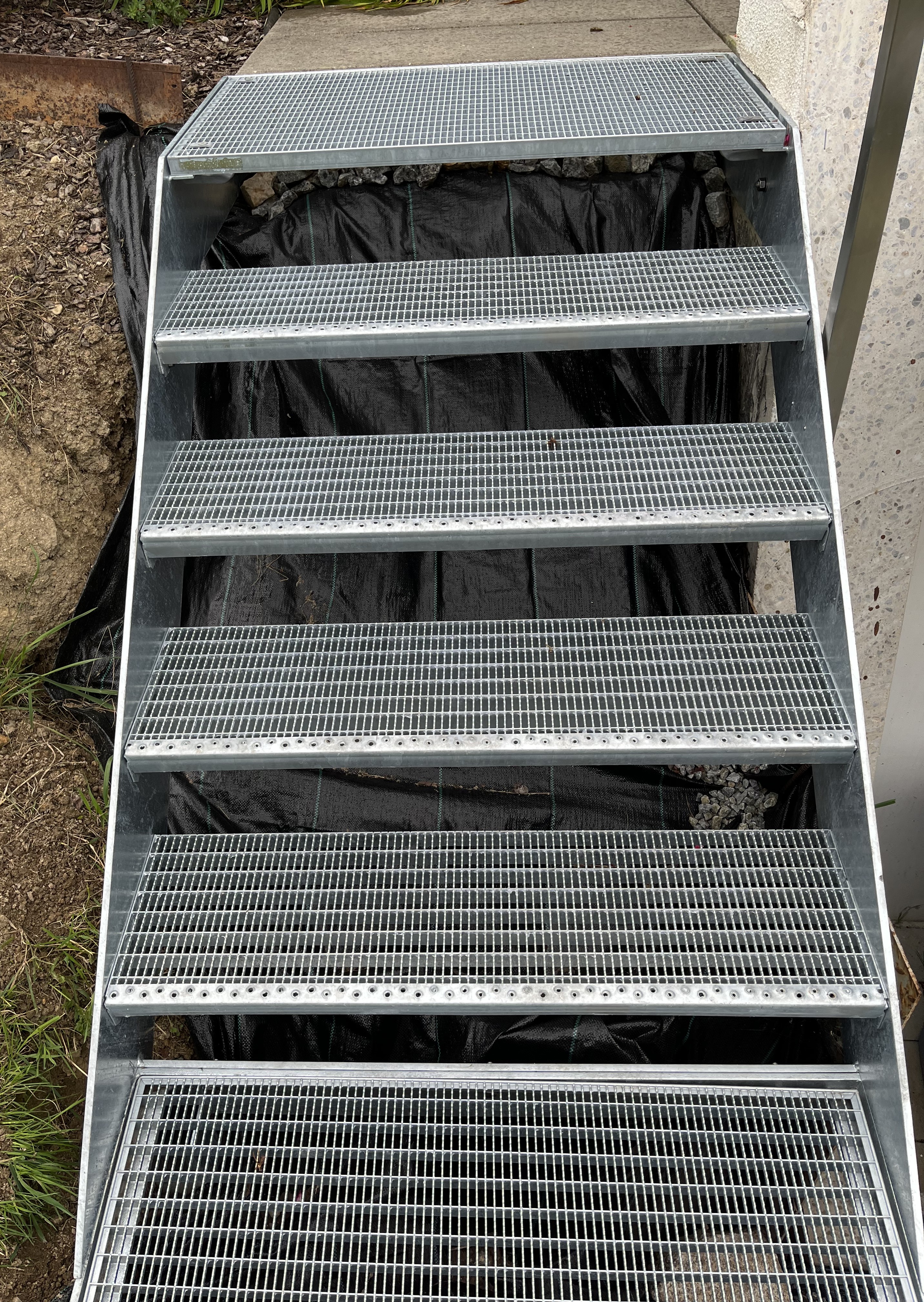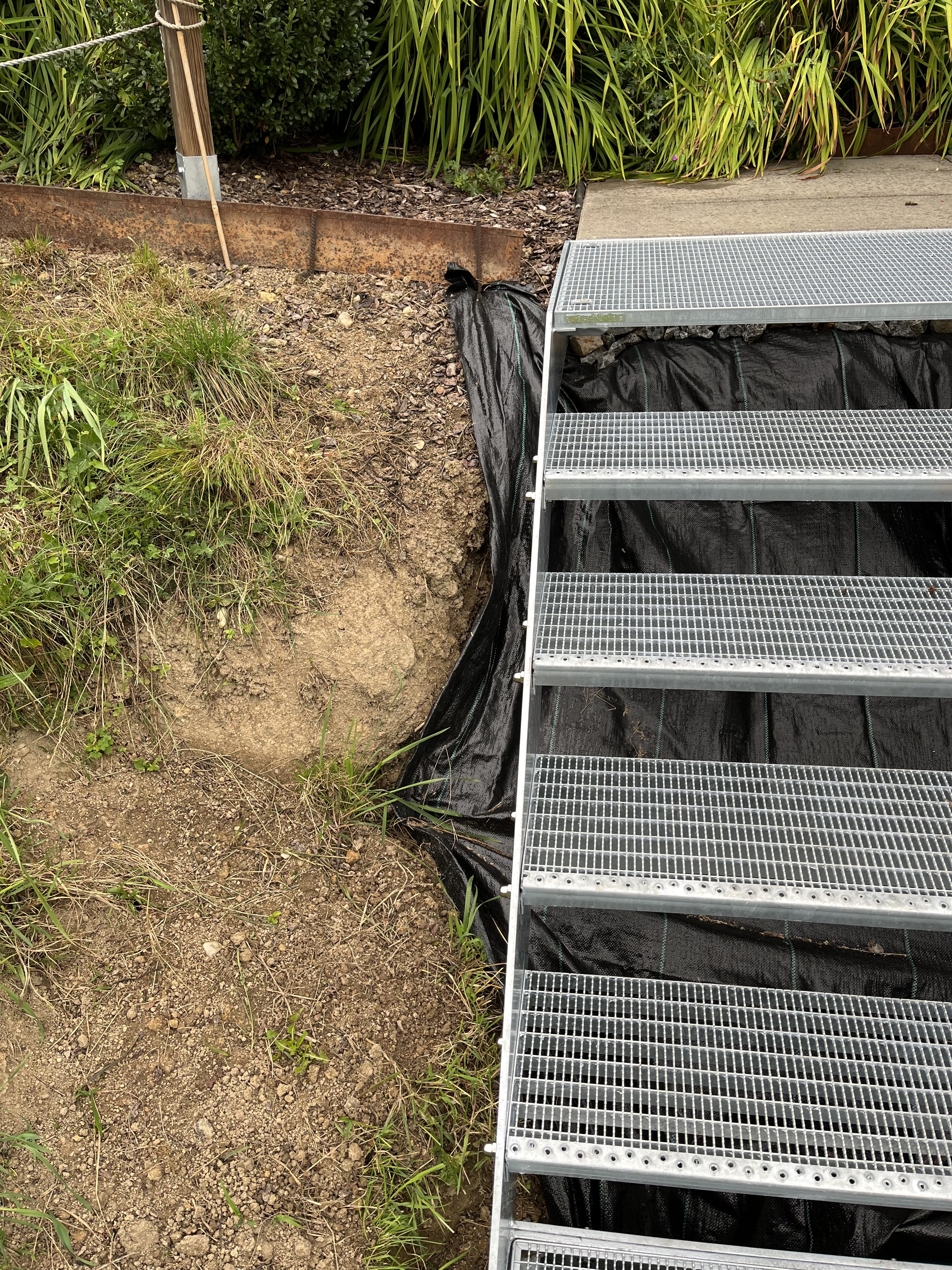 I couldn’t leave things this way. How the heck was I going to get to the spots underneath the stairs to be able to pull out the weeds??? In the end, the metal stair guys did the initial installation. Then, I called a work stoppage so that I could, by hand, prepare the ground as best as I could. Then, the metal stair guys came back to finish but noticed that one of the platform pieces was incorrectly manufactured and needed to be replaced. We can use the stairs as is but there is a rickety spot. Once this last piece is in place, the stairs will be finished but the ground around the area still has to be worked somehow. Given that it is September (my meetings with the two companies were back in June!), there is no point in planting anything; chances are the plants won’t have enough time to establish themselves before winter. I’ll wait until Spring. Until then, we’ll live with how it looks …