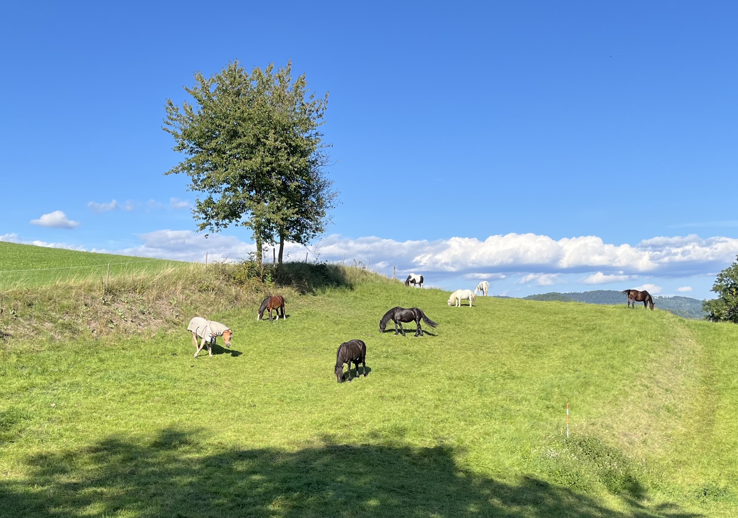 As I mentioned at the start of this post, it has been wonderful to simply be here, to live here, to execute my daily tasks here. Beautiful vistas, gentle rolling hills and meadows, dark and atmospheric forests, bubbling brooks, and – on really clear days – views of the Alps … we are very, very lucky to be surrounded by such beauty. Here are a few photos of what I am mean …