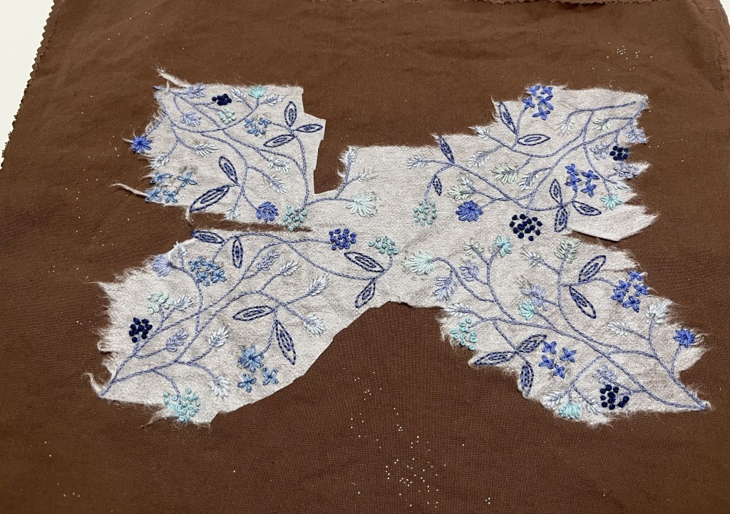 And, while I was rummaging through my collection of fabric scraps, etc., I stumbled across some brown fabric I had used for a sewing class (made a skirt out of it) and decided – yes! more placemats, please! While surfing for something or other, I saw a photograph of a brown vest with beautiful blue-ish embroidery and decided this color combination would work great.