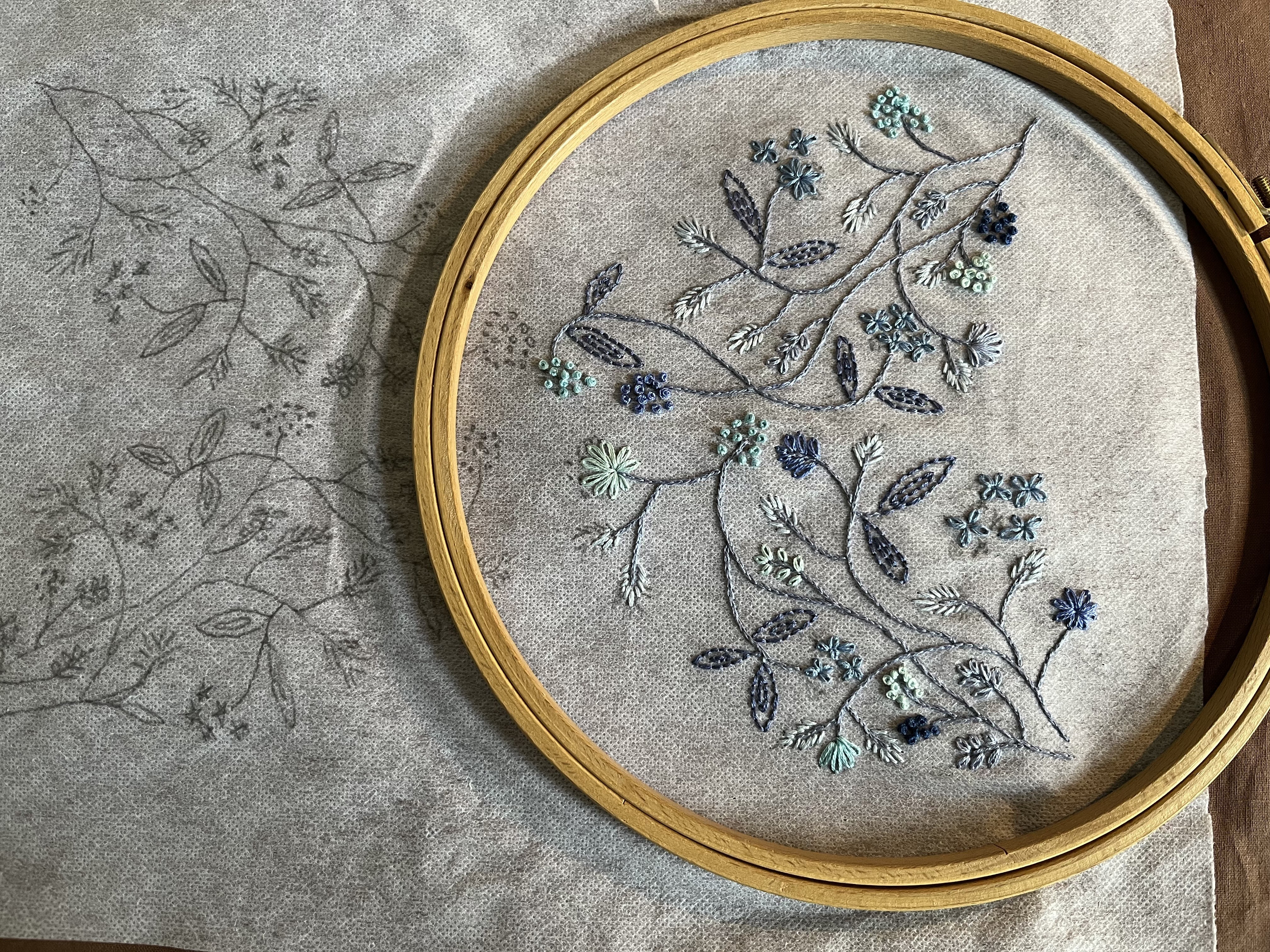 Using my handy backlit lamp, I traced the design onto sticky vlies and ironed that onto the fabric. The last step, before actually starting the embroidery, was to select the colors. I went through my collection of embroidery thread and picked out all the blues I thought would work. I’ll be starting the embroidery today or tomorrow and will update you on my progress in the next post.
