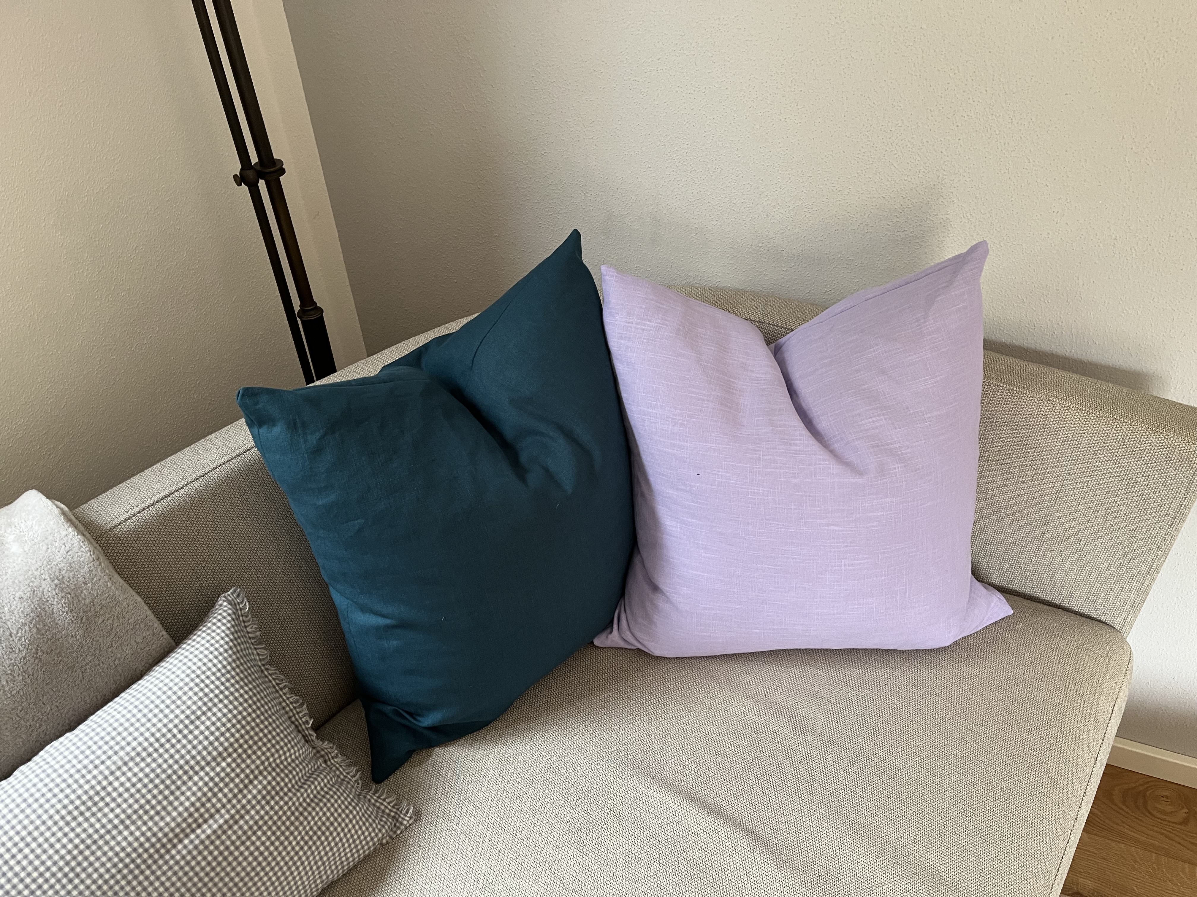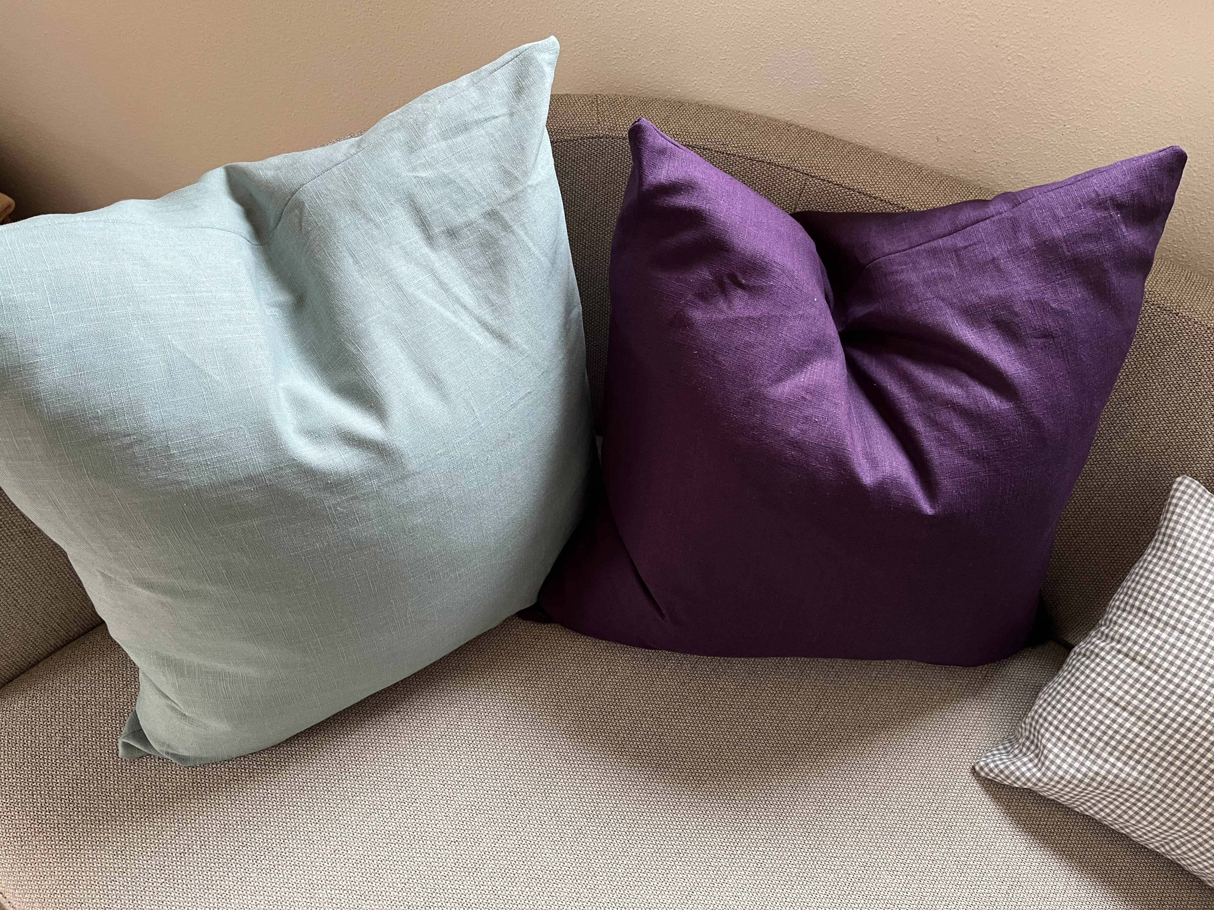 Apart from the embroidery, I finally got to two projects that had been nagging at me. For a while, now in this new house, I wanted to change the color scheme for our couch in the living room, not the couch fabric but the throw pillows. In the past, I blogged about embroidering throw pillows and I used colors that worked in the old living room … not so much in this new living room. Although, I should say that it all looked OK. But, if I am truthful, part of me just needed a change: new house, new throw pillows. 😉