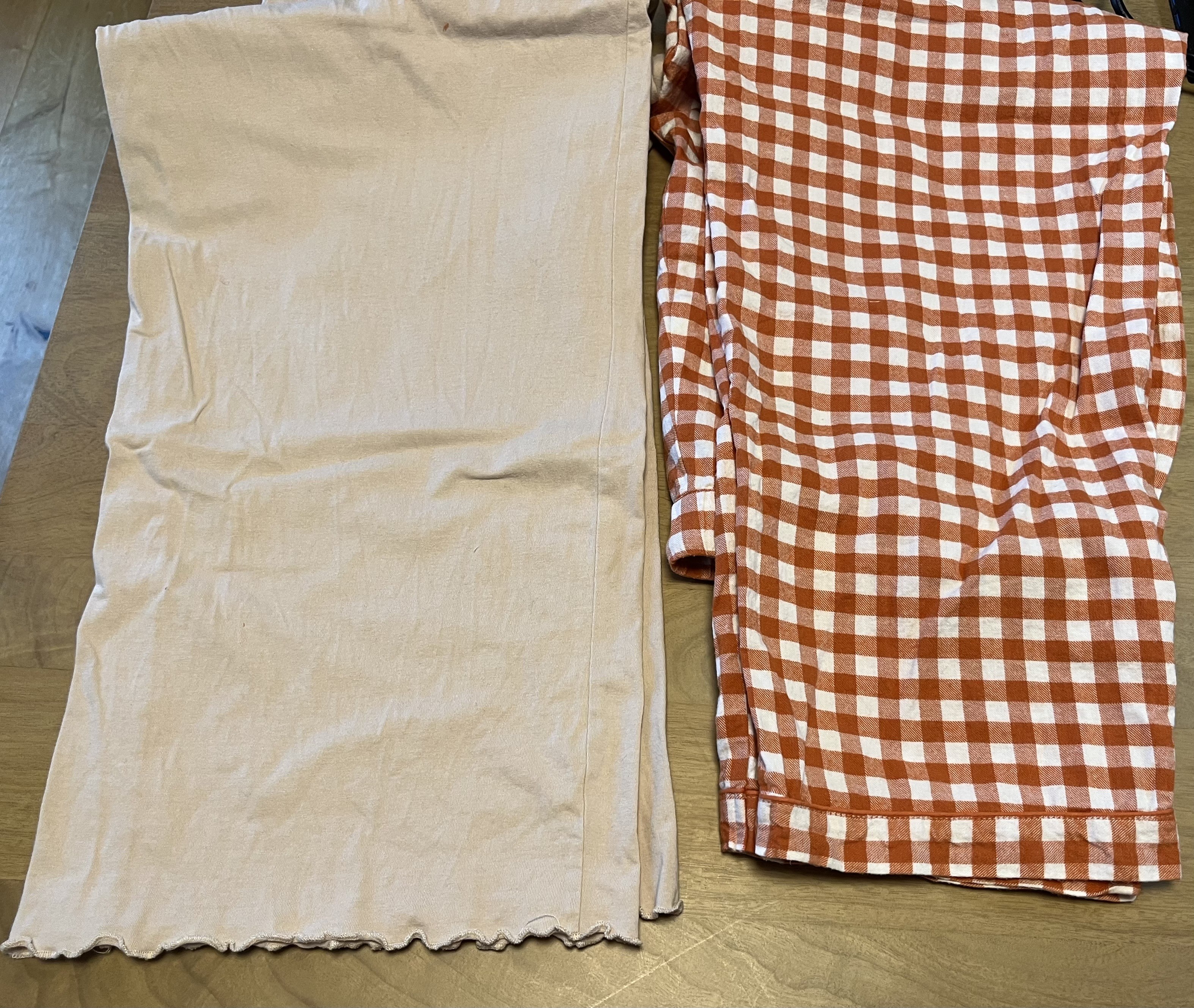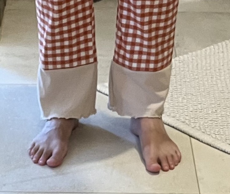 I had a pair of PJ pants I was going to toss (or donate). Instead of that, I cut off the bottom 20 cm of the pant legs and added that to the new PJ pants et voilà: PJ pants that go all the way down to my ankles! It’s kind of funny: they remind me of the pant cuffs on fire department uniforms. LOL