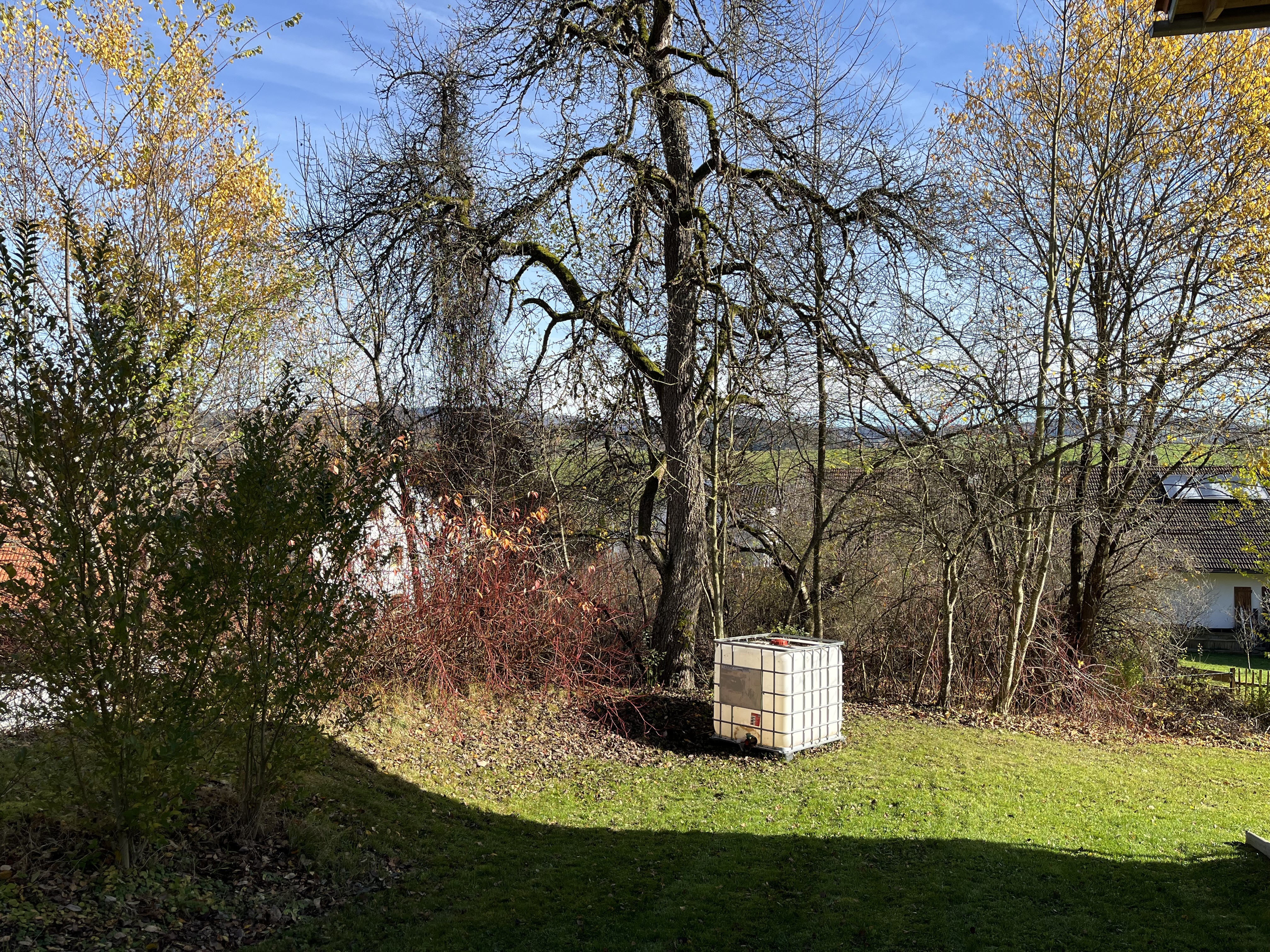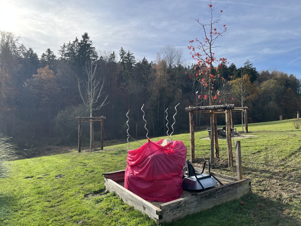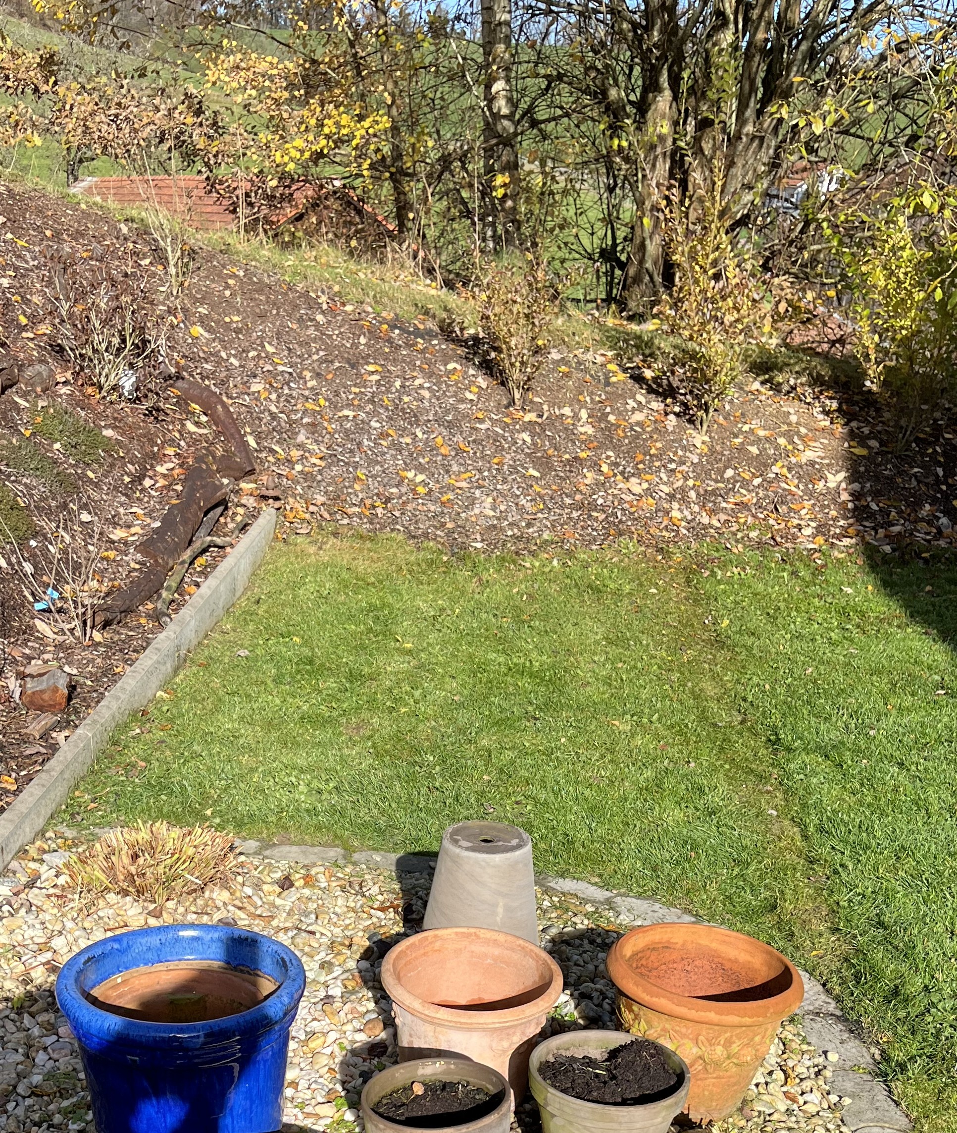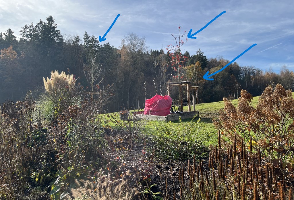 So, you have to kind of ignore the remaining sandbox in the middle. The big pink blob inside it is actually 3 potted plants I wrapped with vlies to protect them from the winter. All that will be gone next year (or maybe sometime in the winter, if my husband and I get ambitious.). And, it is this last photo, that gives you a good idea of the triangle-shaped area where we will have shade.