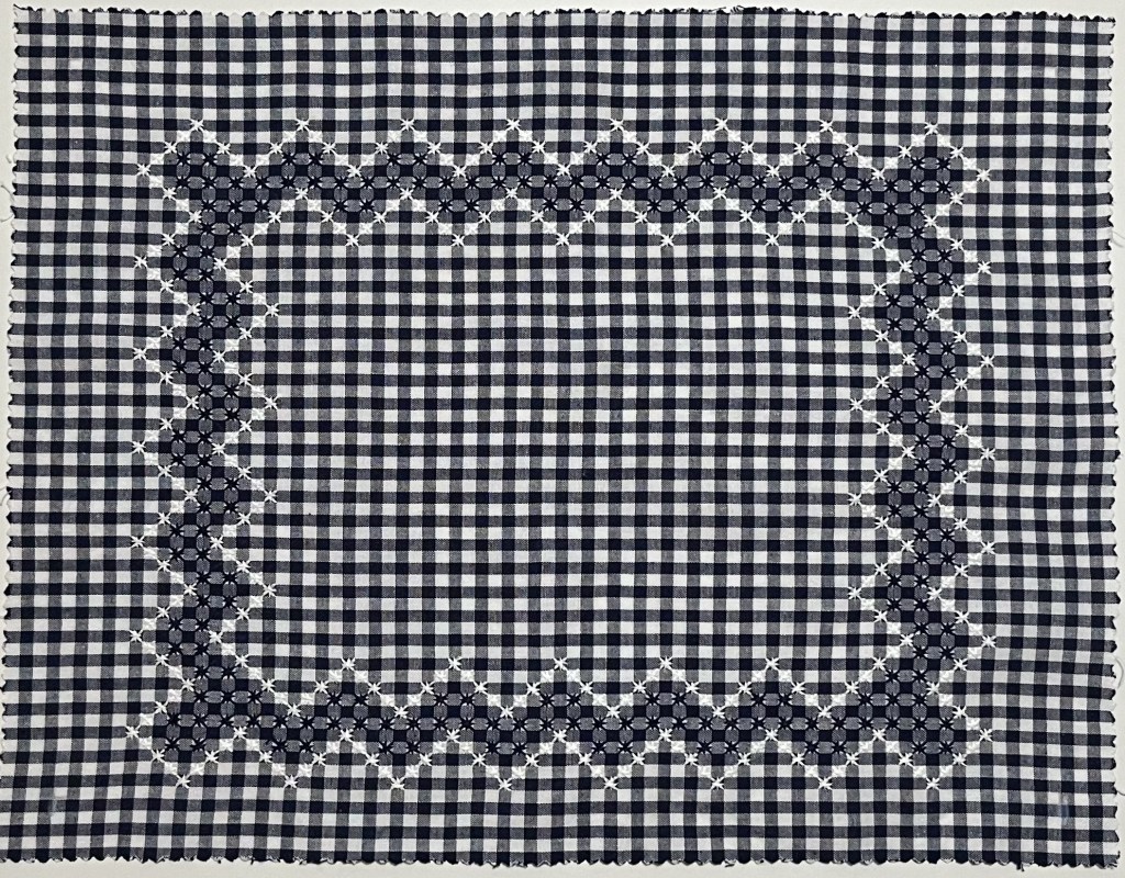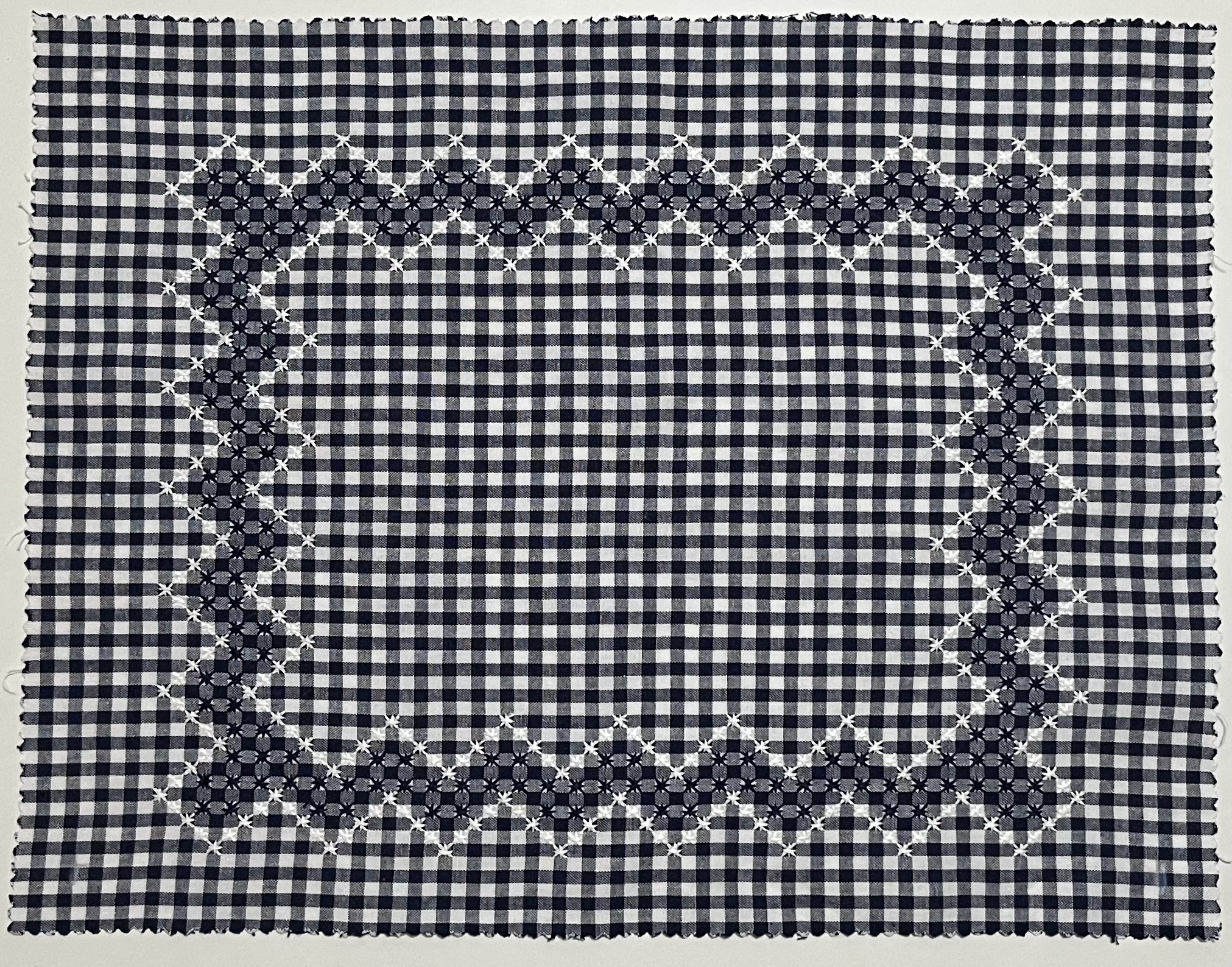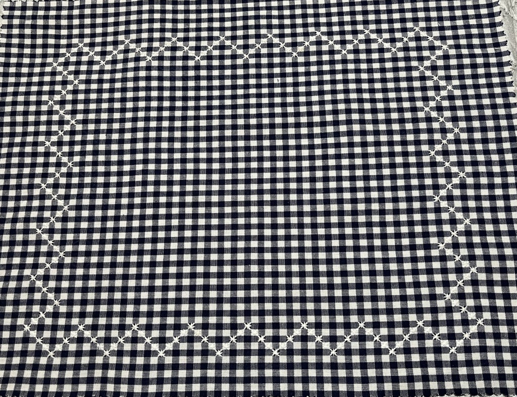 As usual, the design kind of created itself. I really like how Chicken Scratch lets you emphasize one color of the given fabric versus another. As you see in the below pictures, it looks like there is a dark-blue border but that is only because I stitched over the white squares, emphasizing the darker colors in the fabric. Had I stiched over the blue squares, it would look like a white border.