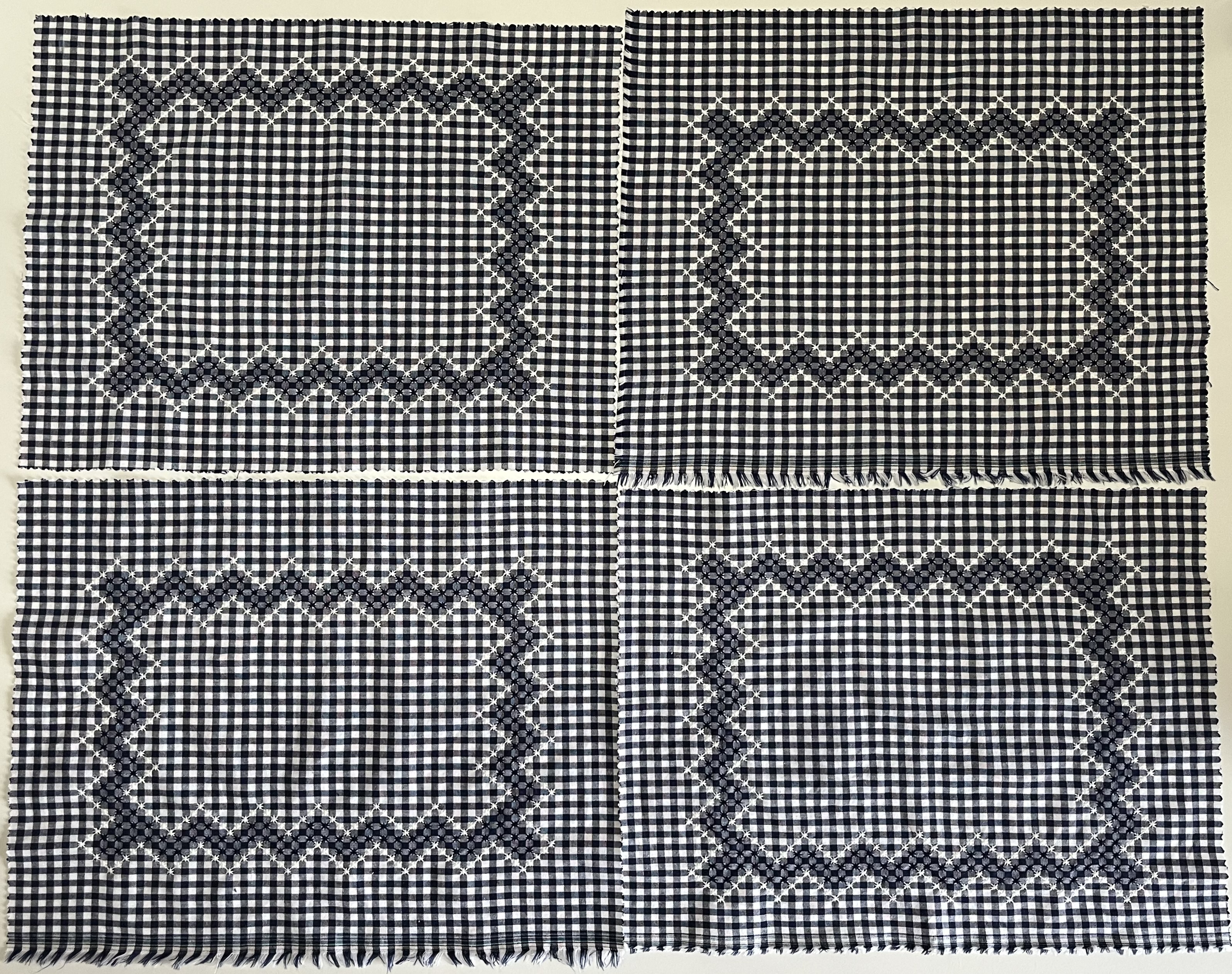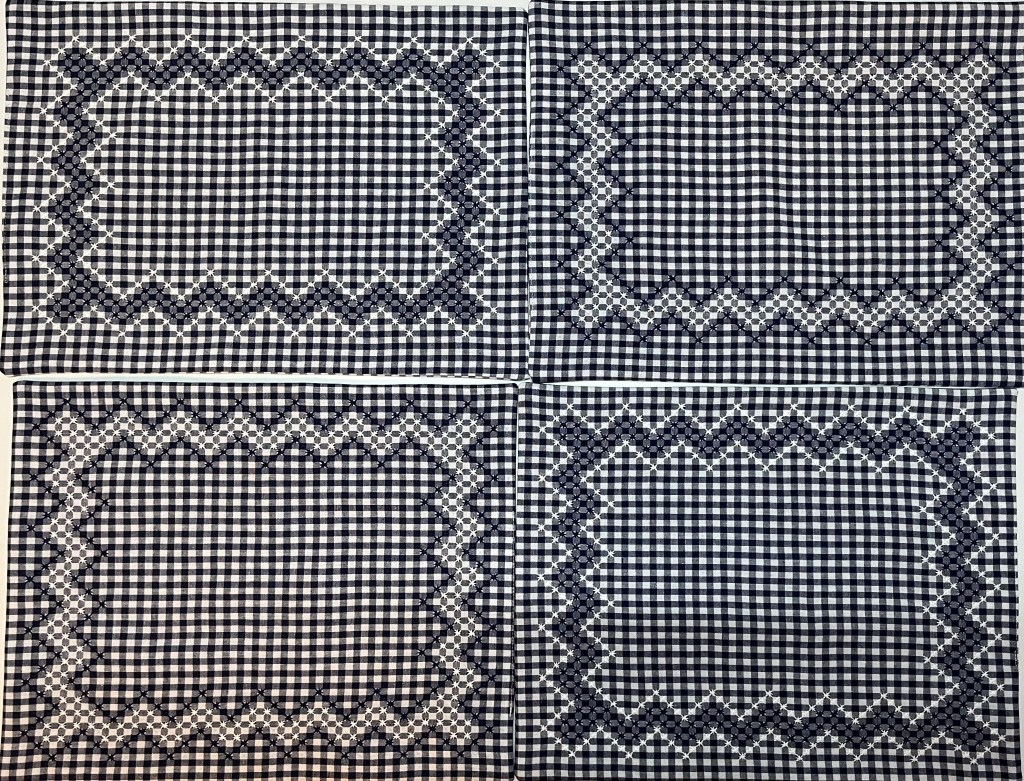 And, while all this was going on, I was also working away on those placemats. I finished emboidering the four on the front side and now have to decide what I will do with the back side. I am thinking about doing a “positive/negative” look, i.e. one side emphasizing the blue and one side emphasizing the white. I’ll have to have a think about that with my next coffee. For now, here are the four embroidered fronts: