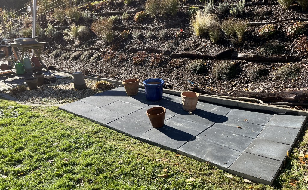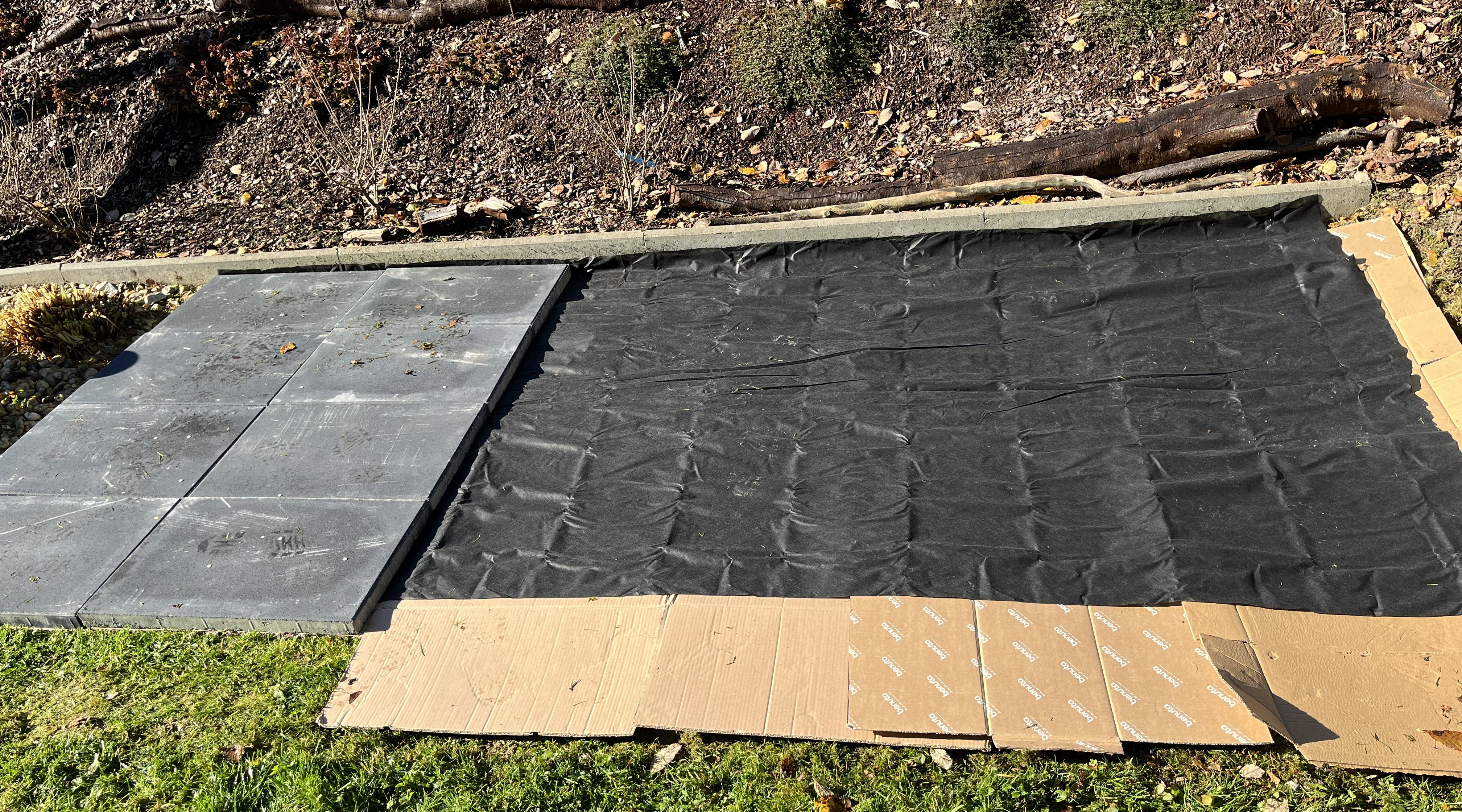 The first step will be to prepare the ground. I’ll cut the grass down as far as I can and then lay cardboard over it to stop grass and weeds from growing. Then, I will cover the cardboard with a tarp to provide a moisture barrier. On top of that, I plan to lay concrete slabs, a combination of 40×40 cm and 40×60 cm. With that, I should have a nice (hopefully) stable “flooring” for the raised beds and the tomato greenhouse.