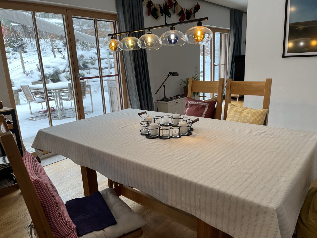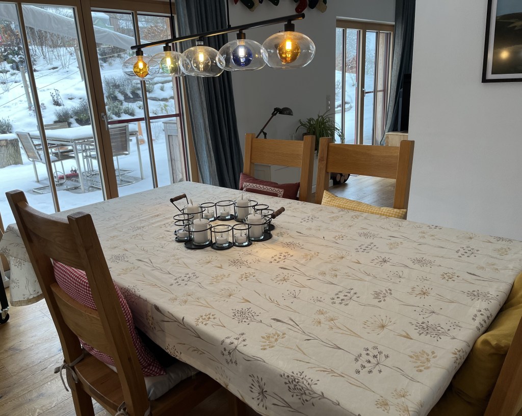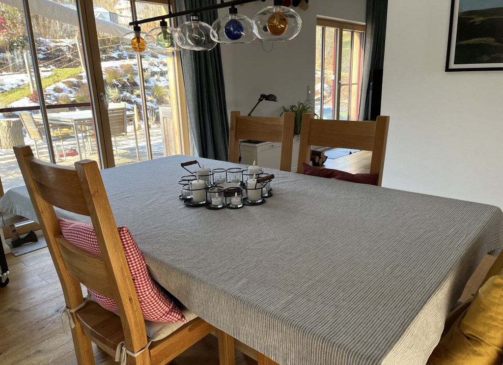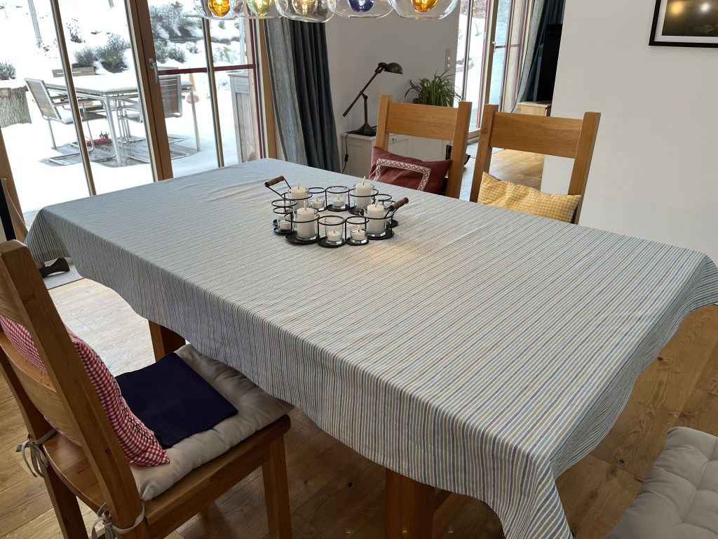 Along with baking cookies, I was busy in the atelier sewing tablecloths. Some of you may know that a few years ago our dining room table broke (was broken – the perpetrator will remain nameless ;-)). It was a round table and I had sewn tablecloths to fit it. Our new table was rectangular and it took me until this year to get around to finding suitable fabric and sewing tablecloths to fit the rectangle.