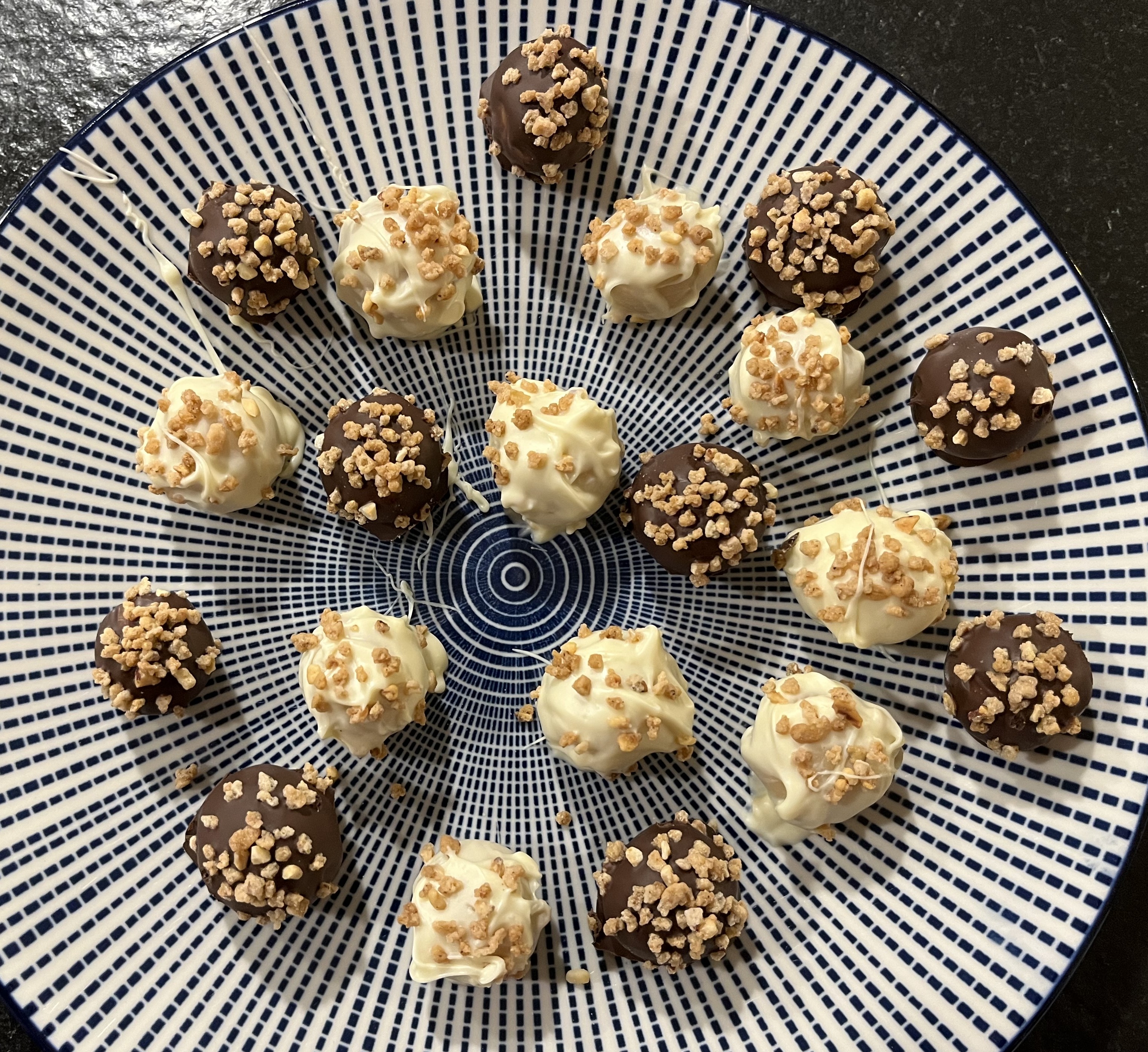 The 6 types include: Choco-Krossies with roasted almonds and cornflakes covered chocolate, Rum-Chocolate bars, Cranberry-Vanilla “Kipferl”, White Chocolate-Lime, Earl-Grey-Citrus, and finally Marzipan balls covered in white and dark chocolate with haselnuts. Yum yum!