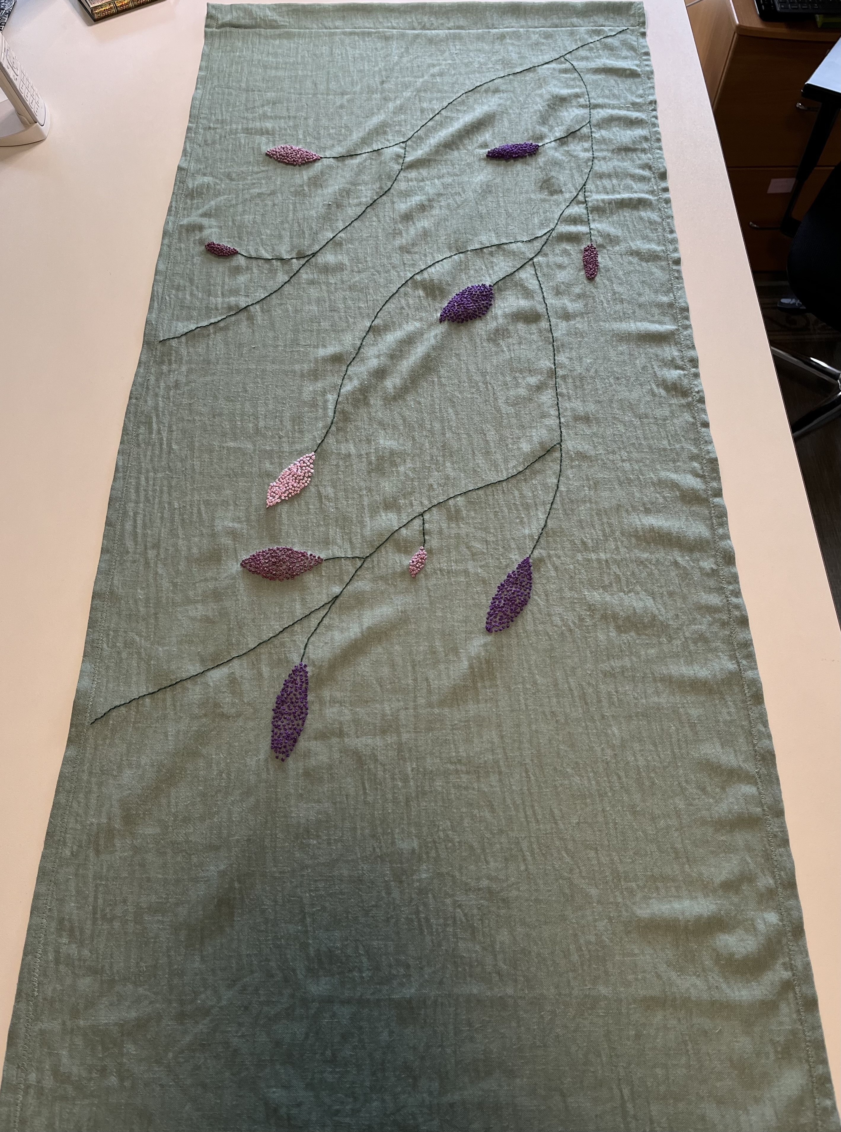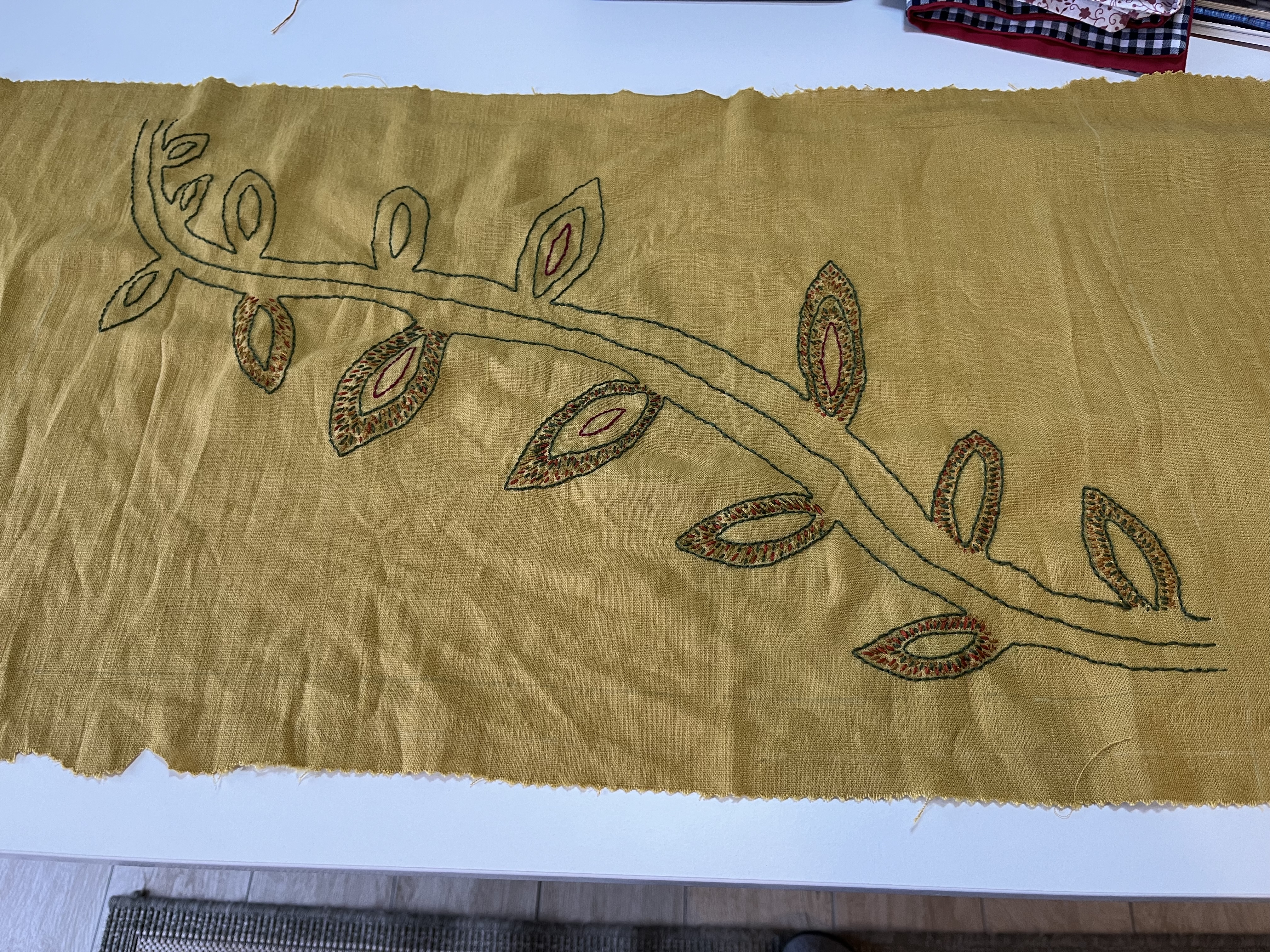 That’s a lot of table runner and not a lot of embroidery! I was so focused on the corners that I completely missed all that empty space in between! Back to the drawing board for me. The task now is to come up with a design for the middle section, something to tie everything together (to paraphrase “The Big Lebowski” ;-)). Yup, that’s what I’ll be working on next.
