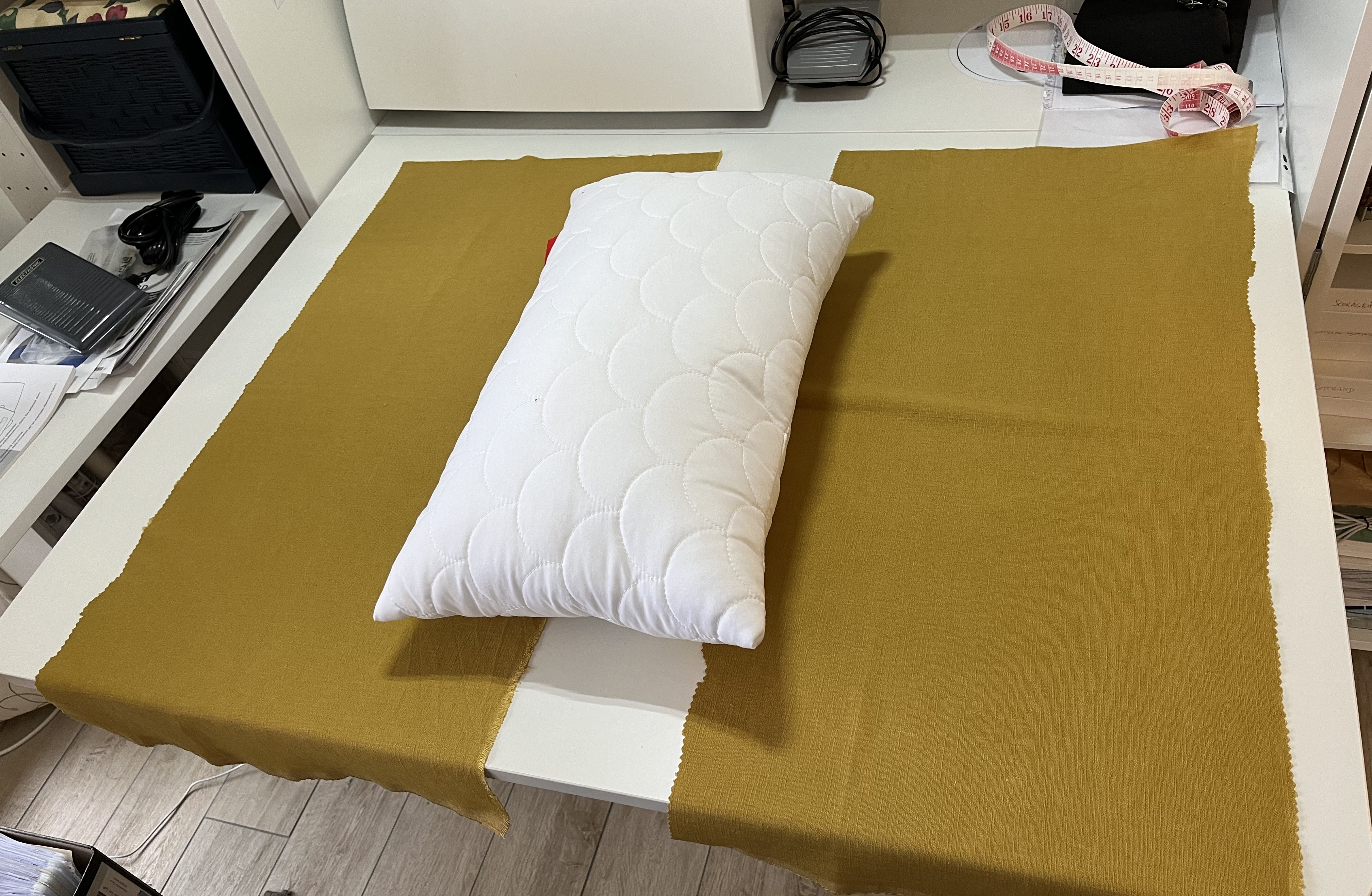 The pillow measures roughly 50 cm x 30 cm and will hopefully add a nice splash of gold between the other pillows. I wanted to pick up the gold-color in the blanket draped over the back of the couch.