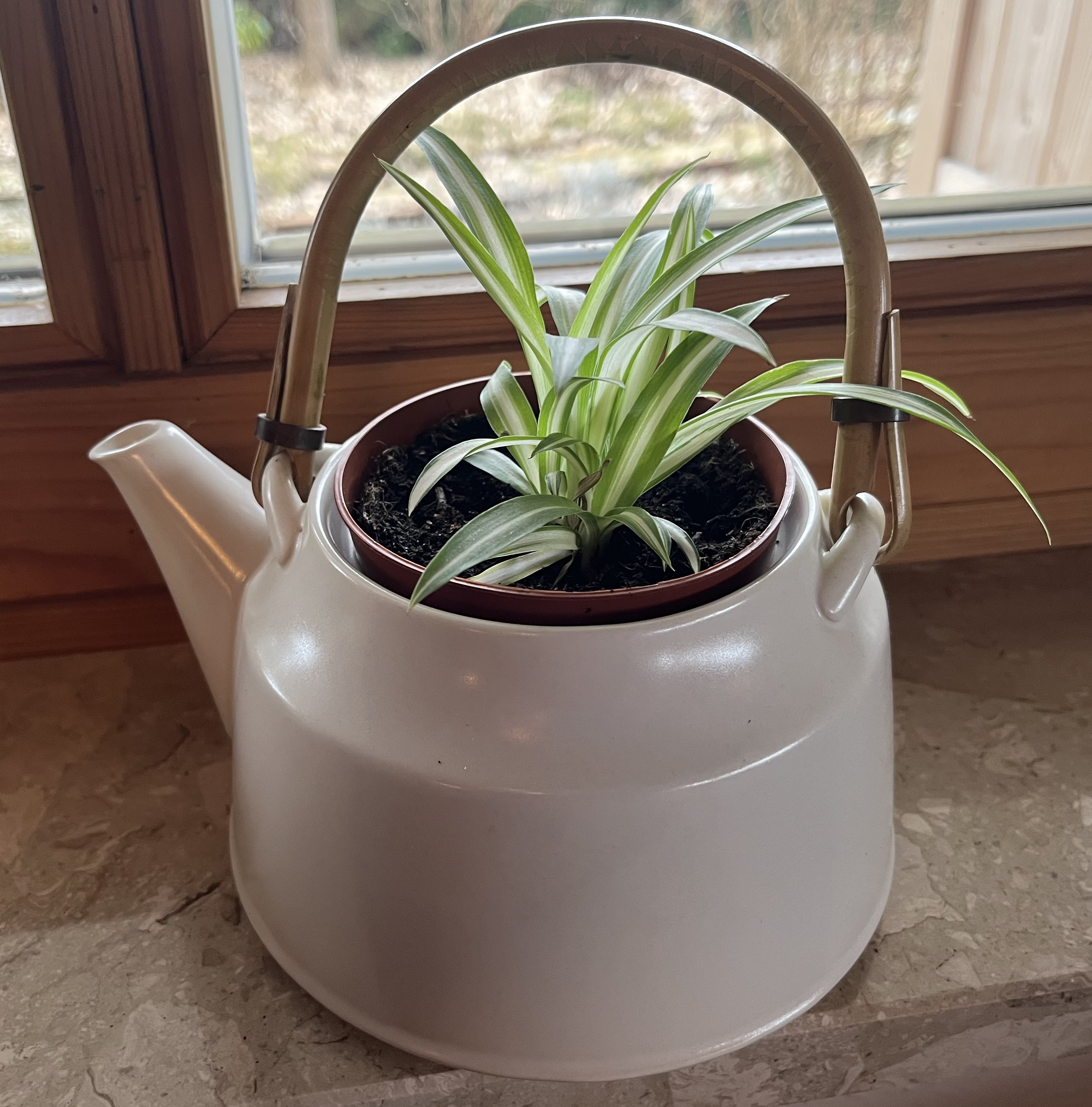 Our spide plant – we’ll call it the “Mother Plant” – was getting really pot-bound and kept pumping out spider babies. I had to get kind of creative and remembered I had an old japanese tea pot lying around; it broke a couple of years ago and I tried fixing it but it was never the same. I never threw it out and repurposed it as a flower pot! The baby spider plant has to grow into it and I think it will look really cute once it fills out.