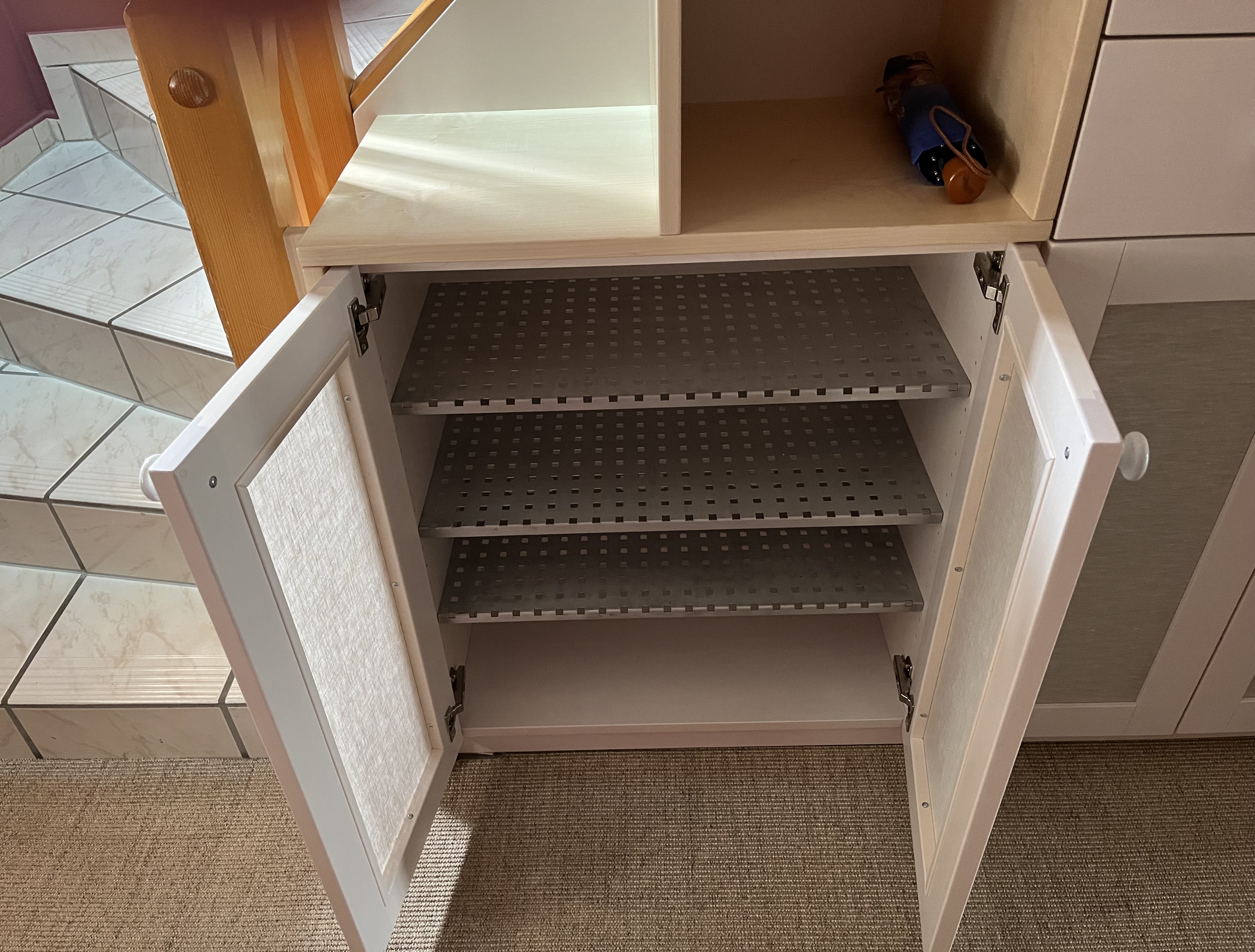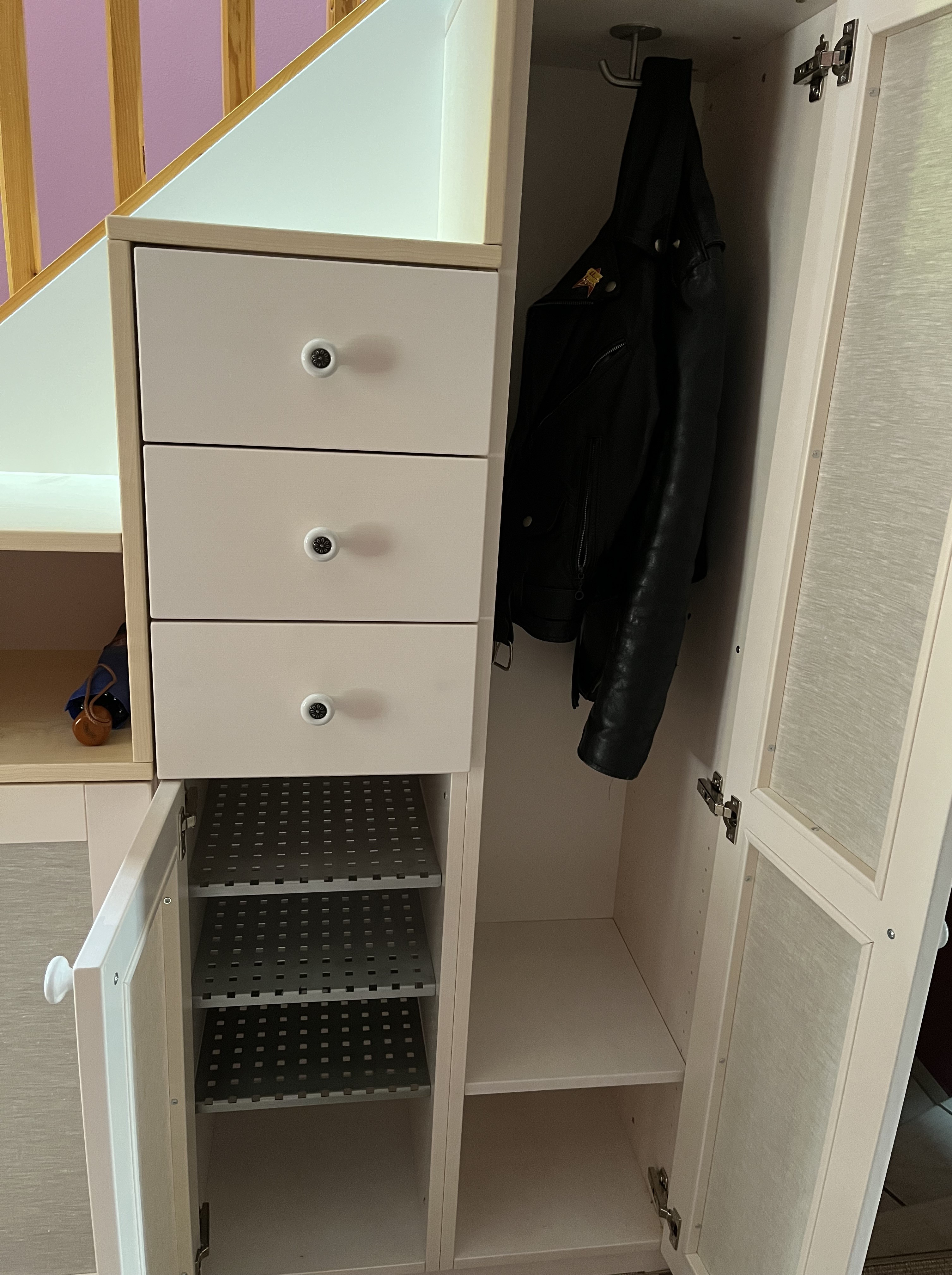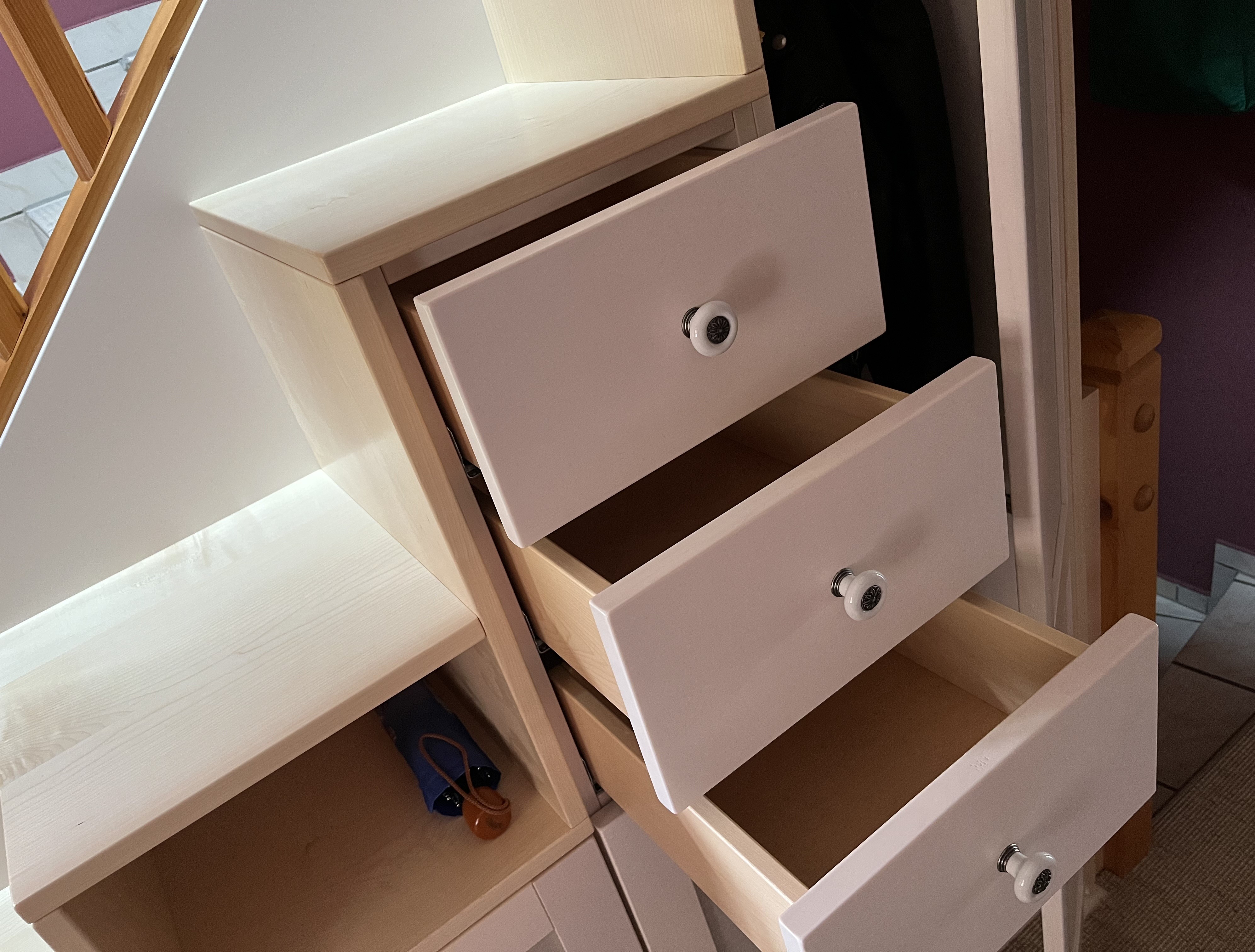 And, thanks to this space-saving way of storing fabric, 8 clear-plastic drawers, which are now stored under the pull-down desk, were no longer needed.