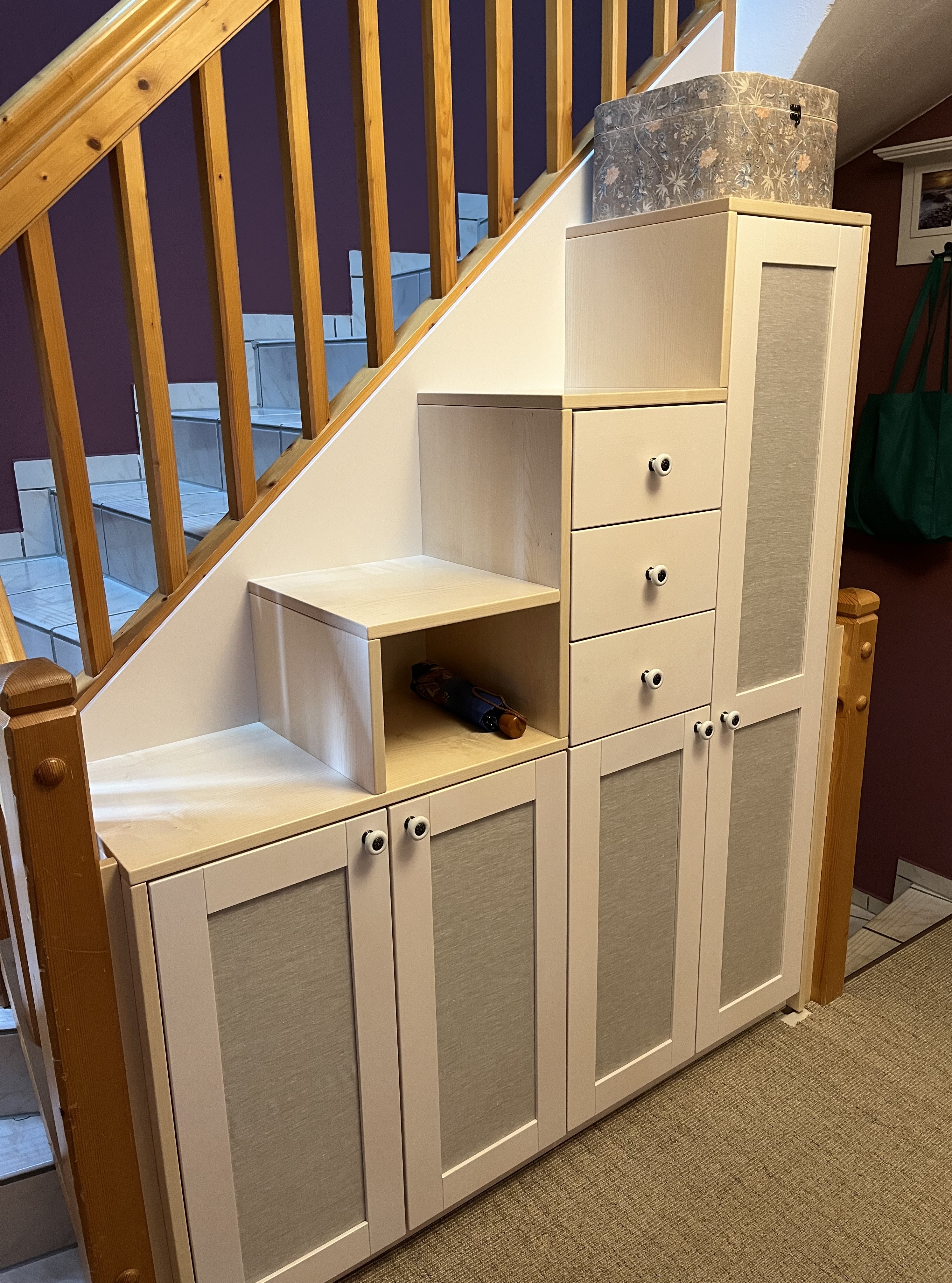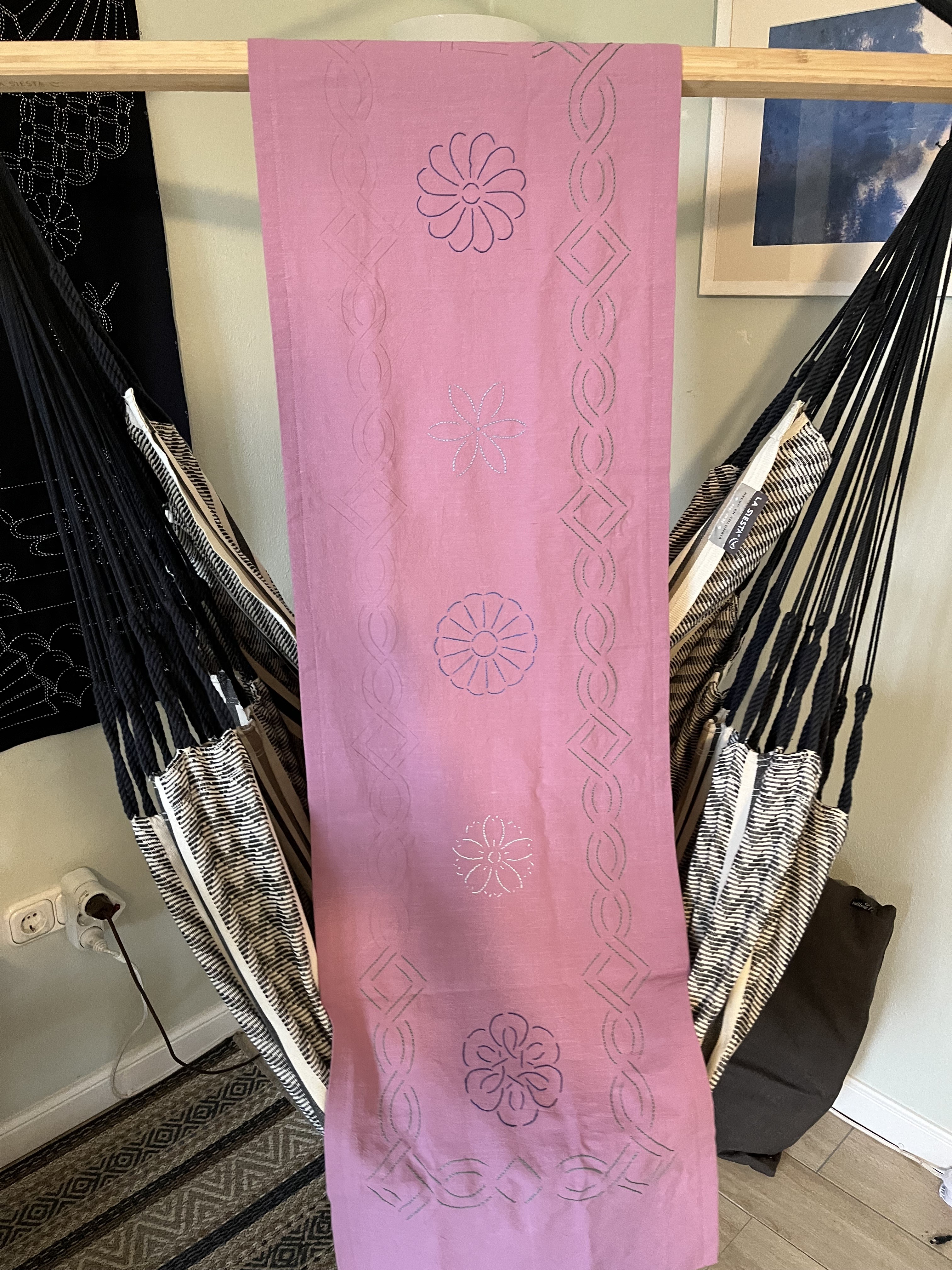 Now it is time to get working in the atelier! I found the two projects I had started before the move (the sashiko panel and the summer blouse). I think I’ll focus on the sashiko panel first. In the entrance hall, there is one wall I’ve been “saving” as the final destination for the panel.