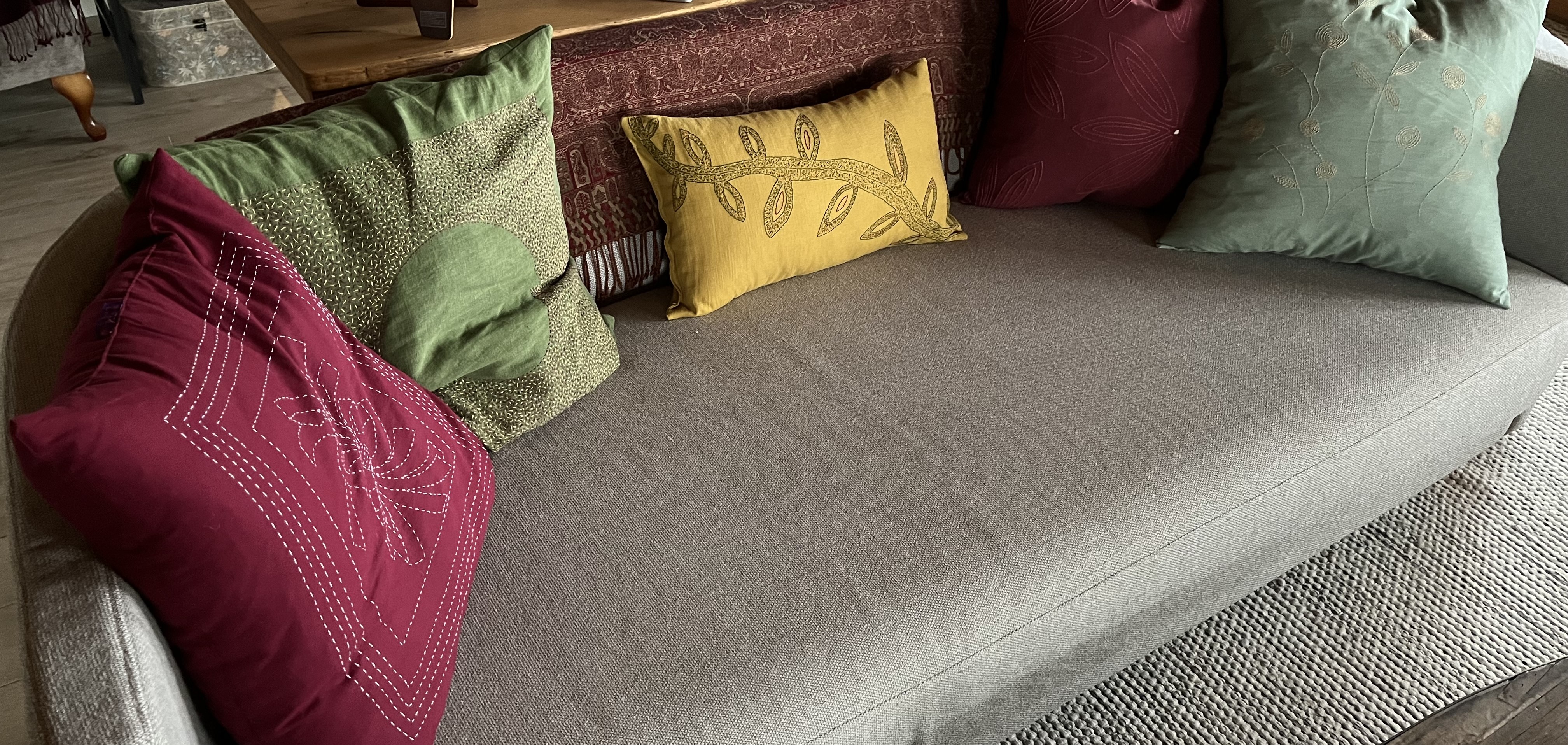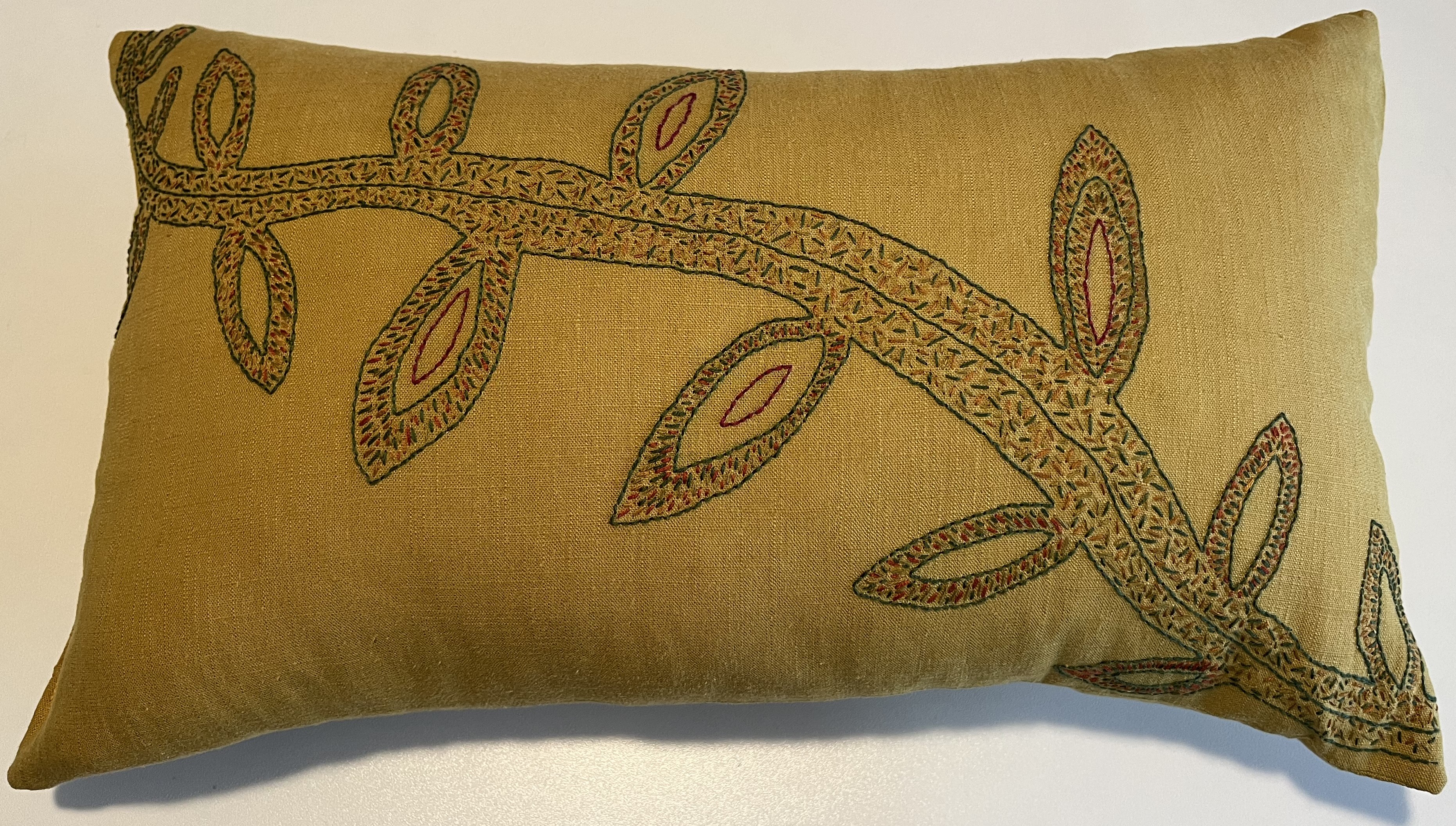 I had just enough gold-colored fabric (from a previous pillow project) to cover a half-pillow (dimensions are roughly 30x 50 cm). The goal was to use the colors already present in the other couch pillows (mostly rust red, green, gold, orange, greenish-yellow) as the basis for this one.