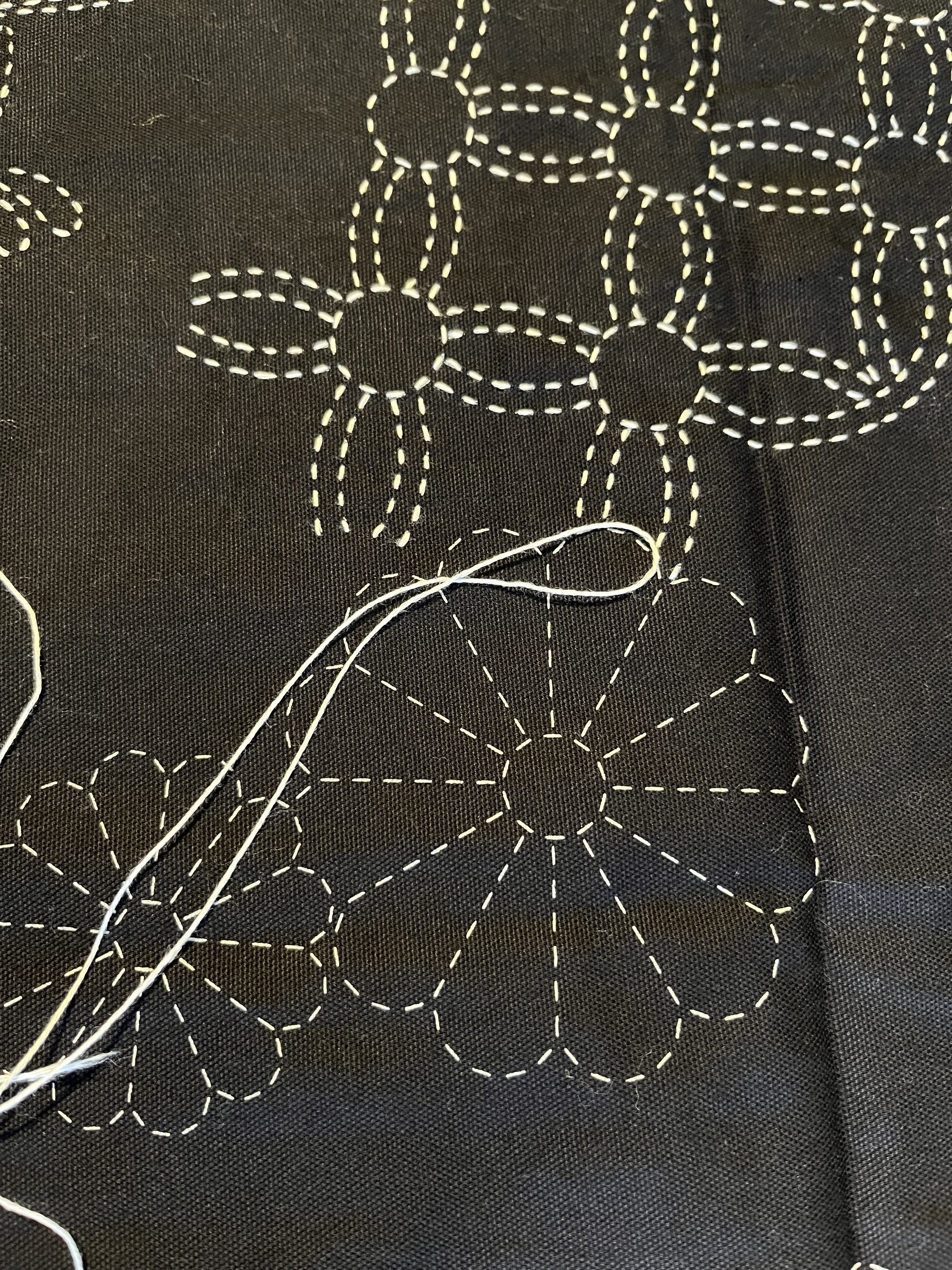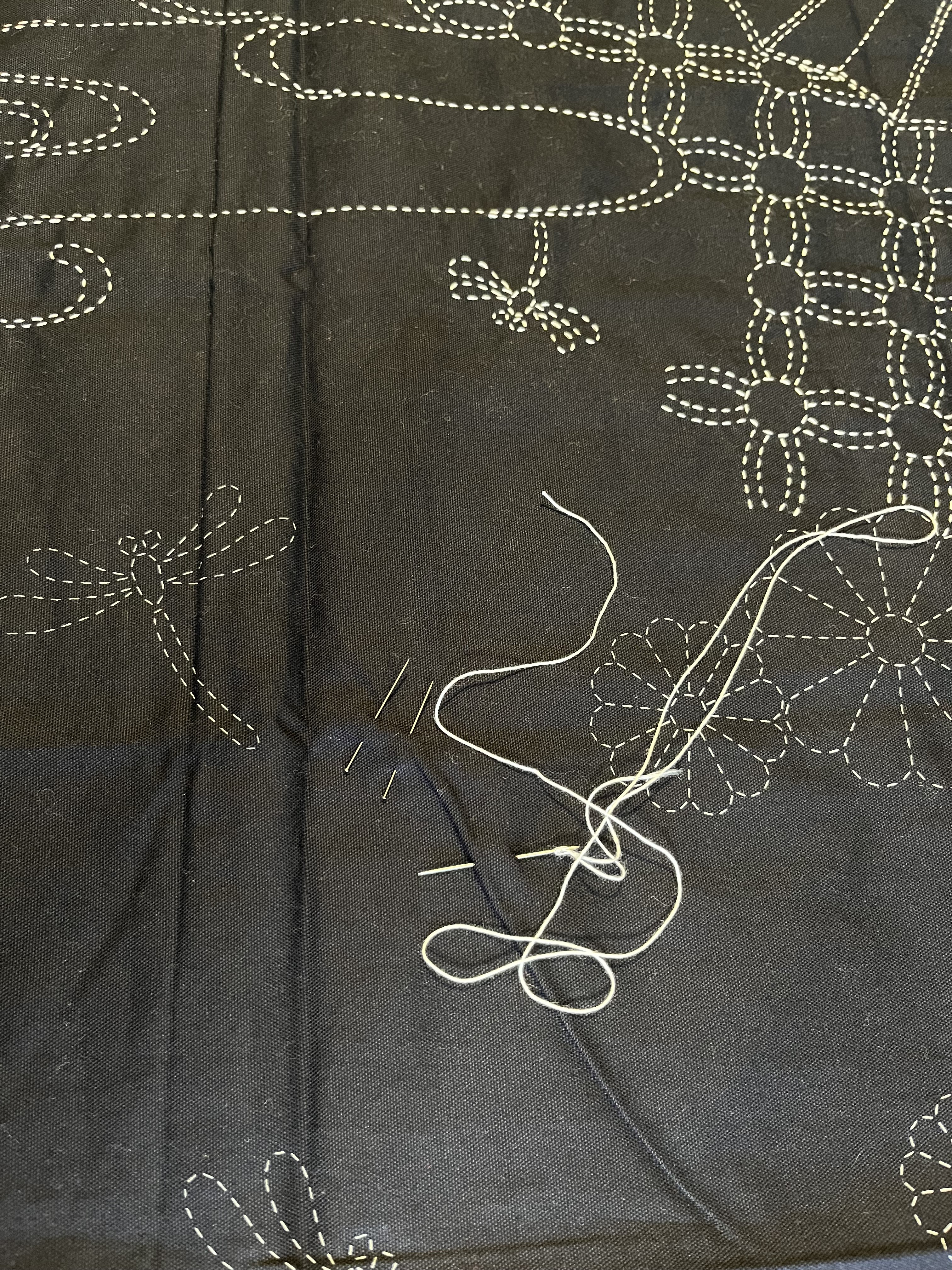 As a result, not much has been going on. In the atelier, I finally finished the second sashiko panel and realized immediately that I had made a thought-error. See if you can spot the problem in the photos below: