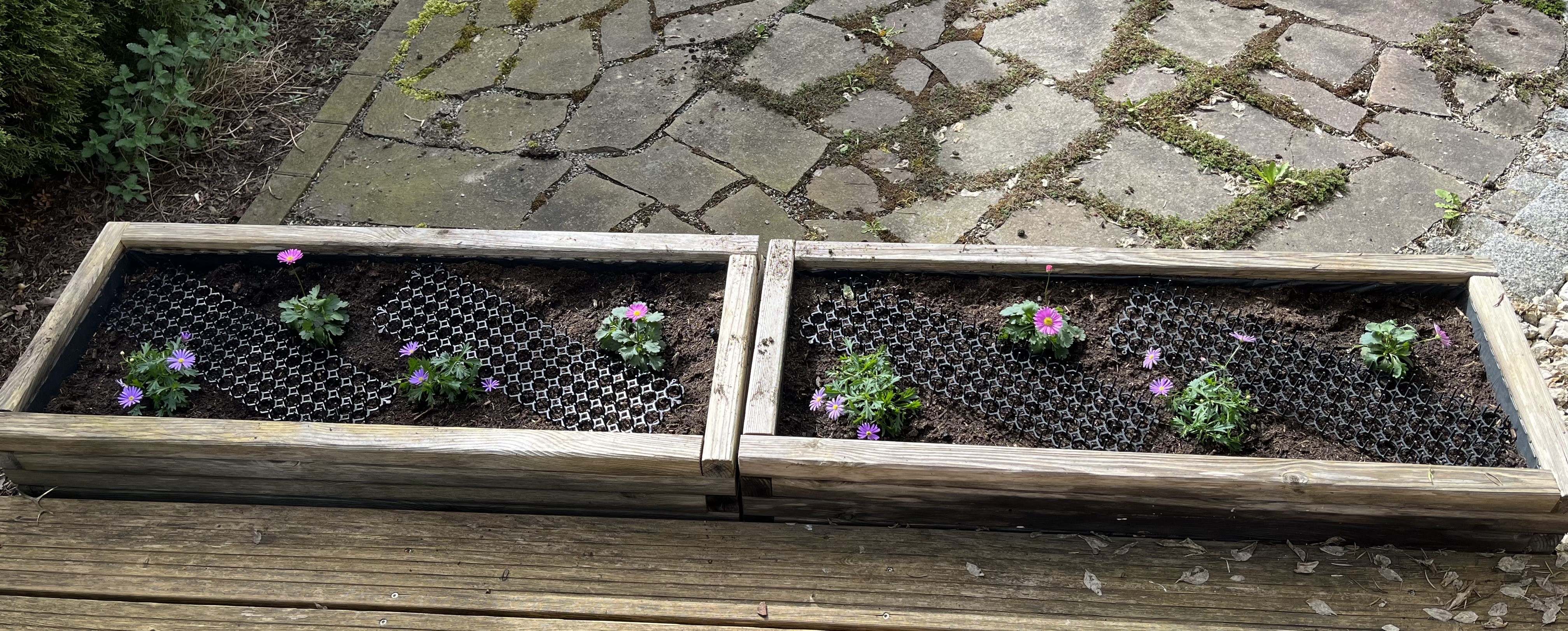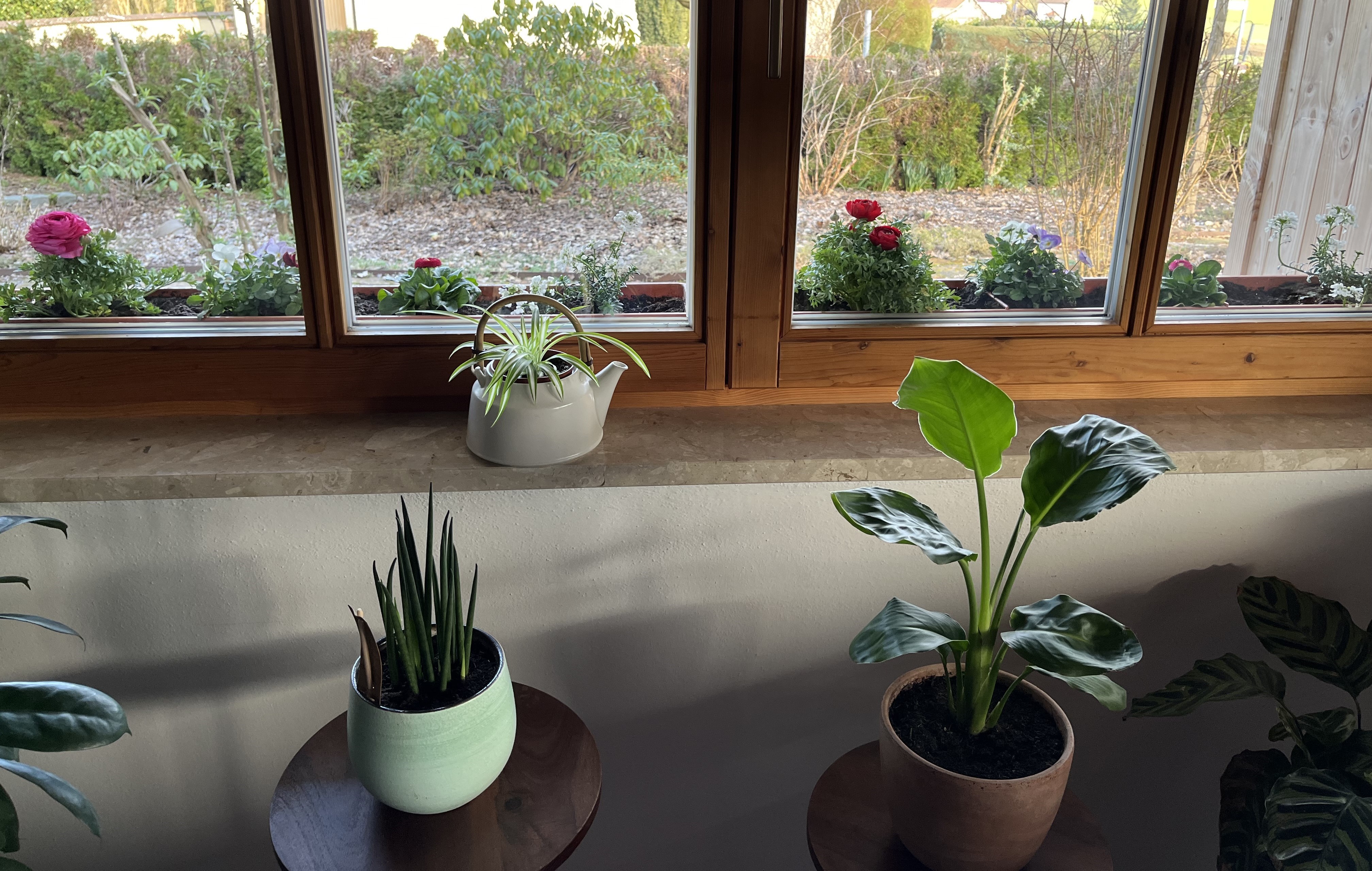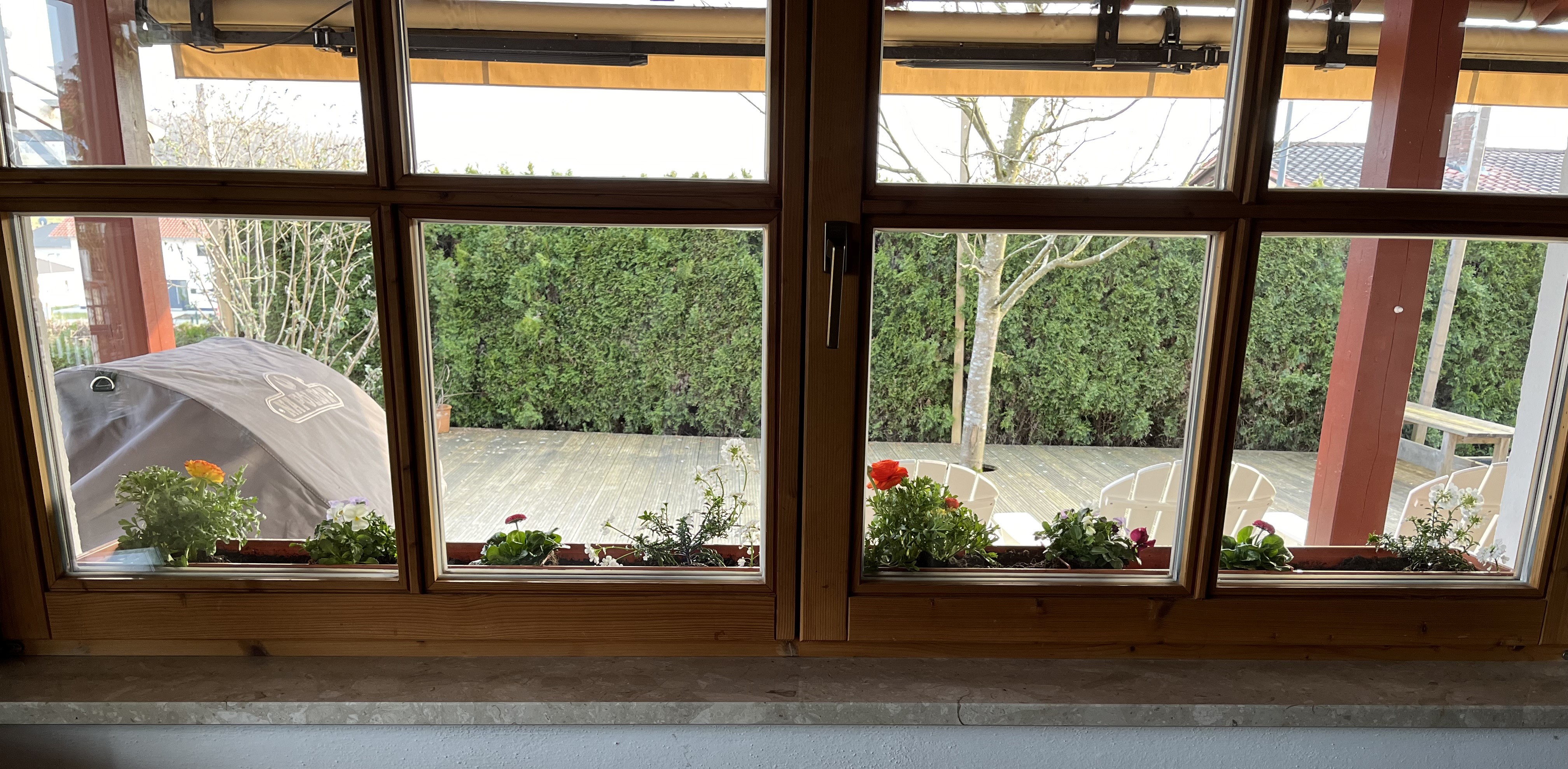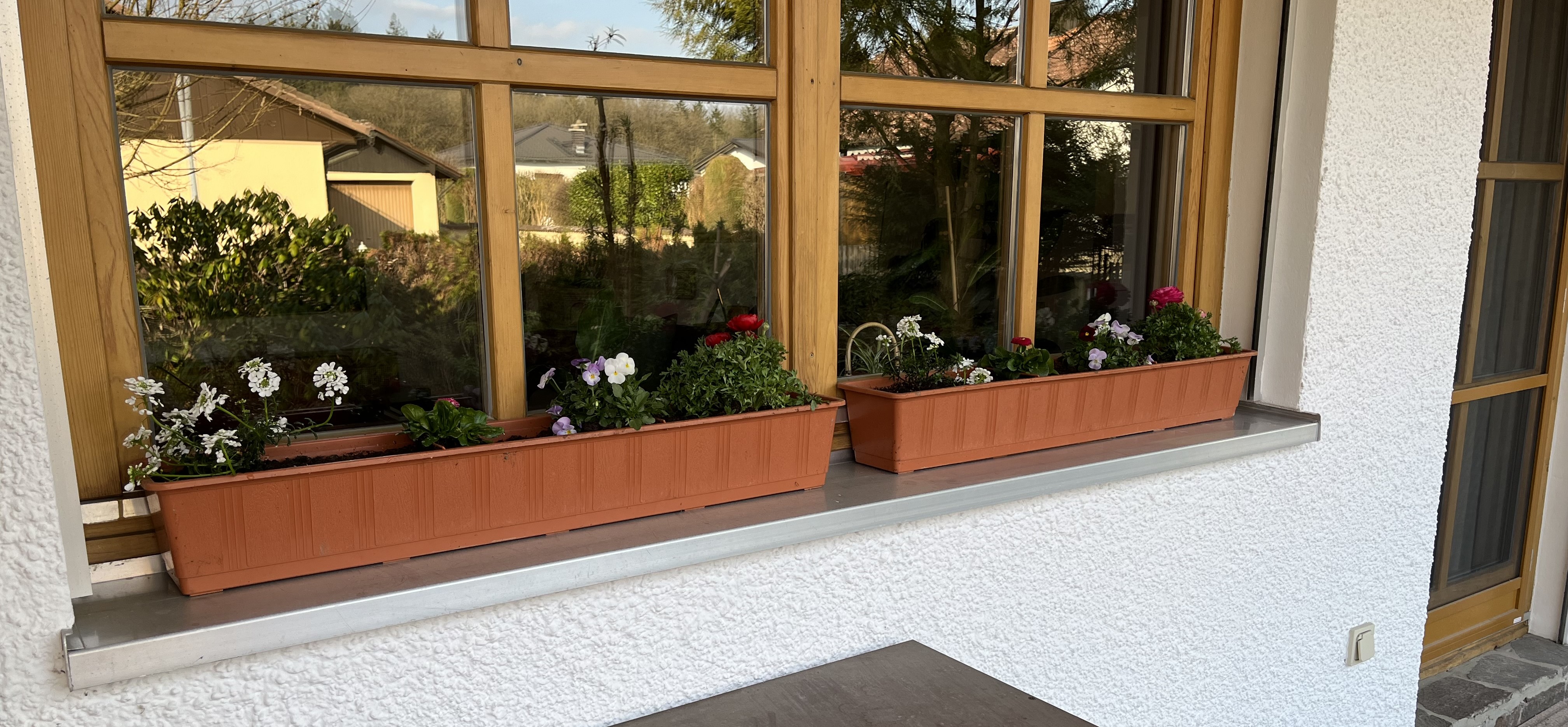 We really enjoy the plants in the living room and now, when we extend our look to the outside, the pop of color just adds even more joy! It is probably hard to identify the plants; in the flower boxes I planted: Viola cornuta, Bellis perennis, Ranunculus, and Gysophilia paniculata. (I use botannical names because common names can be misleading, especially from region to region or country to country)