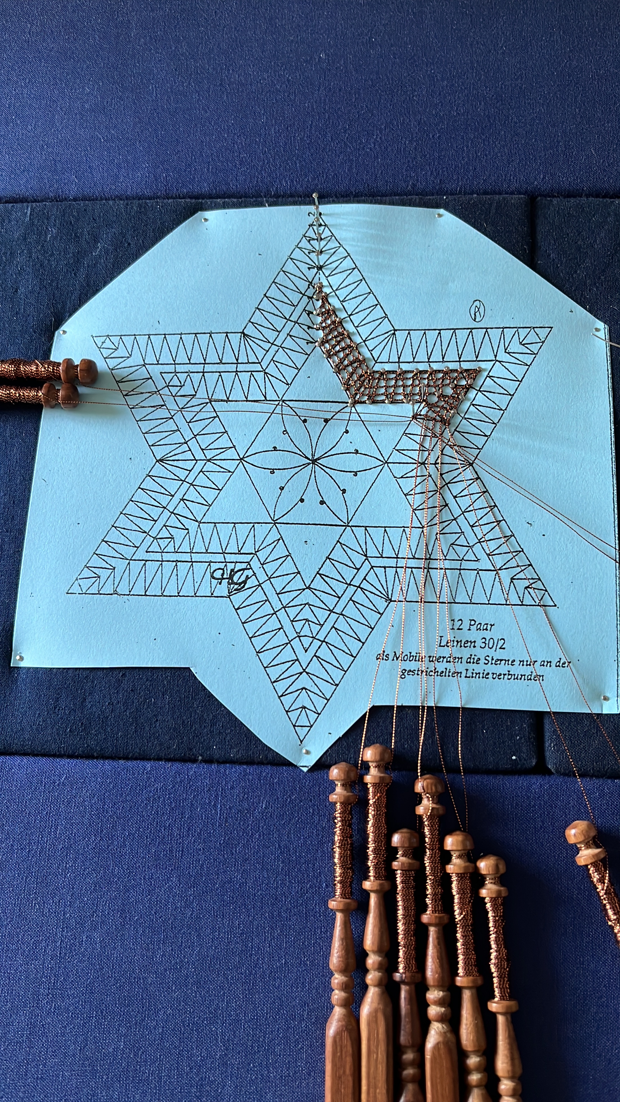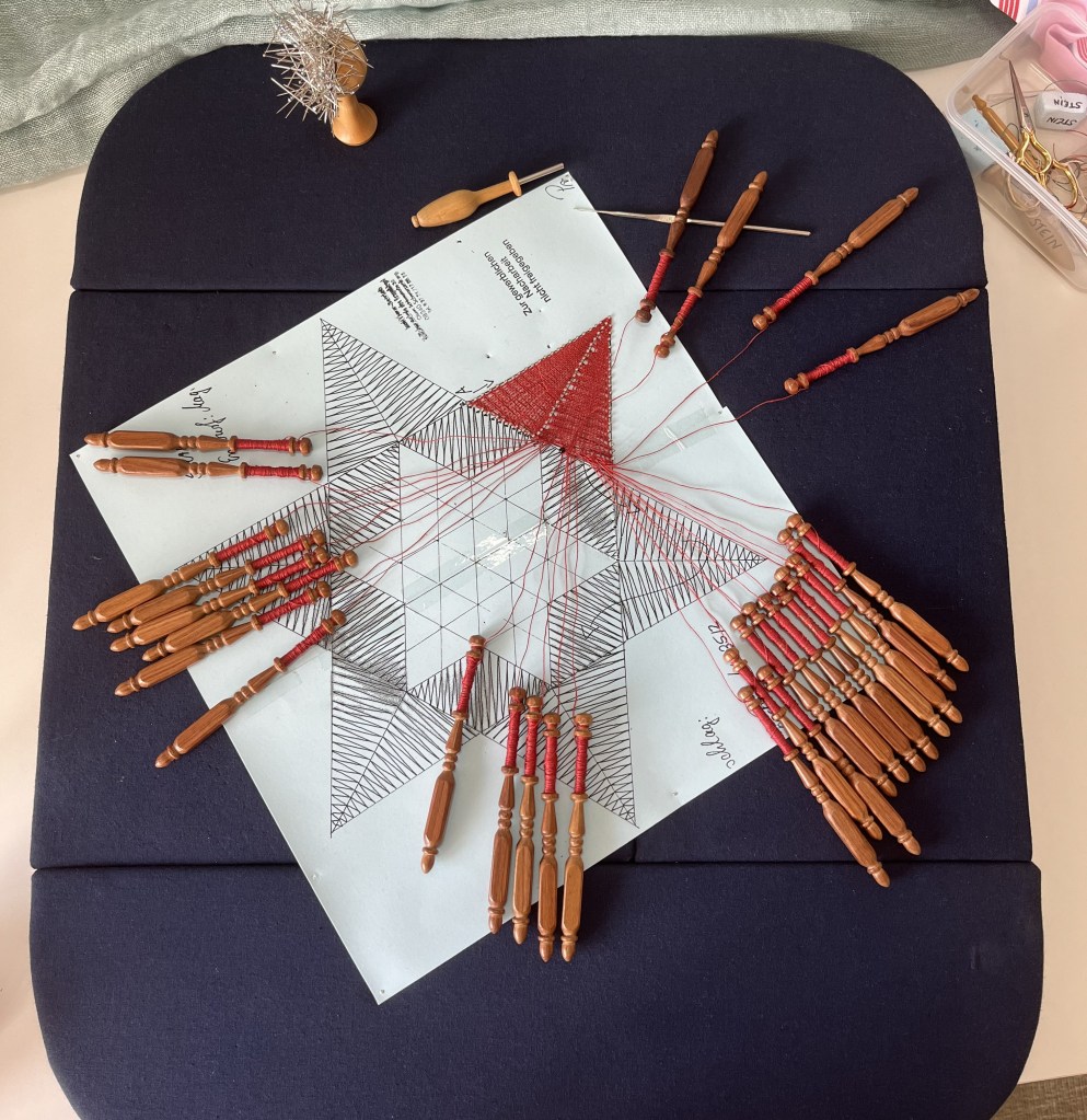It combines the linen-stitch, half-stitch, and plaiting (or braiding) for the middle. It is relatively easy with only 14 pairs. But still, there are some “watch-outs” to keep in mind. For instance, when transitioning from the linen-stitch to the half-stitch … which is exactly what this picture shows. The point of the star is complete and now it is time to transition to the middle section, where half-stitch comes into play. Cross your fingers that all goes well! It’s been a while.