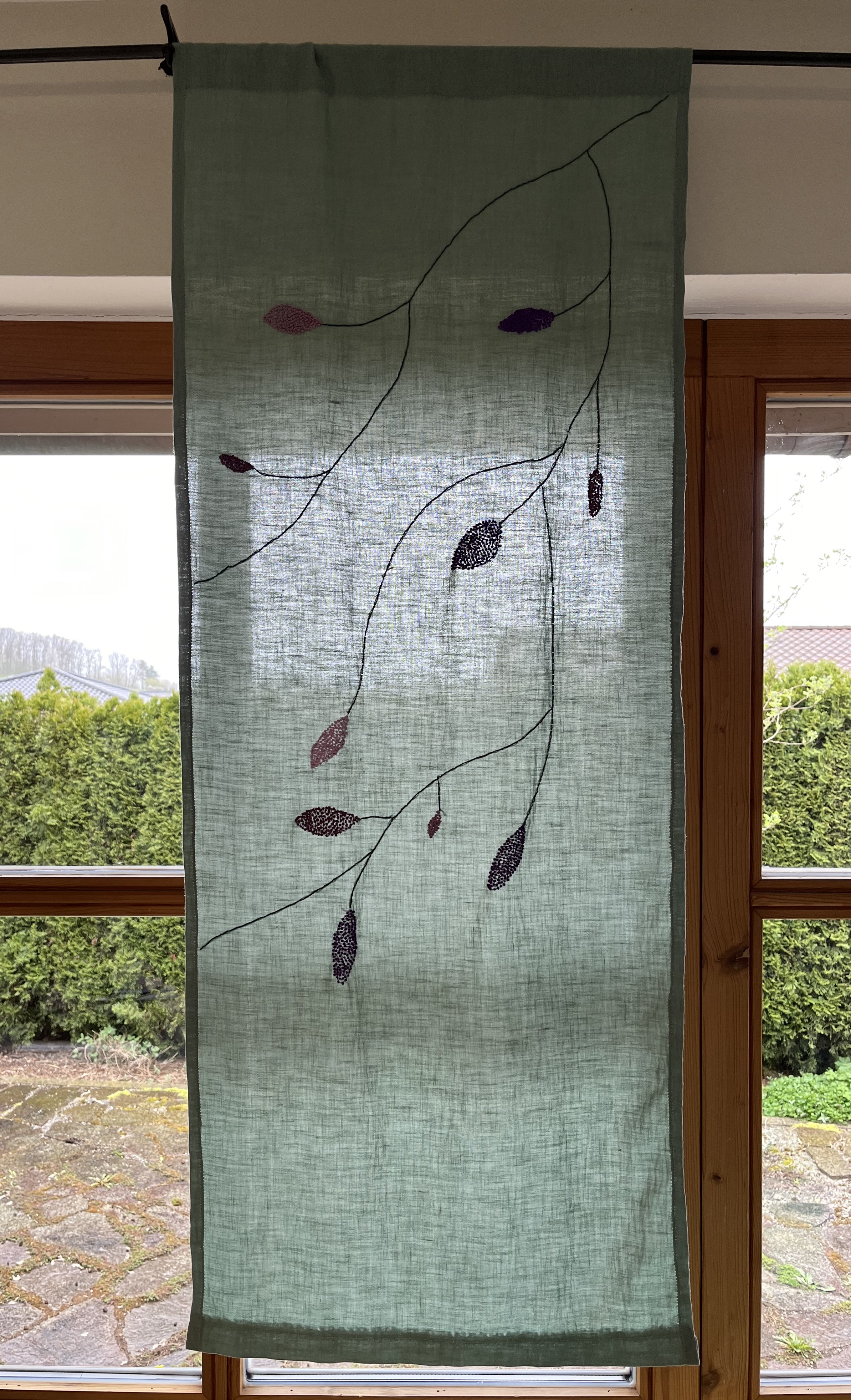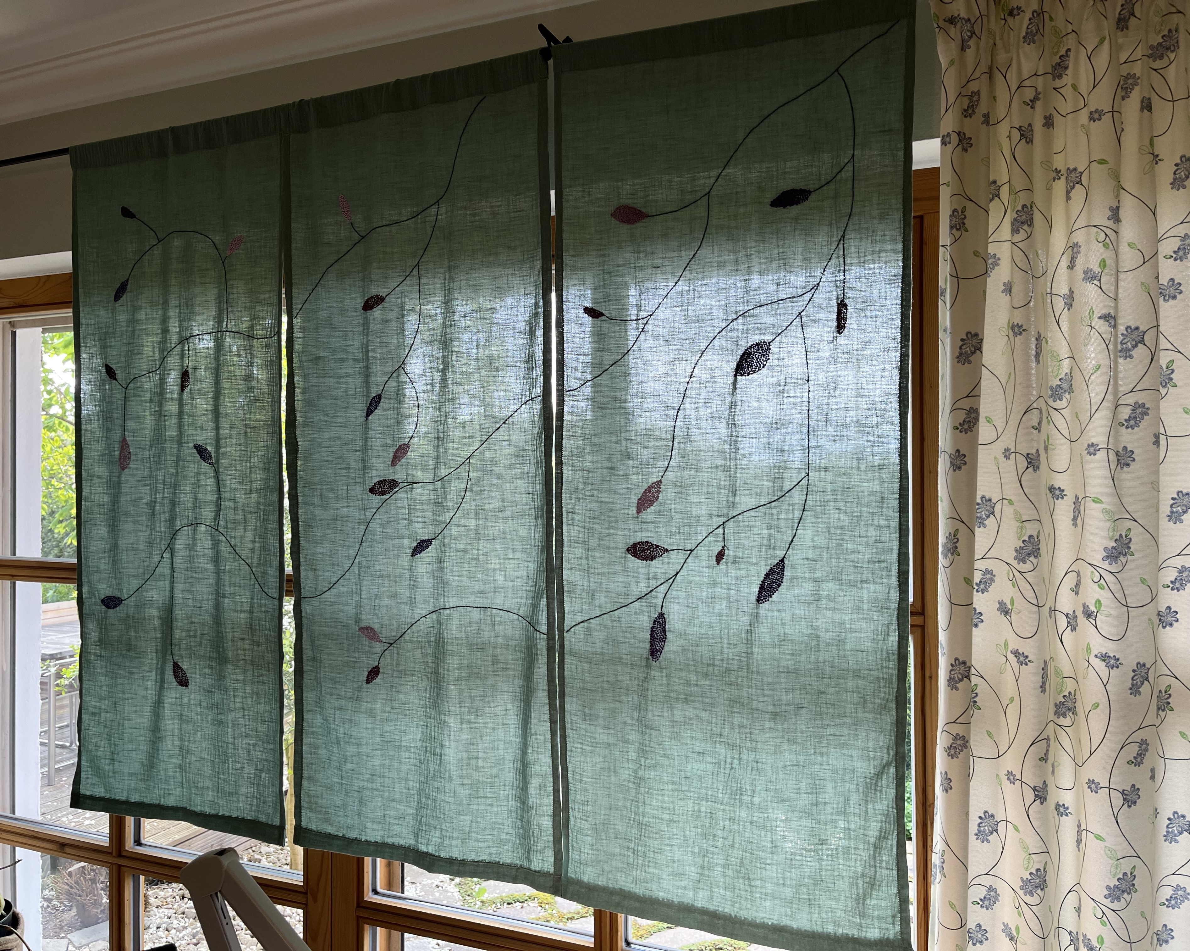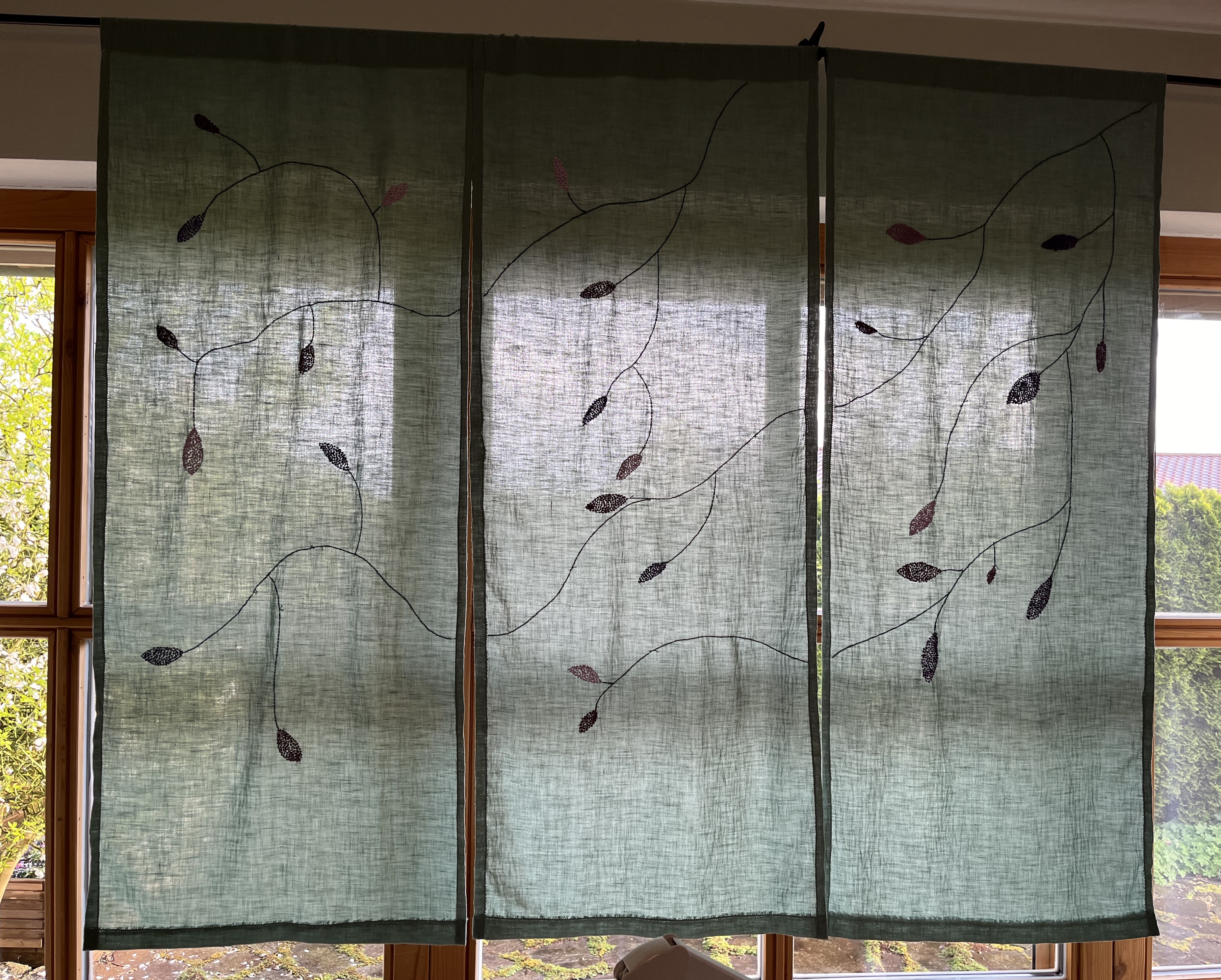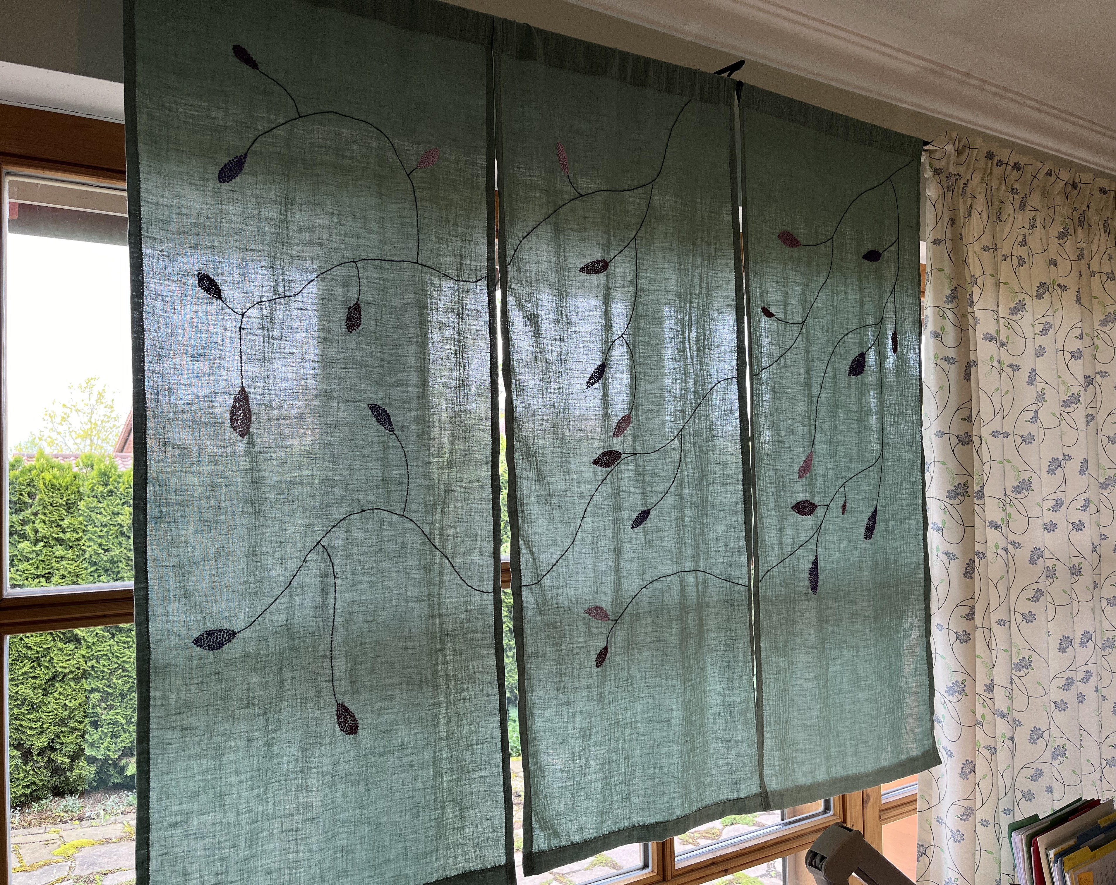 So, since the weather has been so unbelievably uninviting, I had the perfect excuse to focus on indoor activities. I finished embroidering the three curtain panels for the atelier and they turned out pretty good! Have a look …