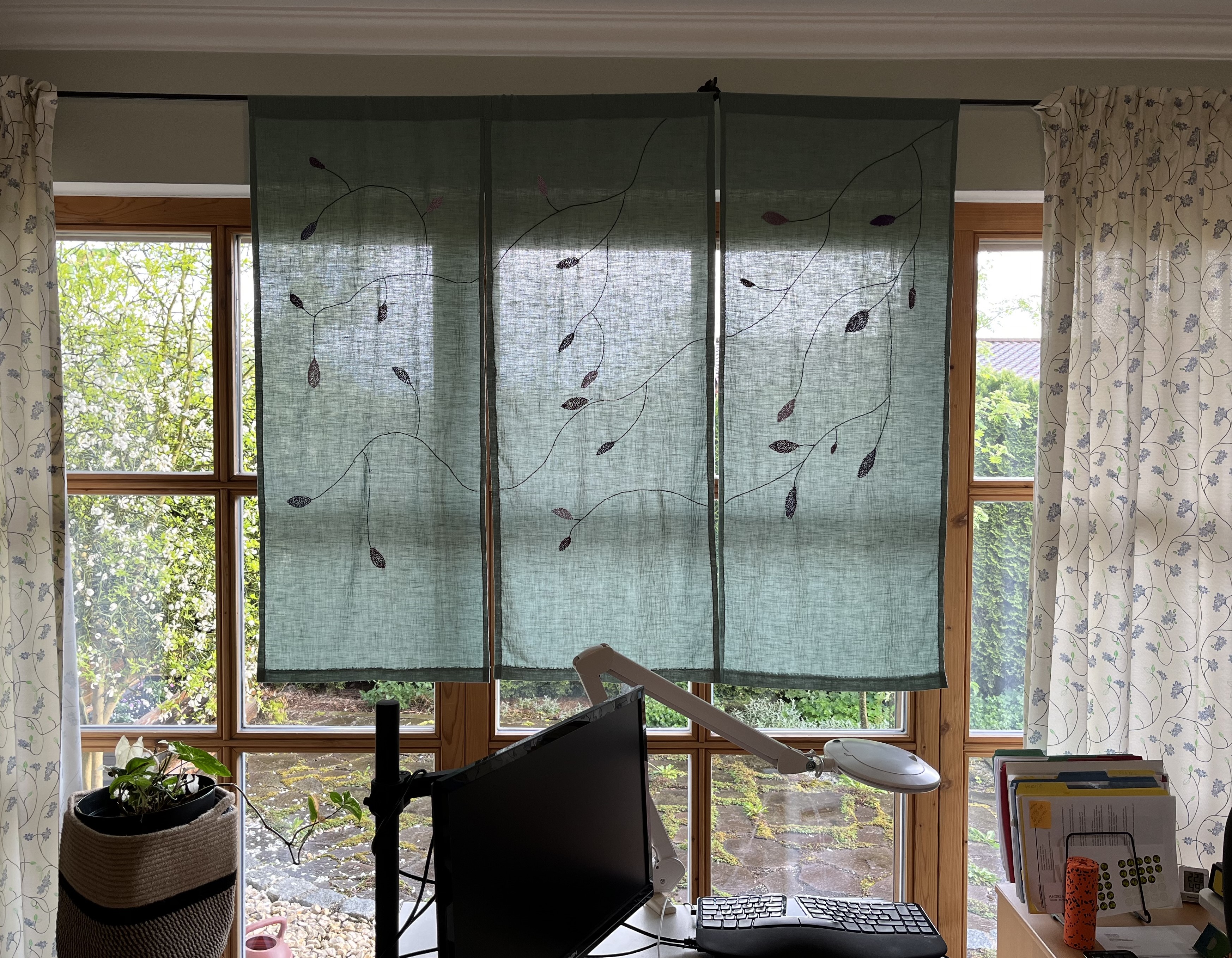 As the weeks go by, the sun is changing its position in the sky. The atelier gets great morning sun but it hits the desk just at the wrong angle, which blinds me when working at the pc. But, I have the perfect solution for this: one of the panels I embroidered!!! So, I put it up this morning and it works really well – it lets the sun in but I am not blinded by it!