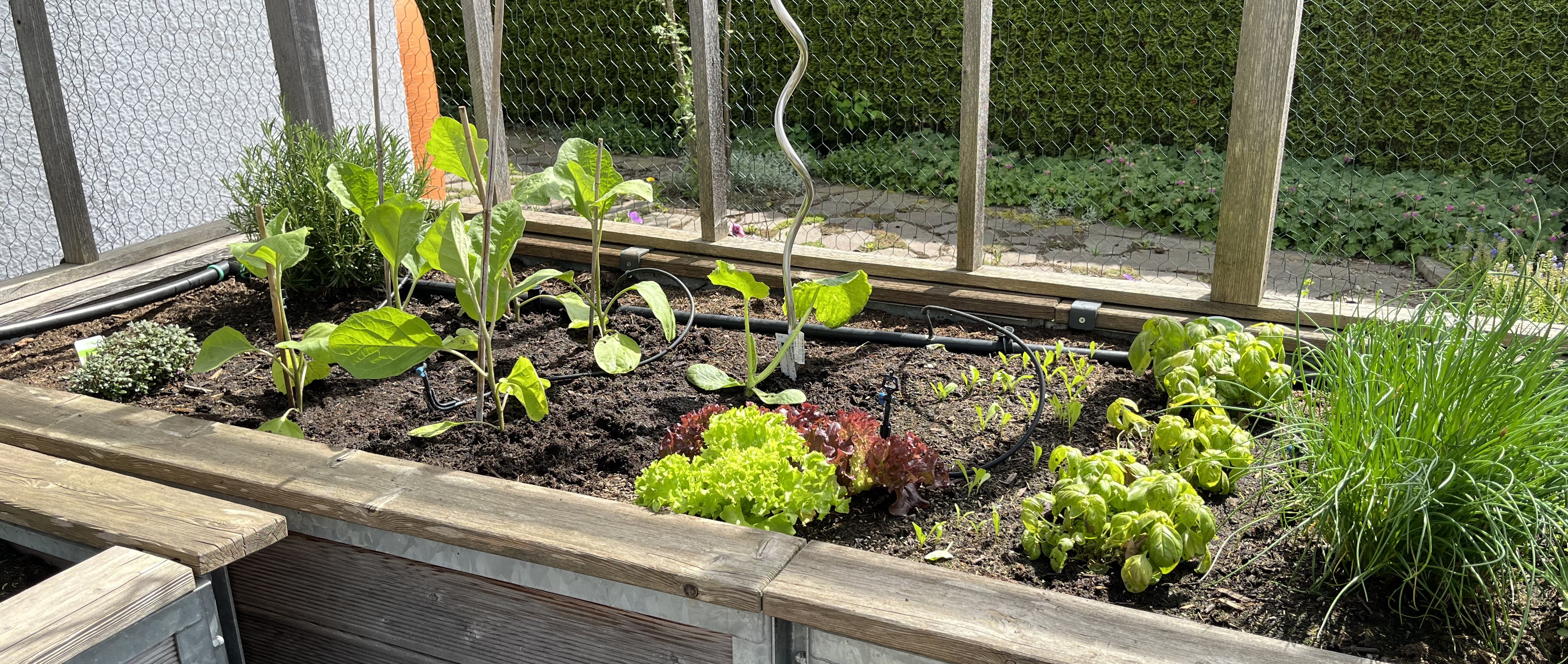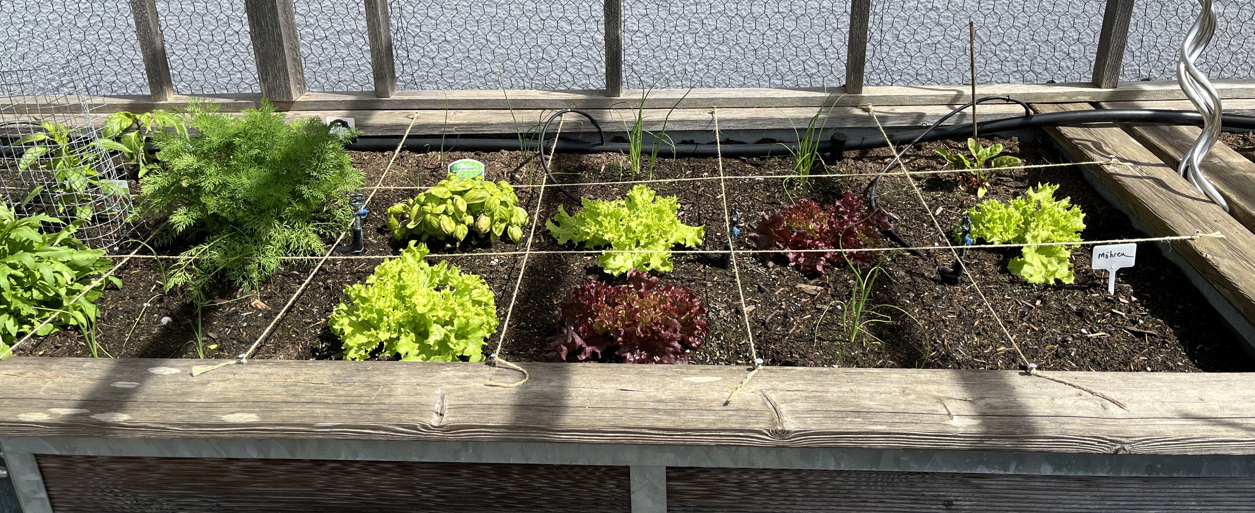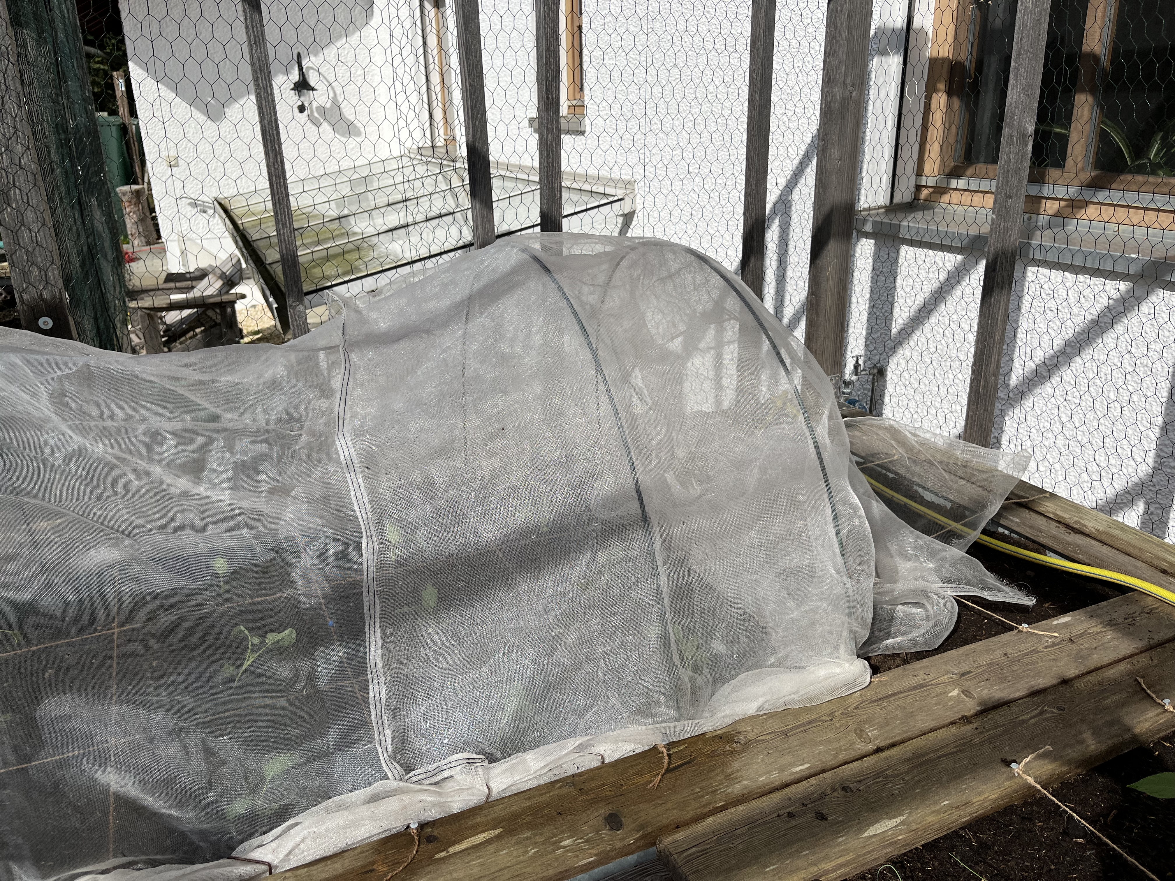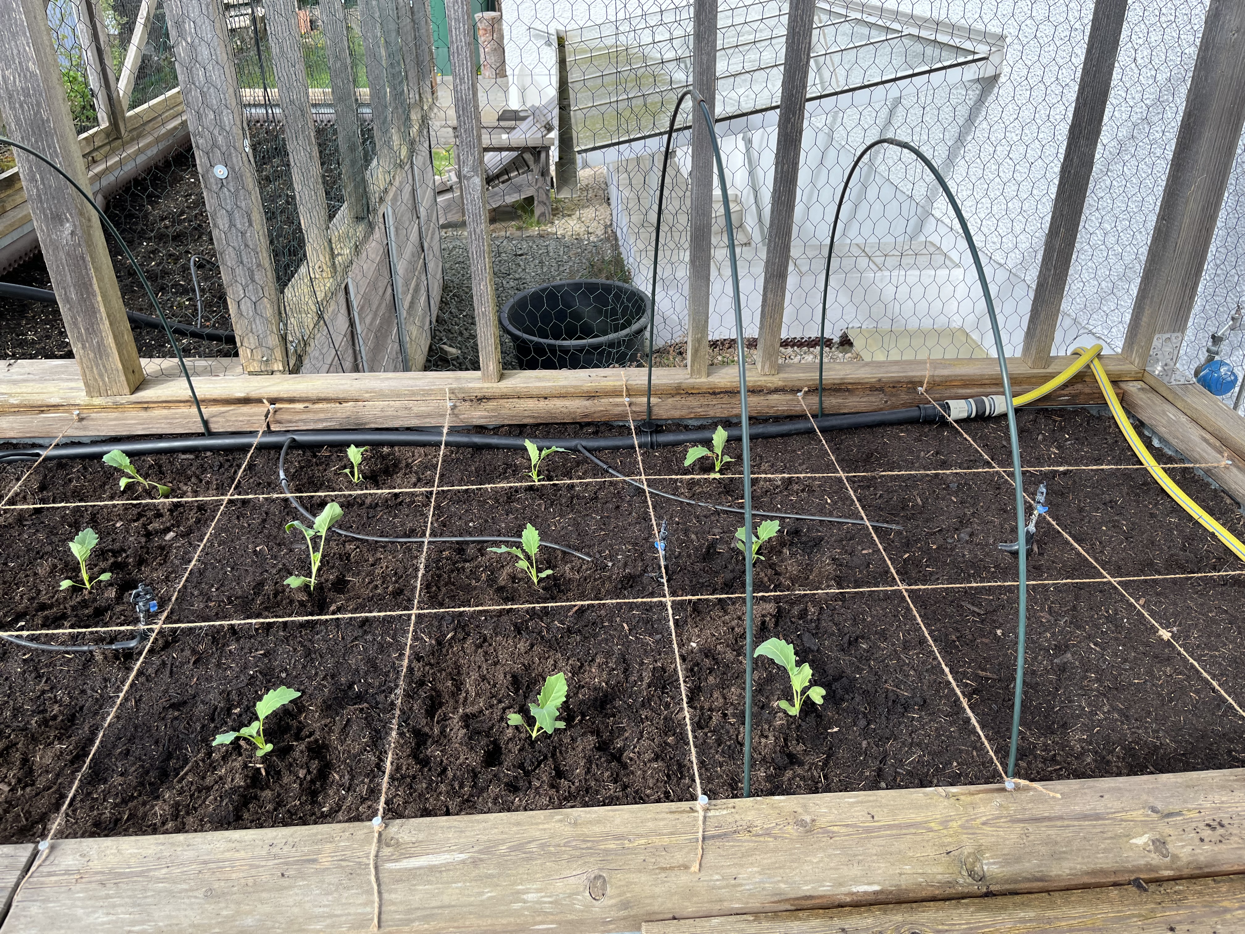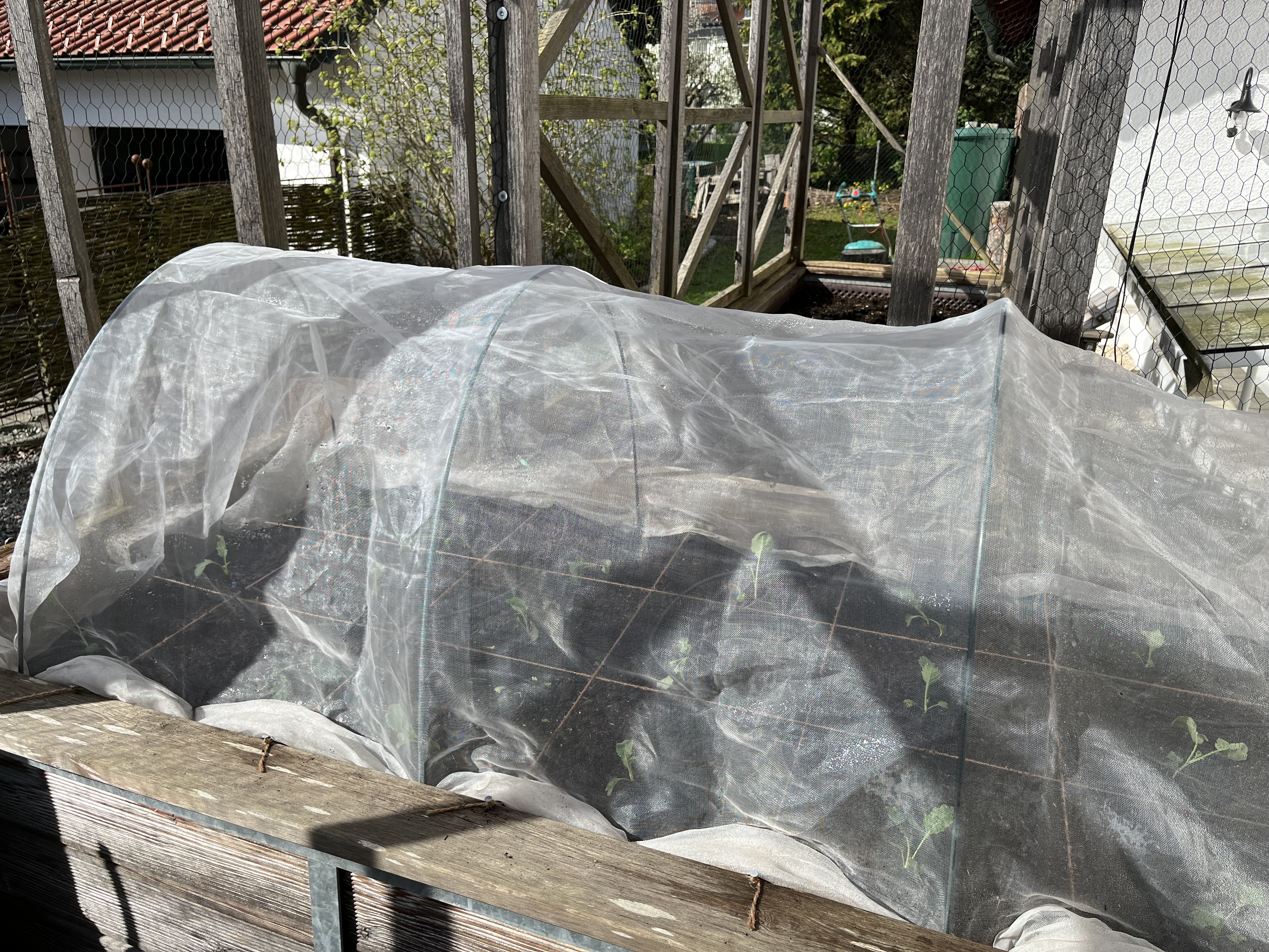 The two pictures on the bottom right of the tiled gallerie show the broccoli/cauliflower/kohlrabi-bed. These plants look so similar to each other! I can never tell them apart. If you have a trick on how to distinguish between these three plants, please let me know!! Anyway, since these plants attract the “Kohlfliege” (cabbage flea??), I have to cover them with a net. Here’s how that looks now …