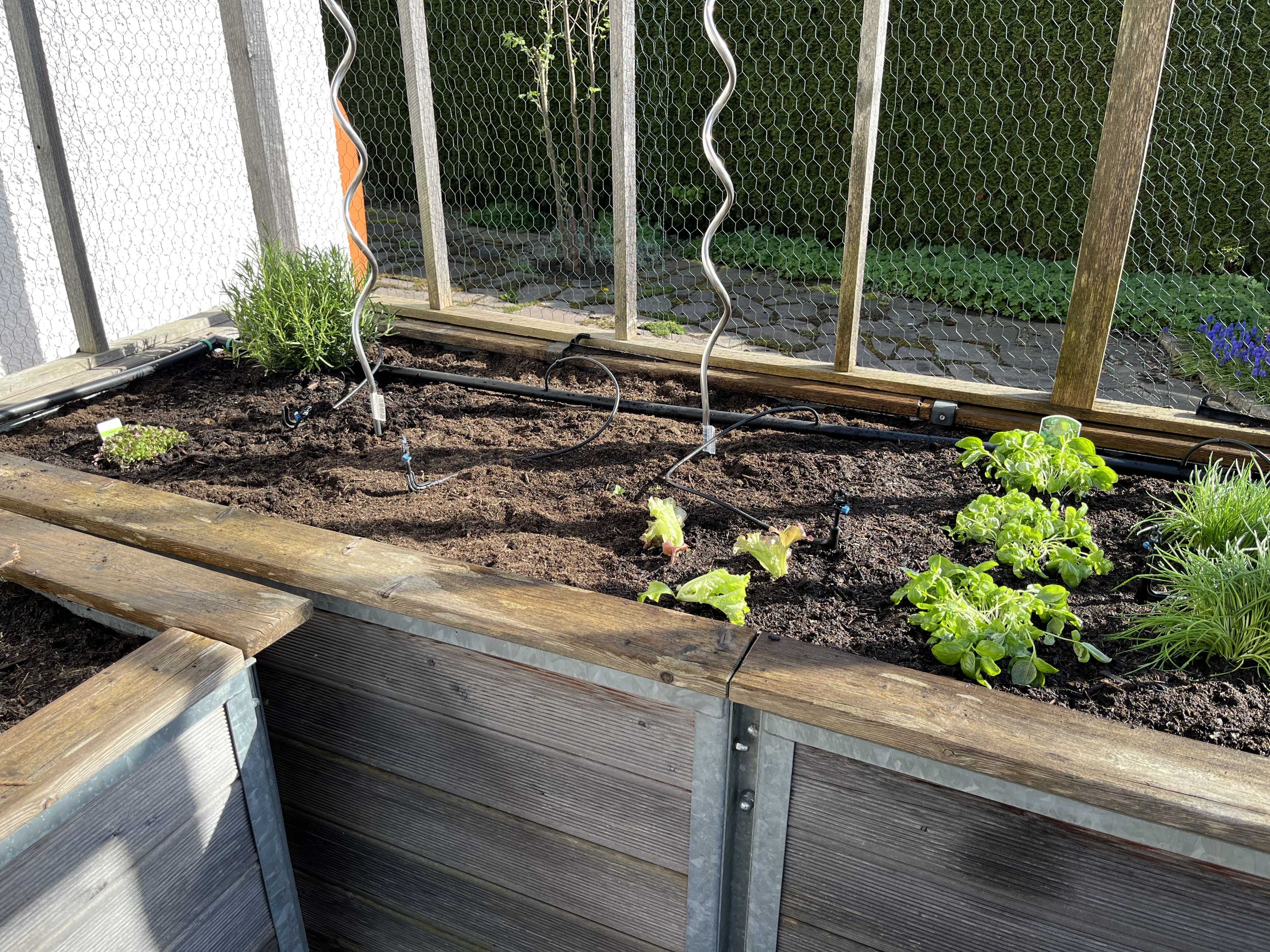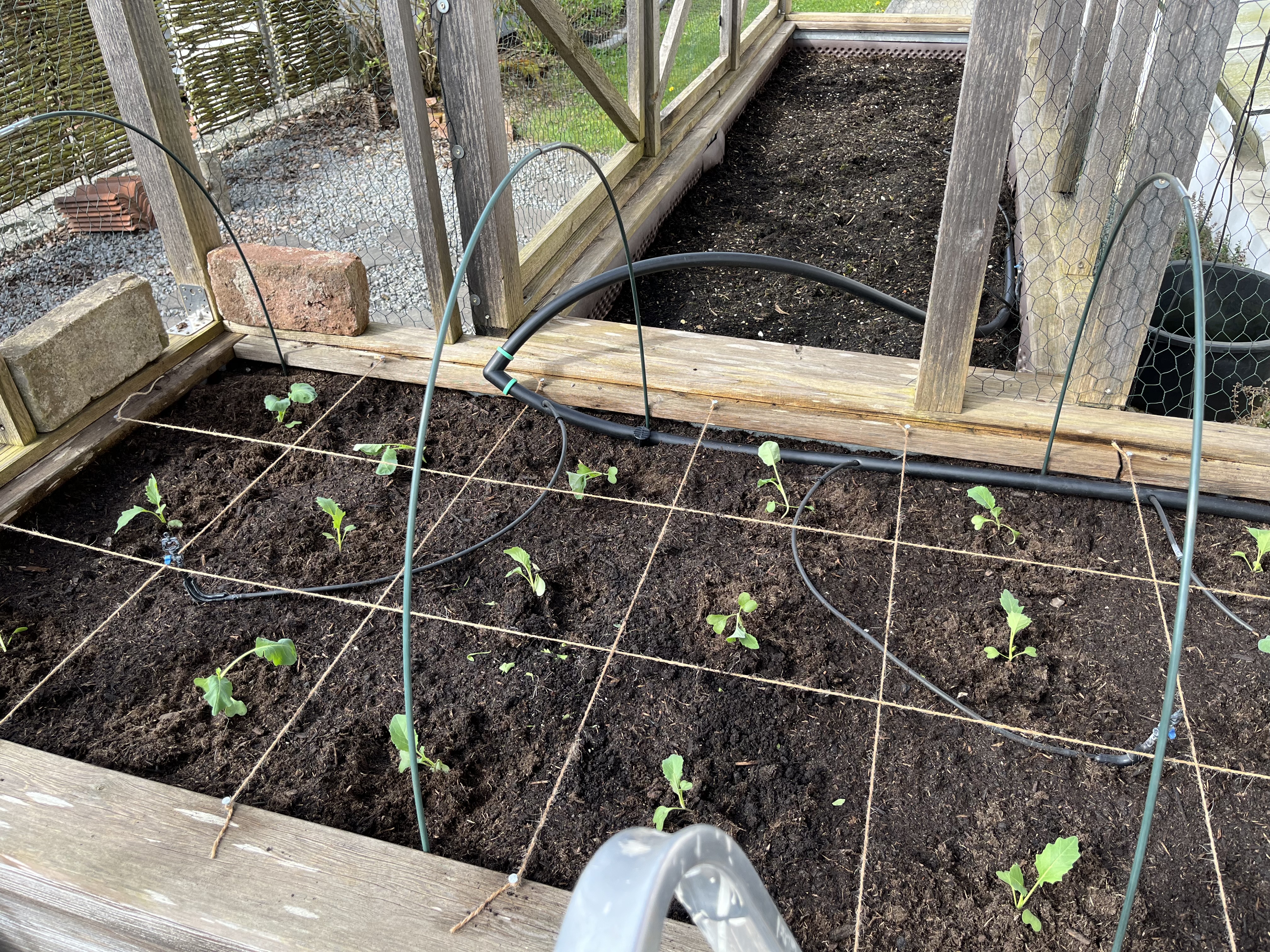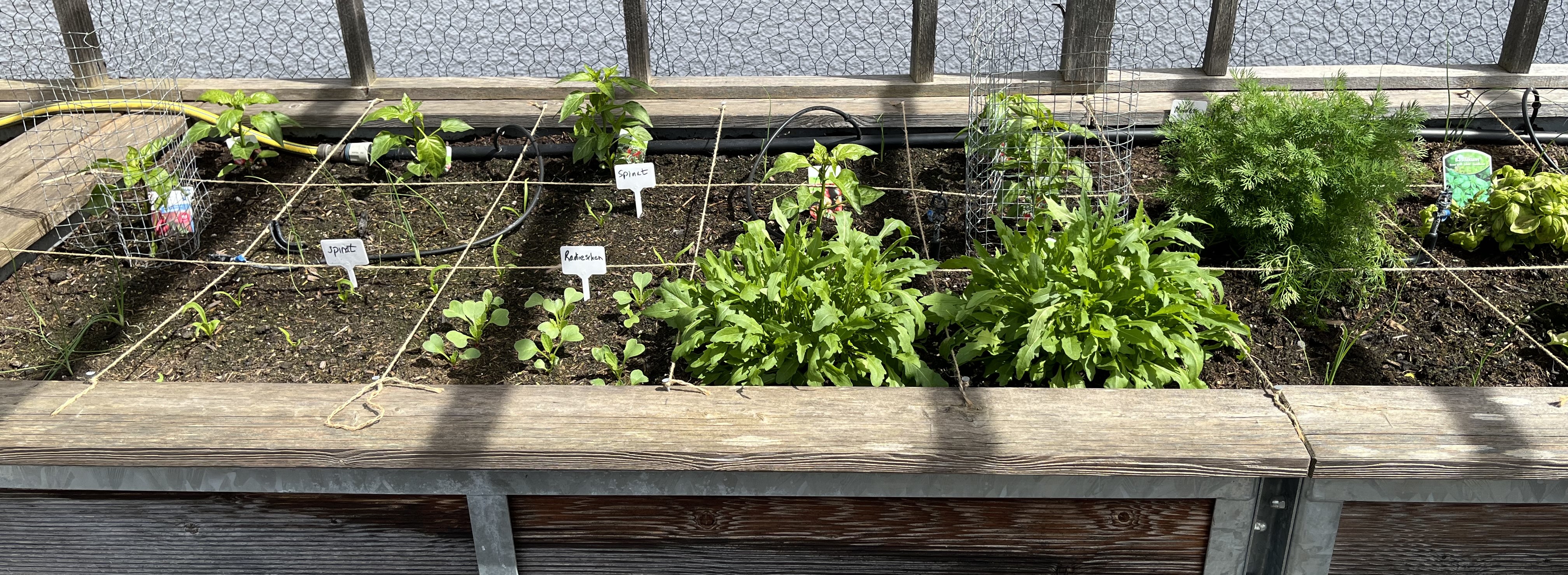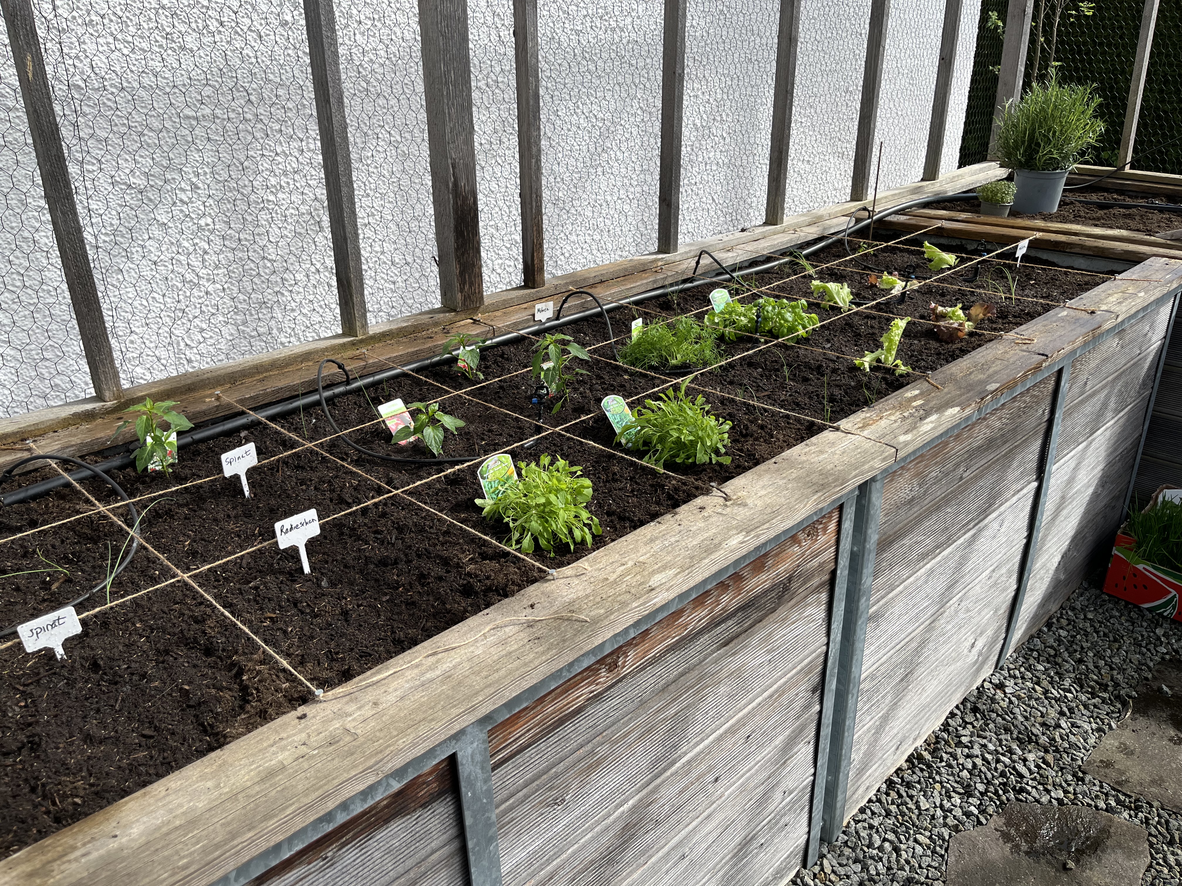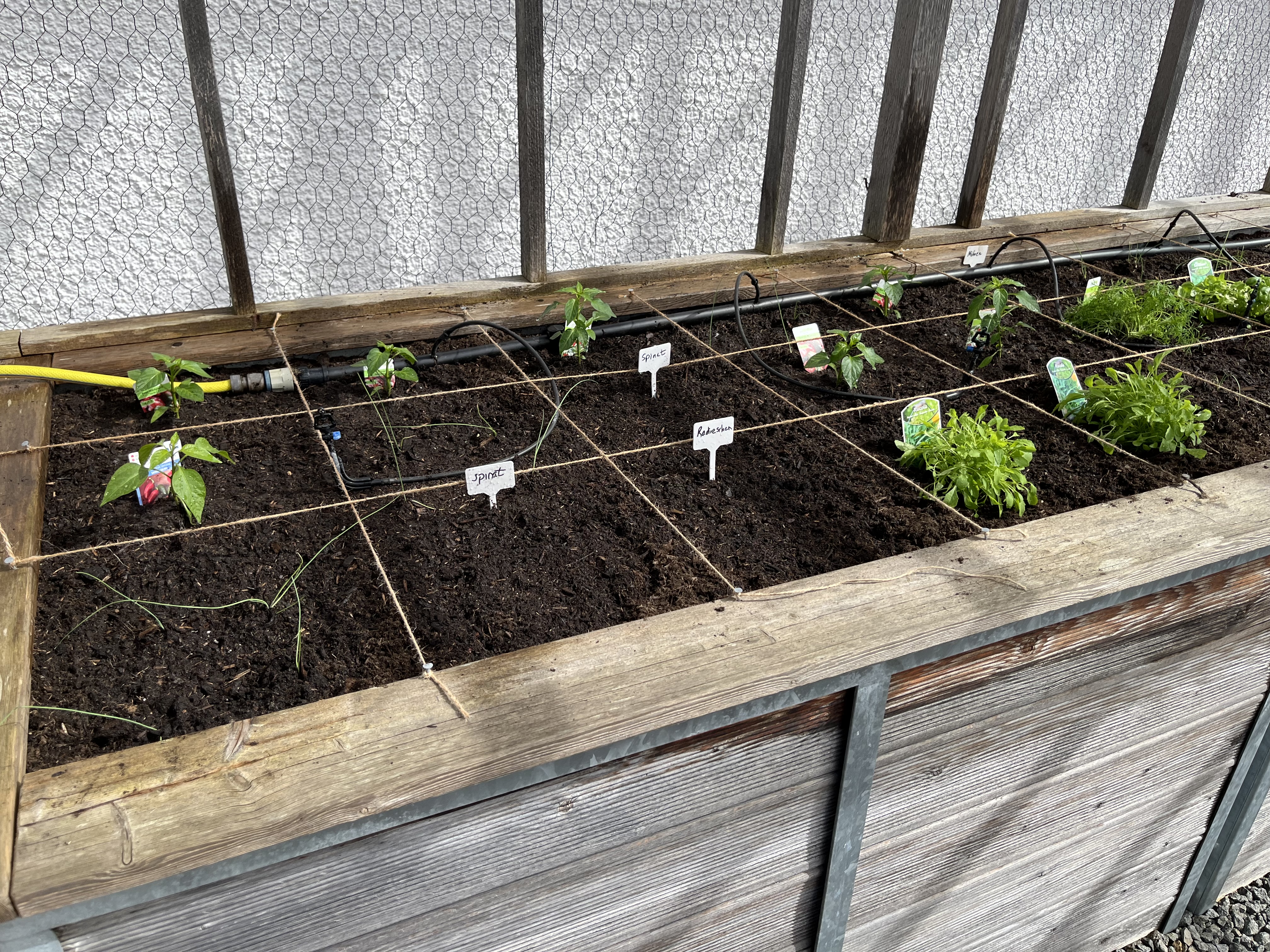 The two pictures on the bottom right of the tiled gallerie show the broccoli/cauliflower/kohlrabi-bed. These plants look so similar to each other! I can never tell them apart. If you have a trick on how to distinguish between these three plants, please let me know!! Anyway, since these plants attract the “Kohlfliege” (cabbage flea??), I have to cover them with a net. Here’s how that looks now …