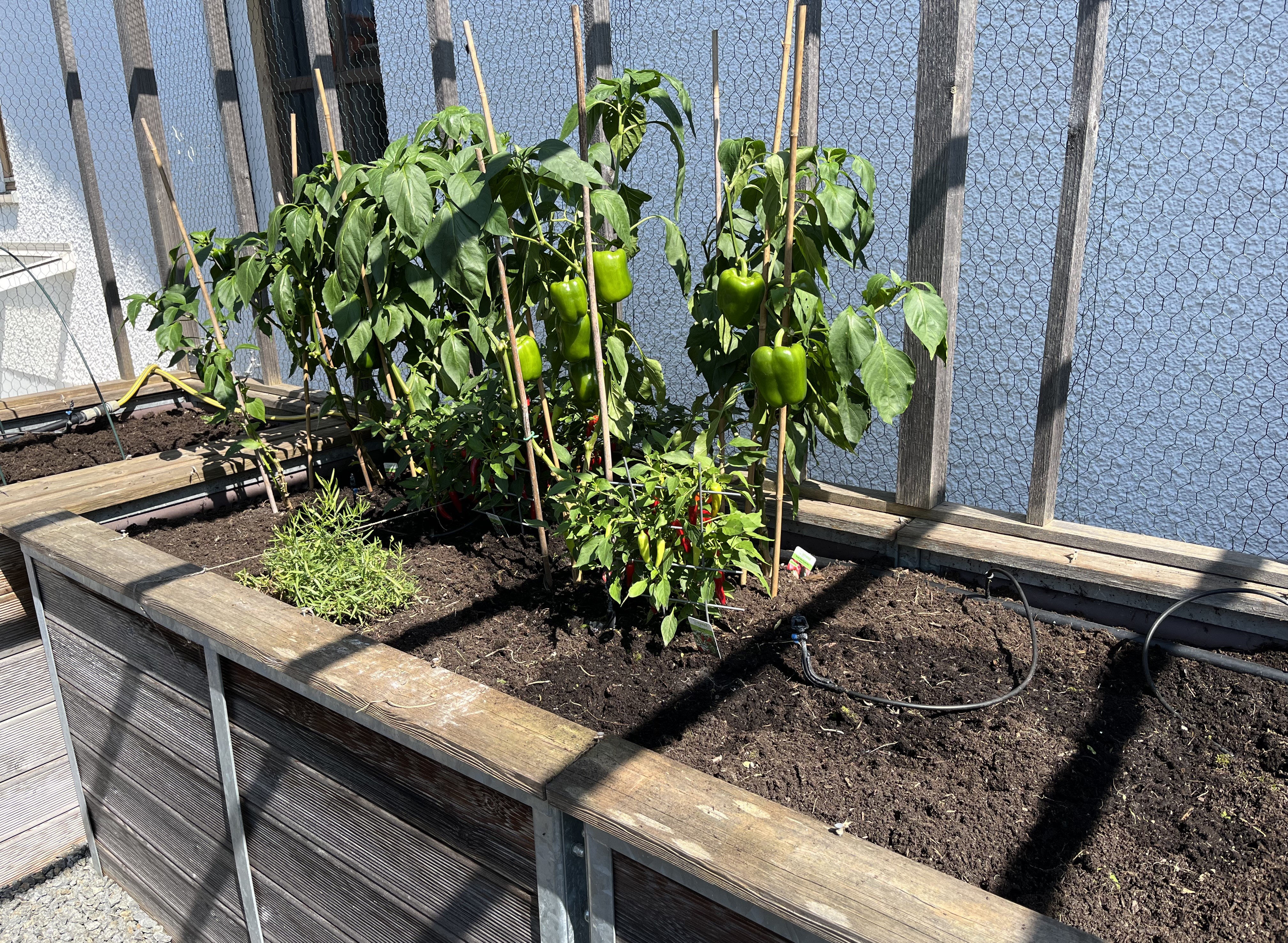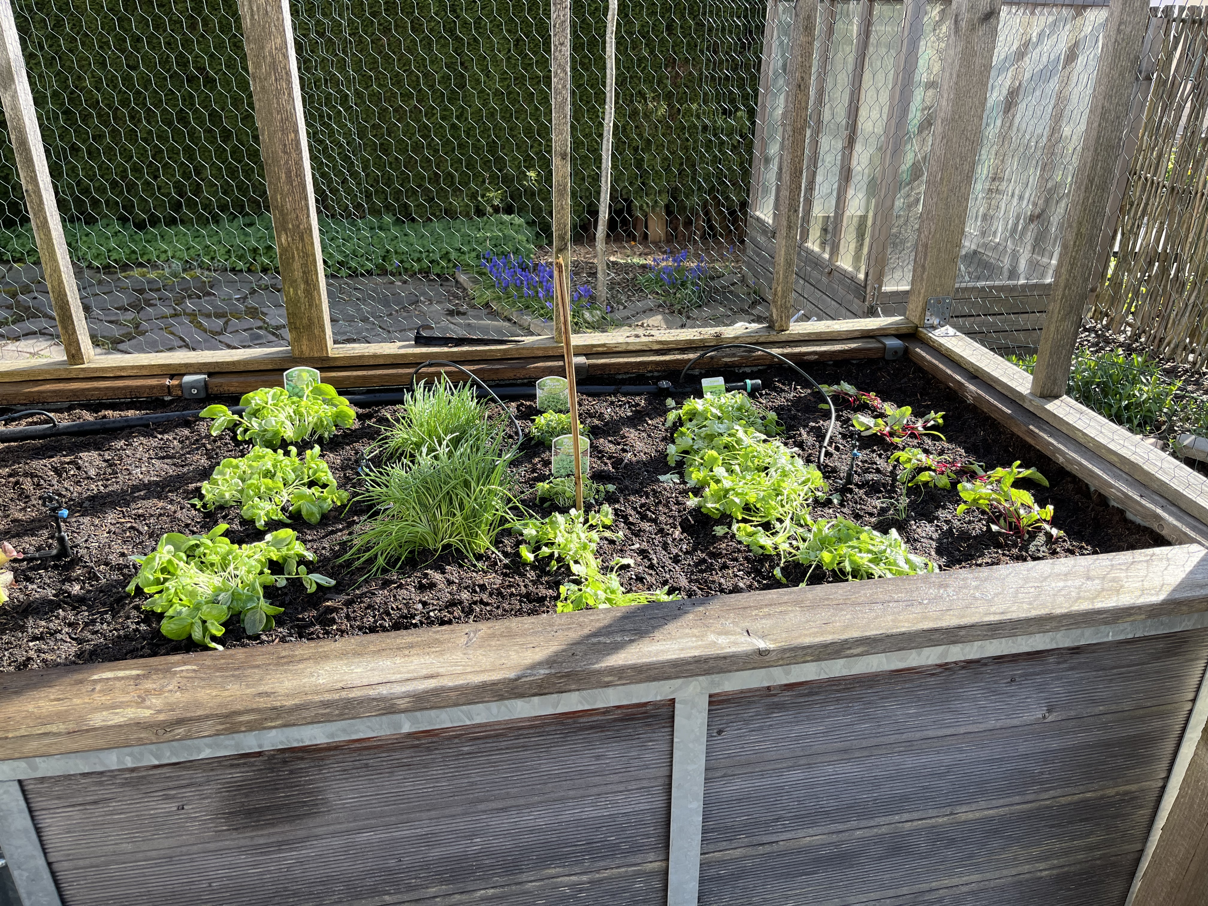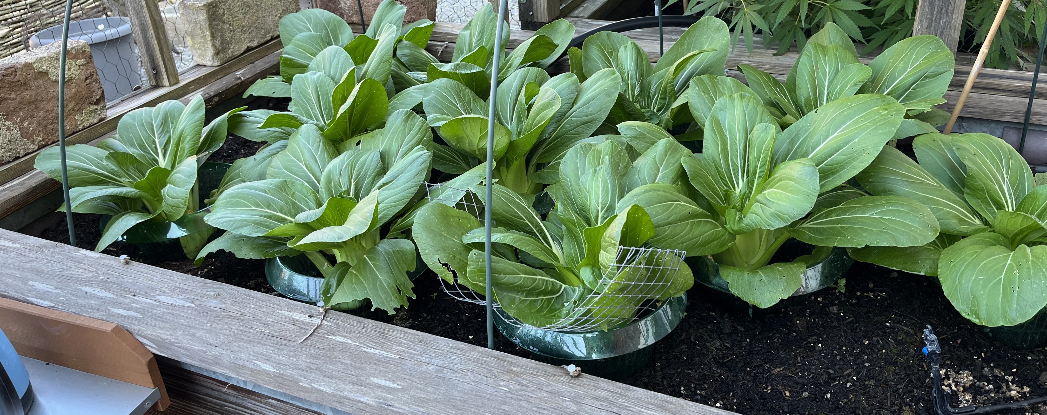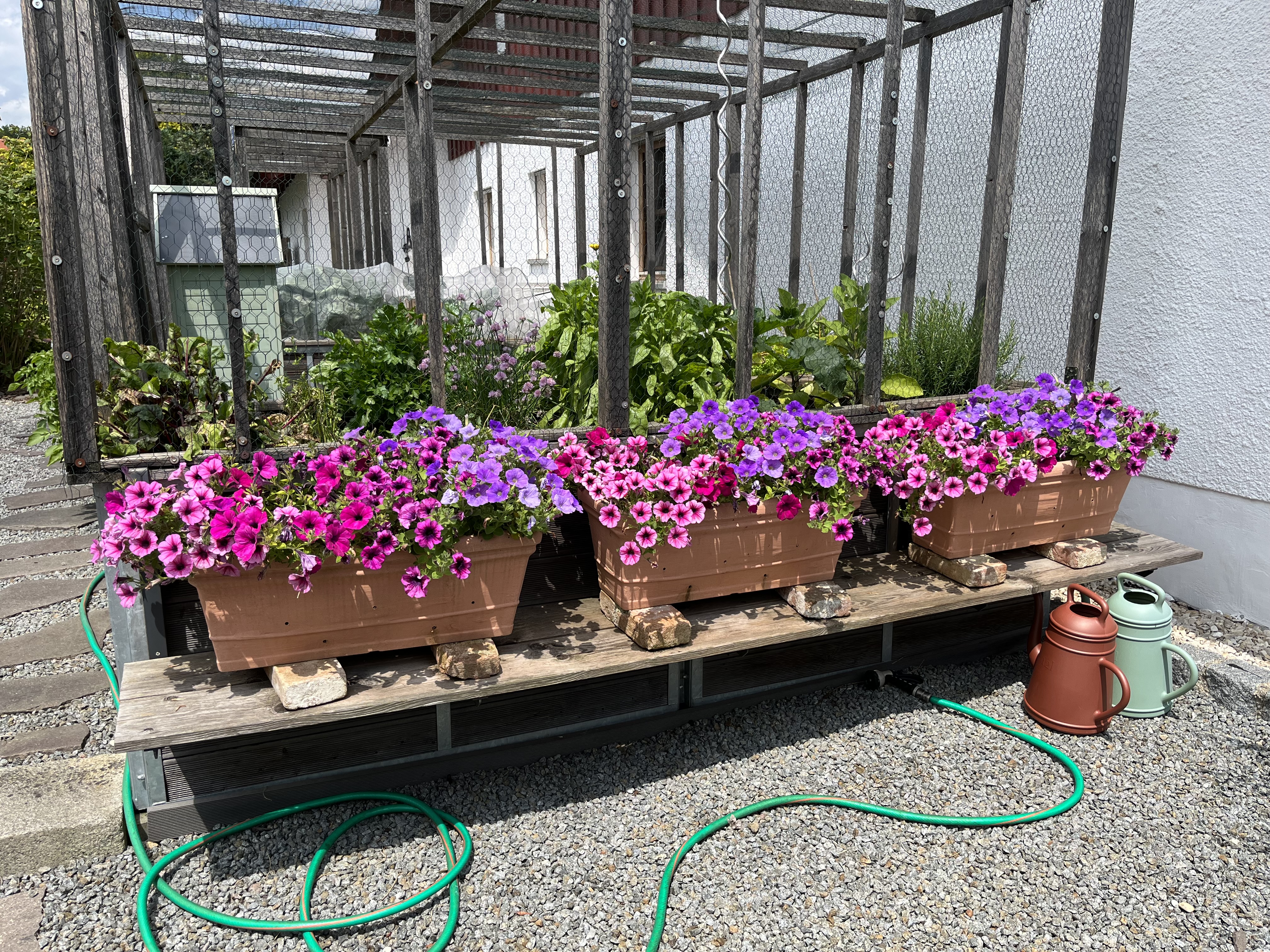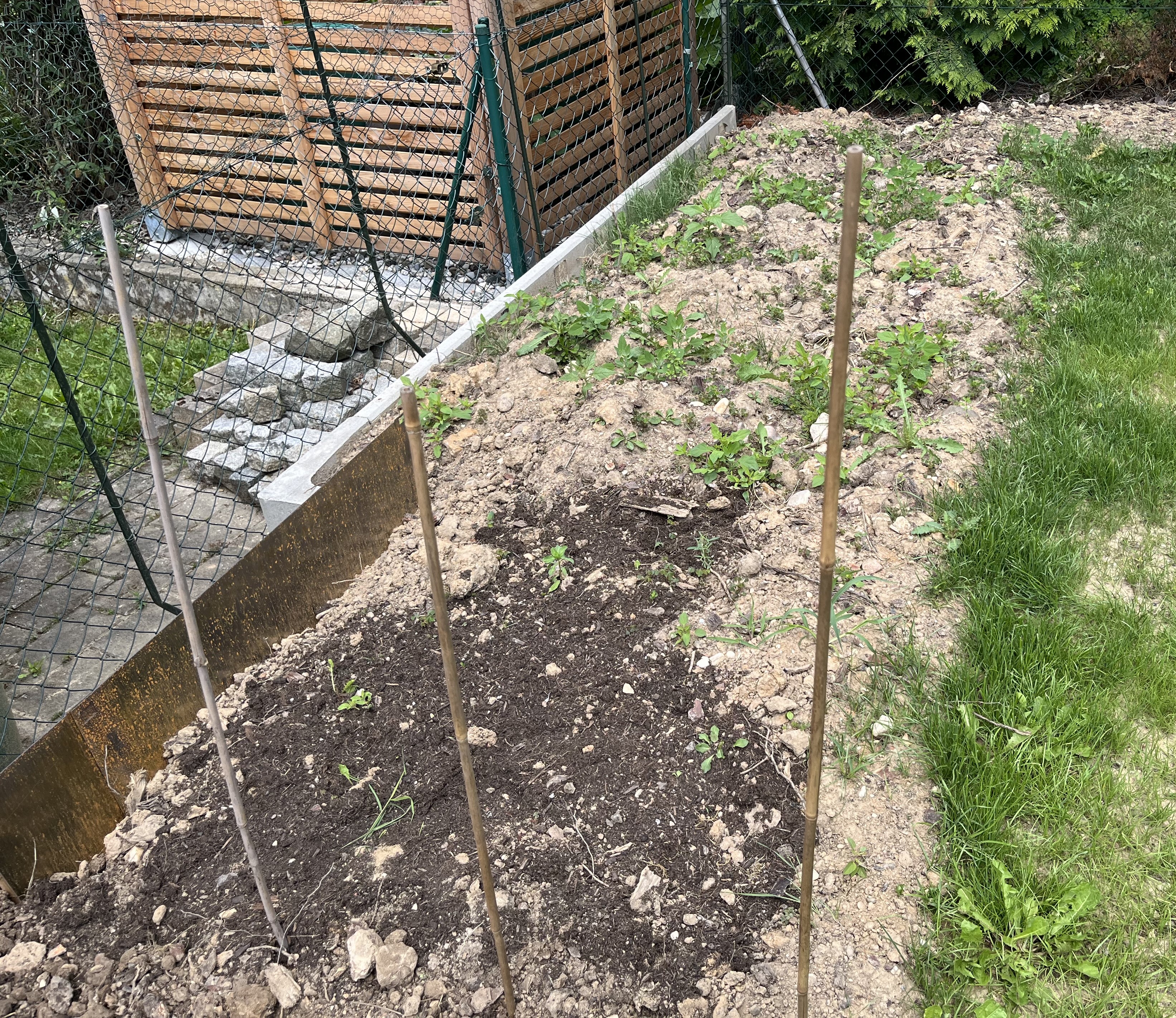 The two pictures on the bottom right of the tiled gallerie show the broccoli/cauliflower/kohlrabi-bed. These plants look so similar to each other! I can never tell them apart. If you have a trick on how to distinguish between these three plants, please let me know!! Anyway, since these plants attract the “Kohlfliege” (cabbage flea??), I have to cover them with a net. Here’s how that looks now …