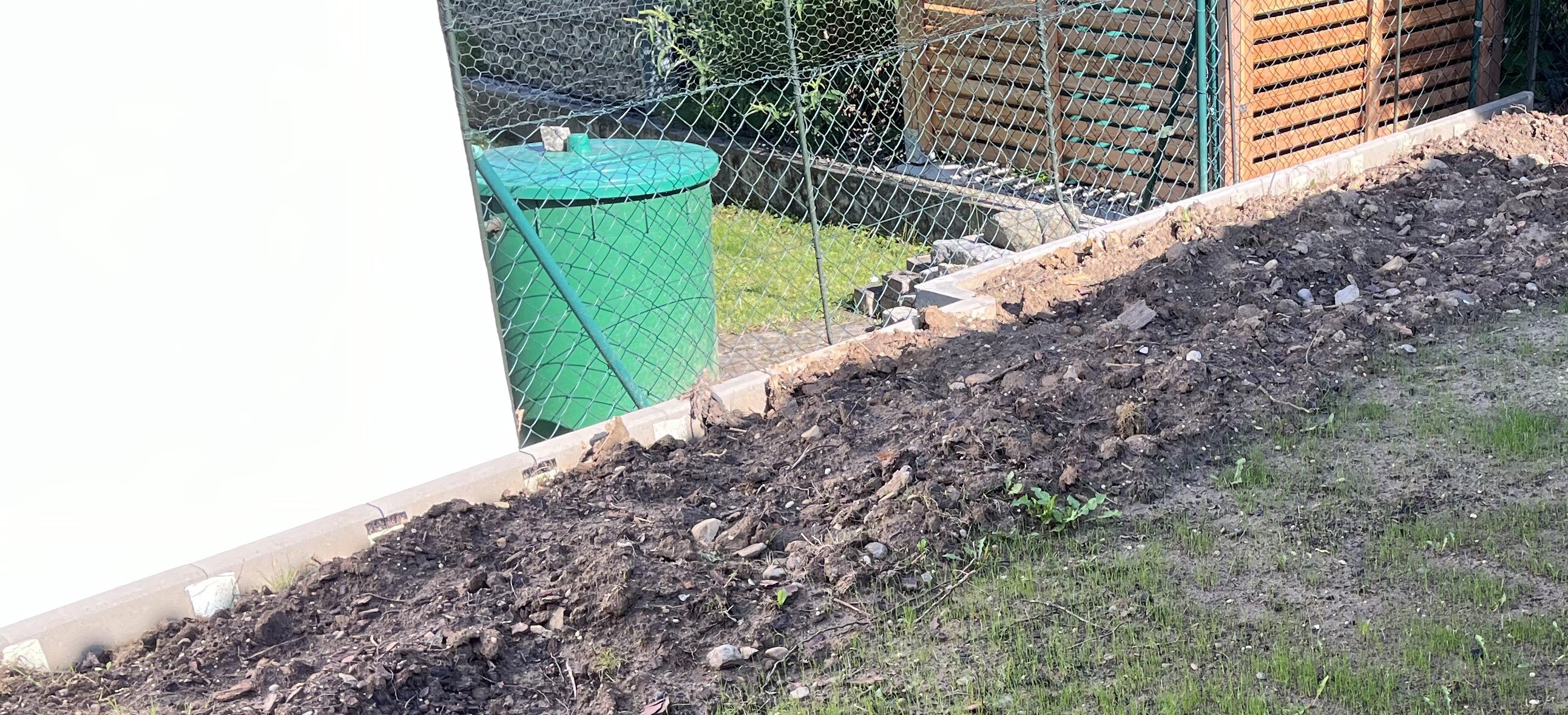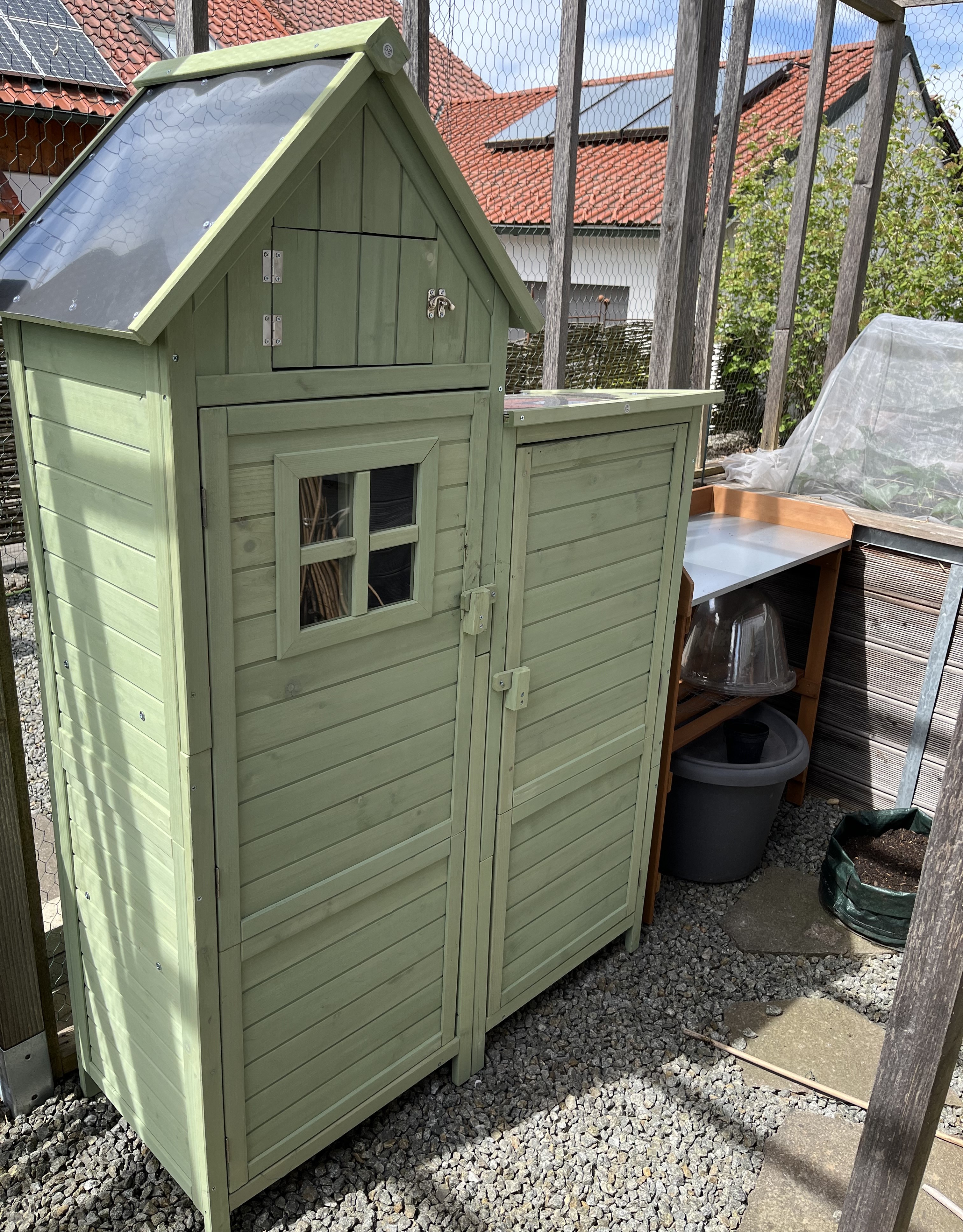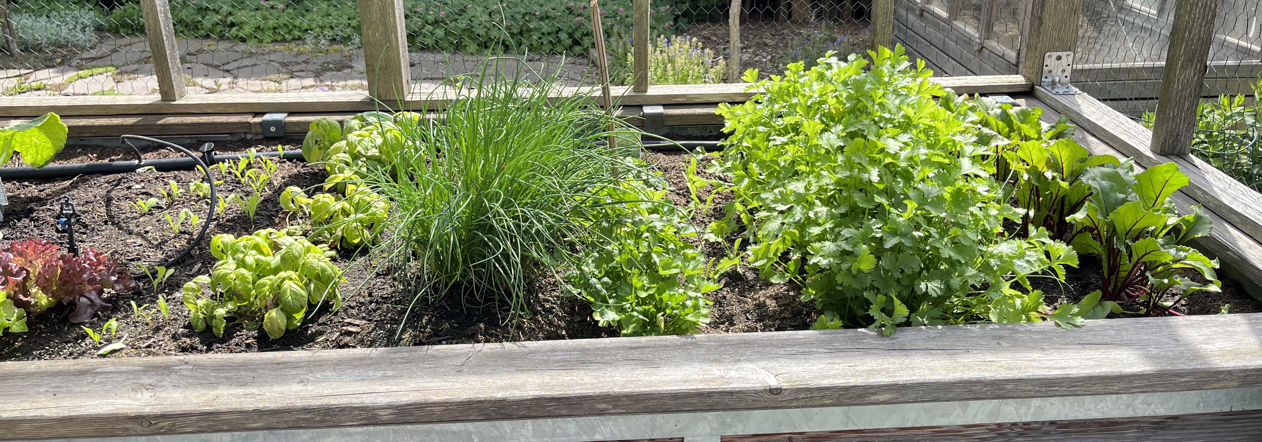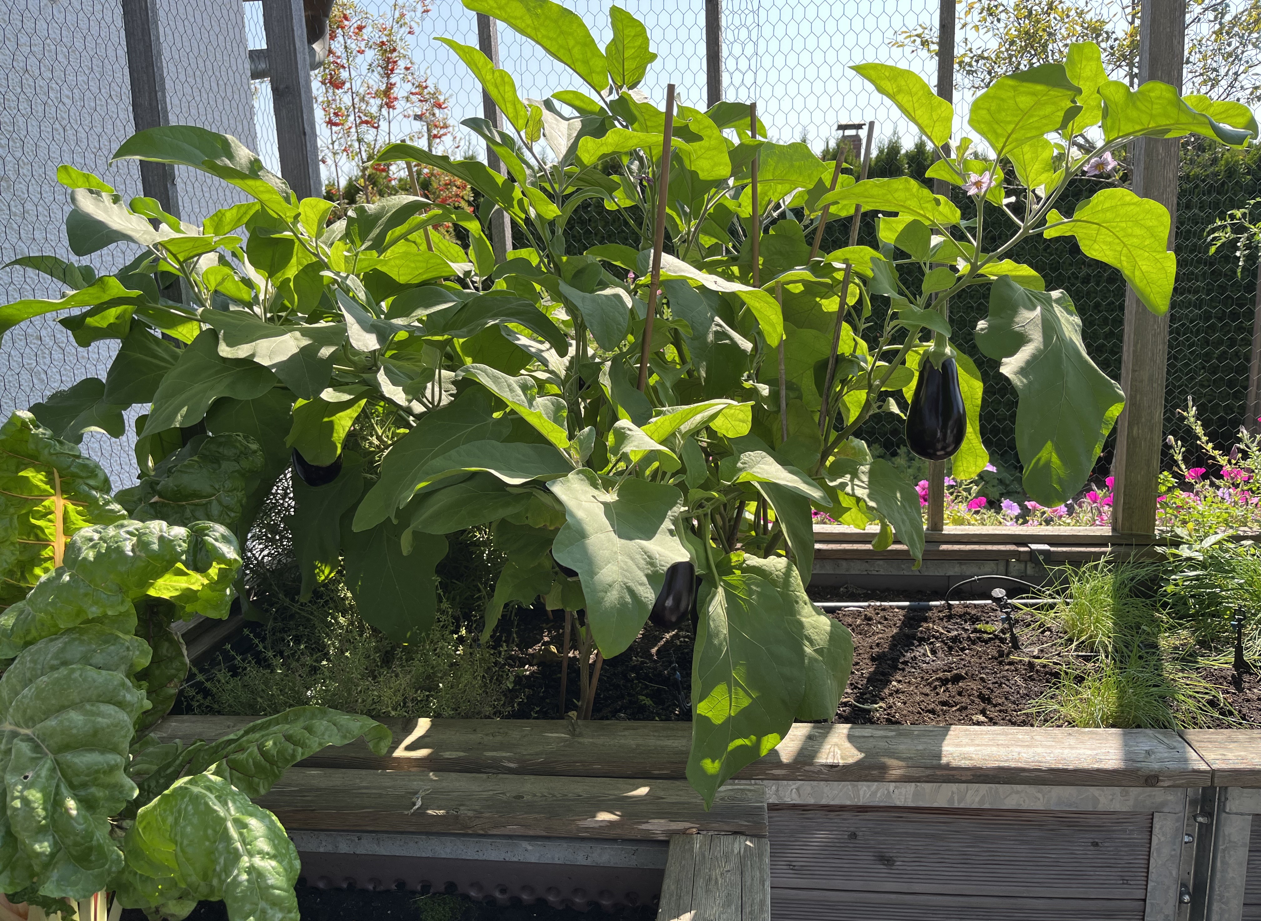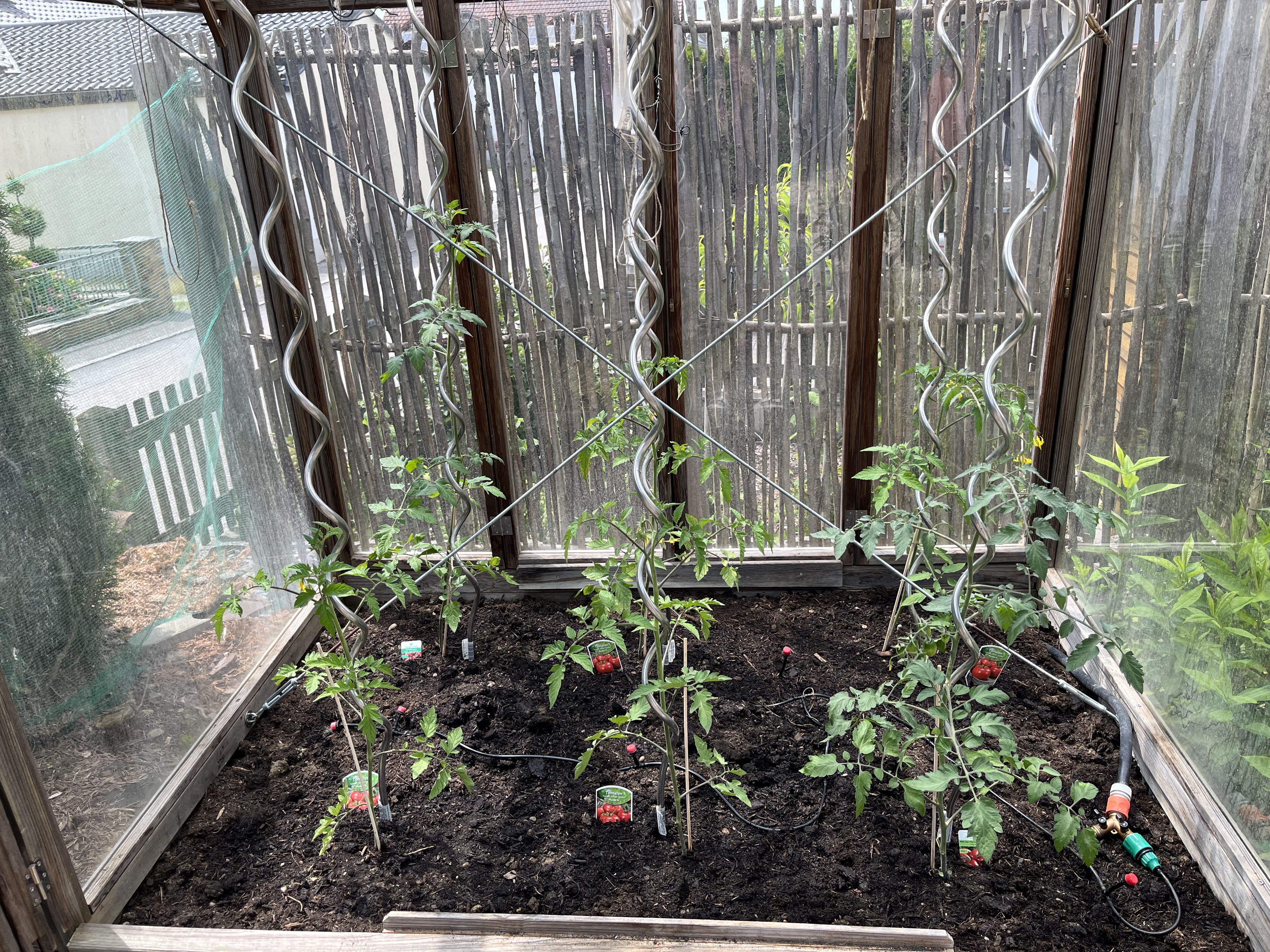 The two pictures on the bottom right of the tiled gallerie show the broccoli/cauliflower/kohlrabi-bed. These plants look so similar to each other! I can never tell them apart. If you have a trick on how to distinguish between these three plants, please let me know!! Anyway, since these plants attract the “Kohlfliege” (cabbage flea??), I have to cover them with a net. Here’s how that looks now …