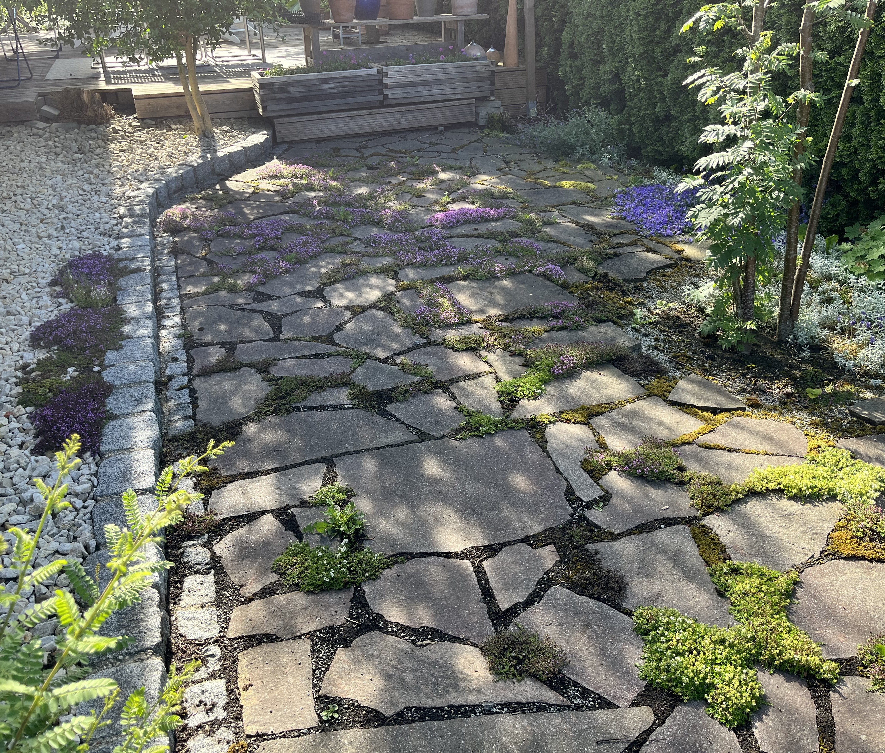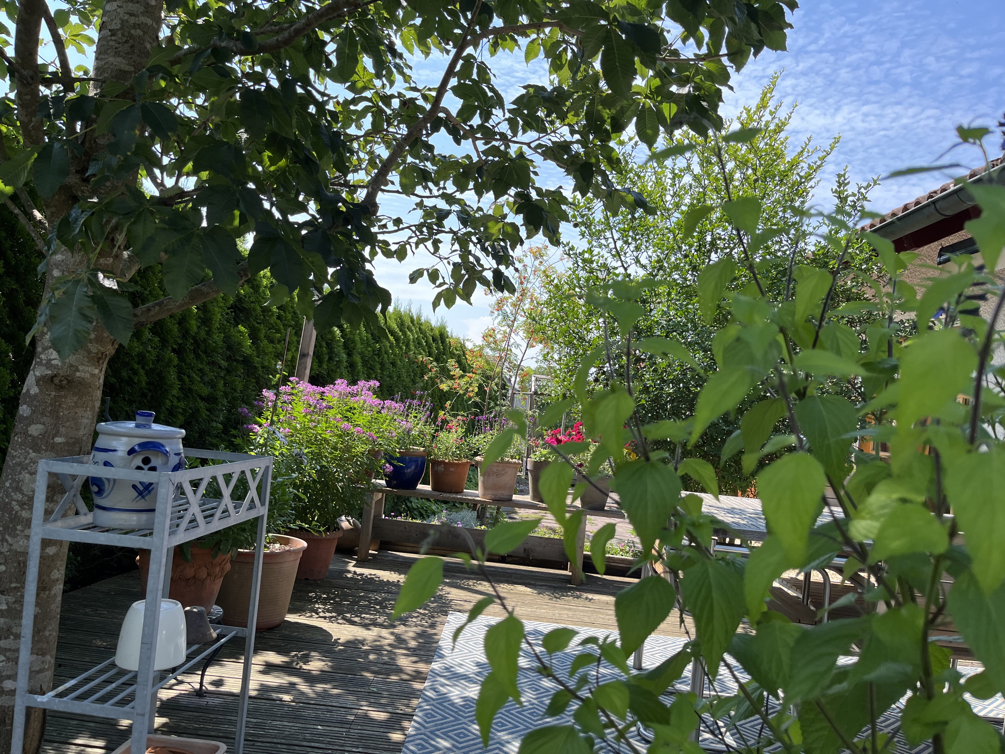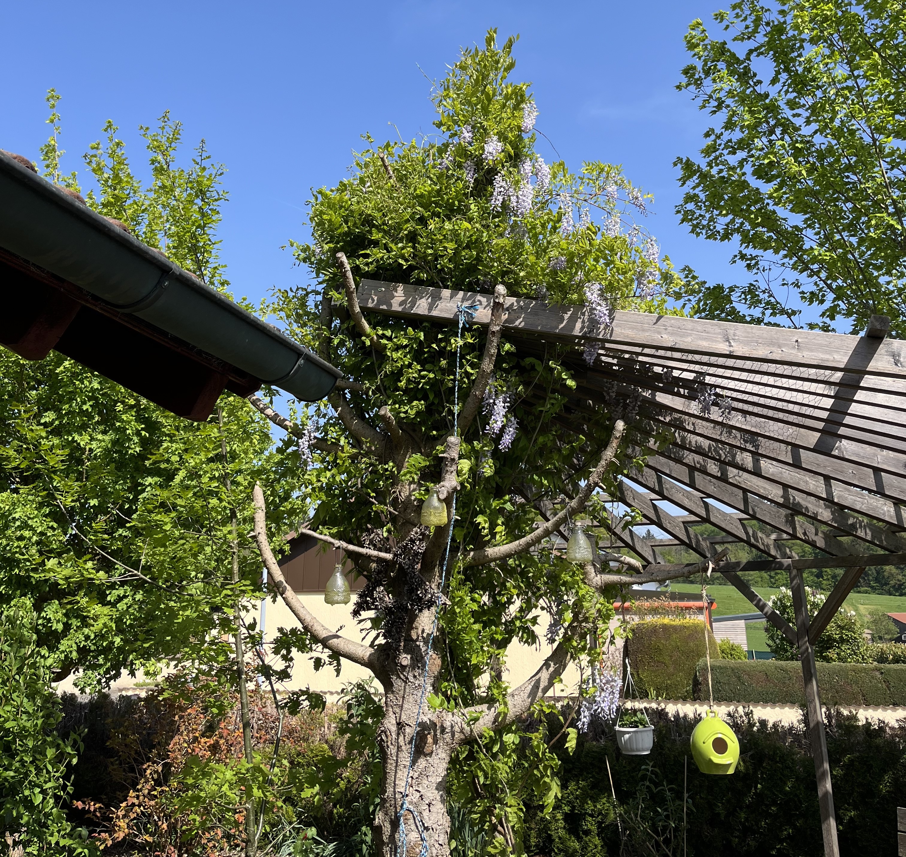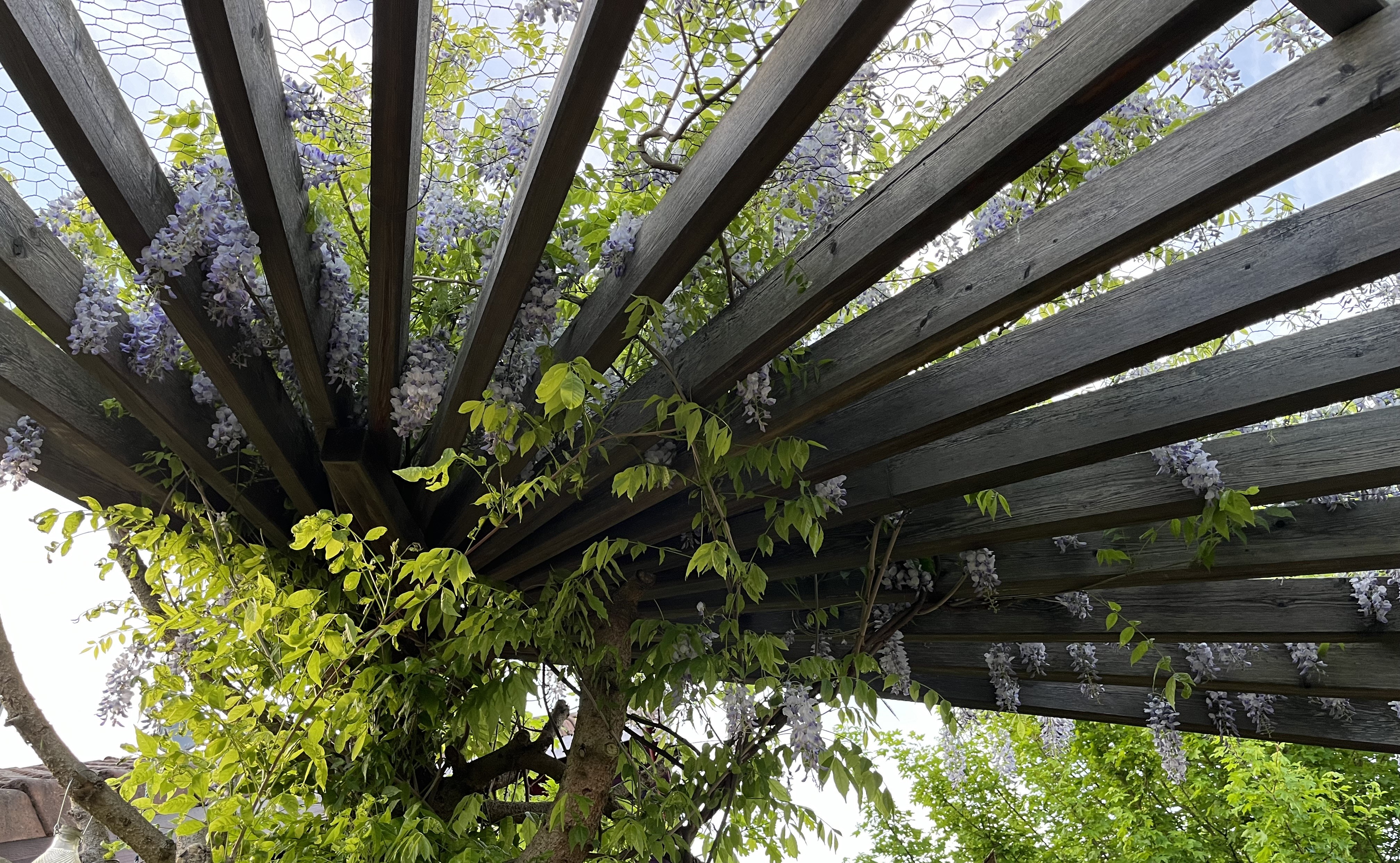 I am particularly pleased with how the wisteria is blooming this year. This is the first year it has started to bloom profusely … looking more like all those fabulous photos out there that show wisteria in all its glory. I am so glad that my idea actually is starting to work out: the flowers hang down between the pergola beams creating that kind of “blue rain” look. In fact, that is the common name for wisteria in German: Blauregen, which translates into – you guessed it – blue rain!