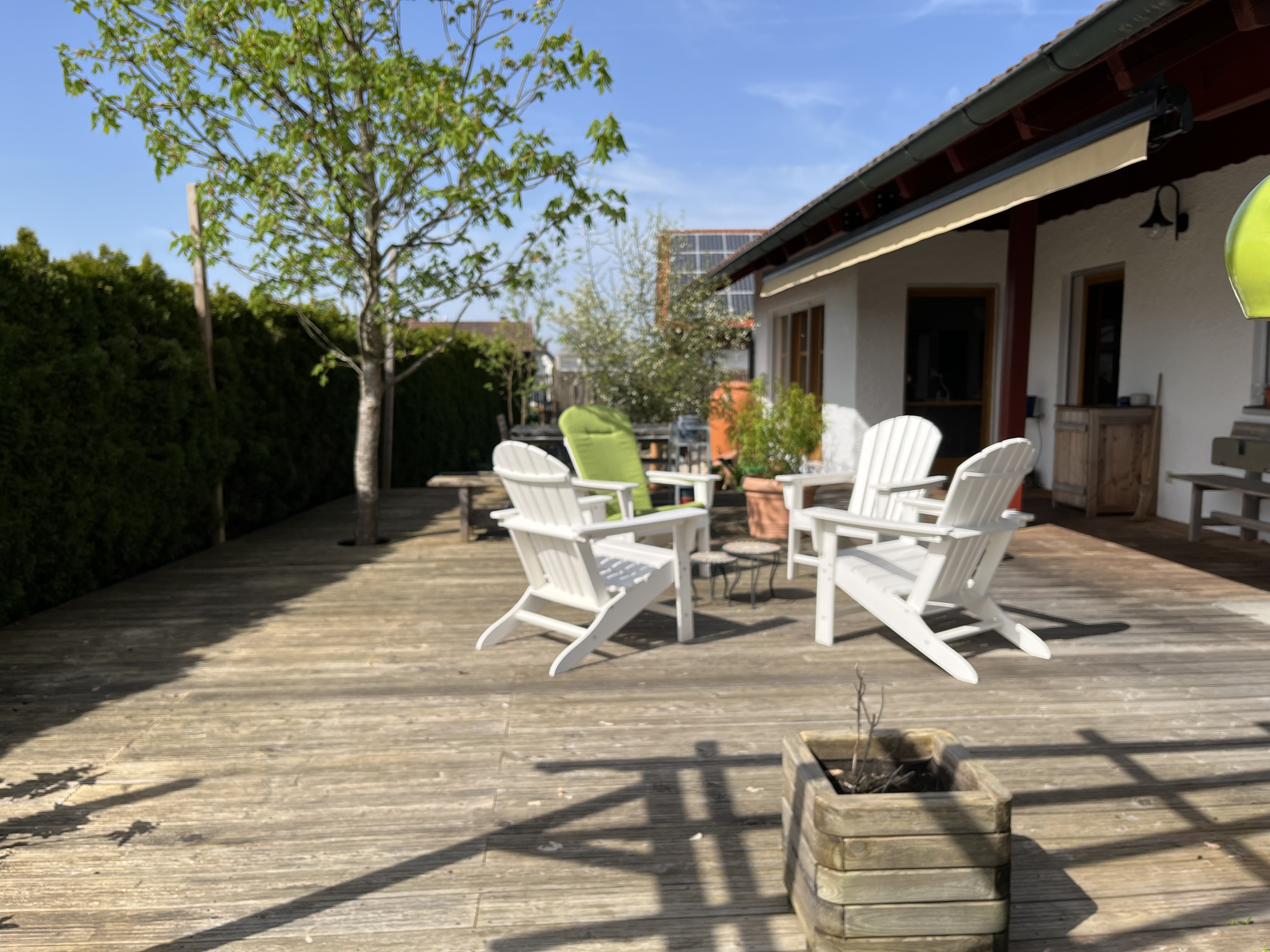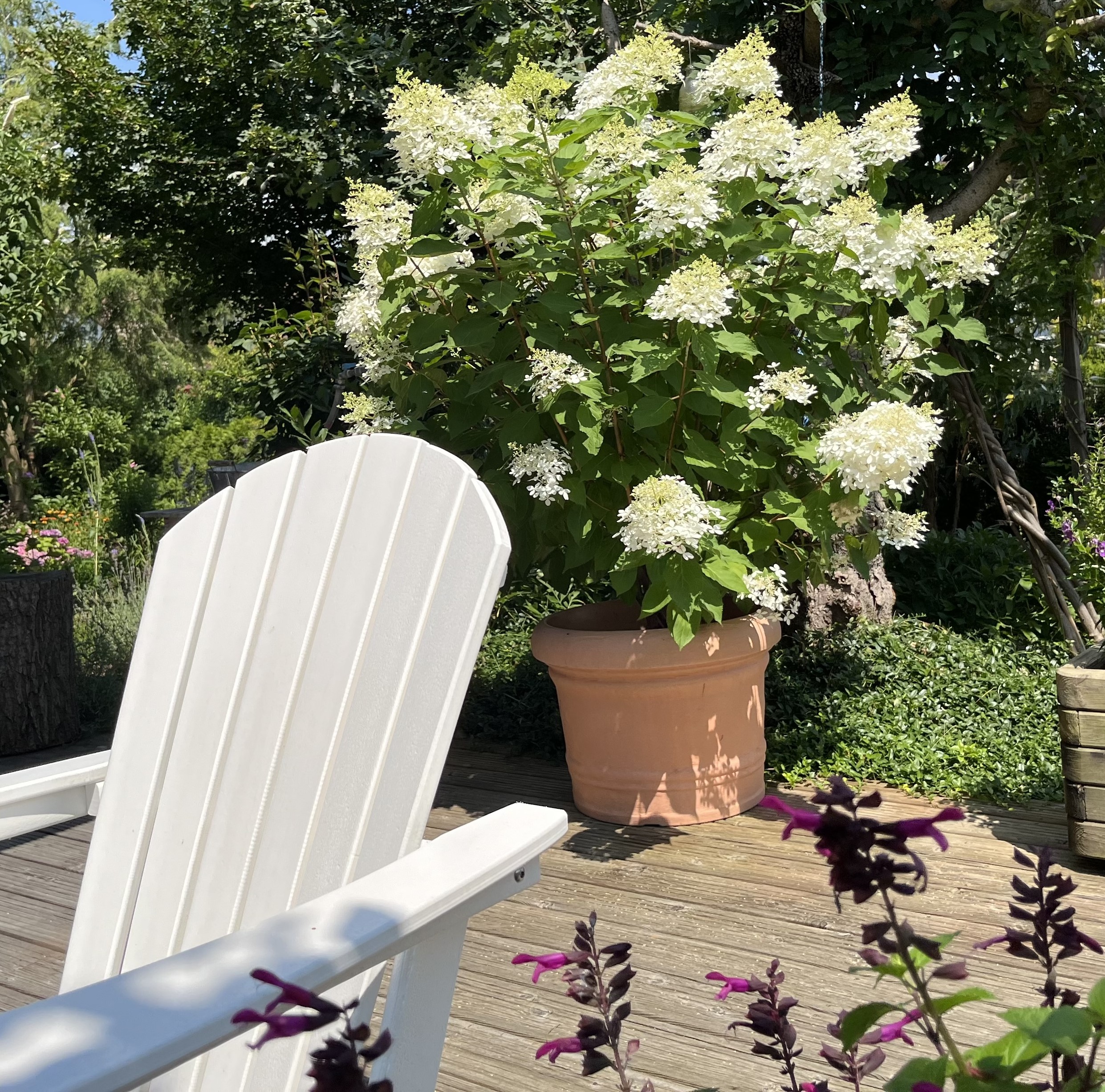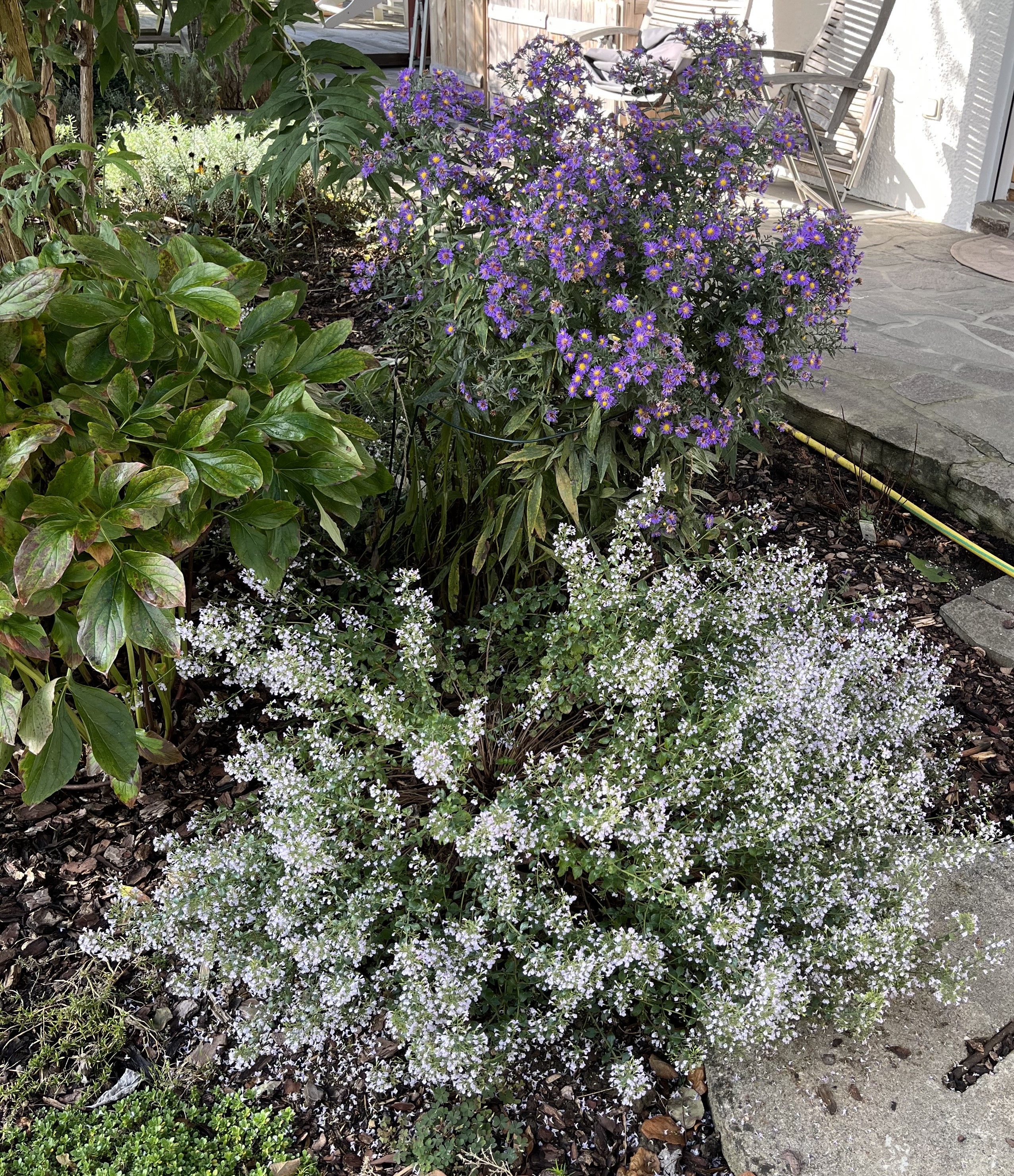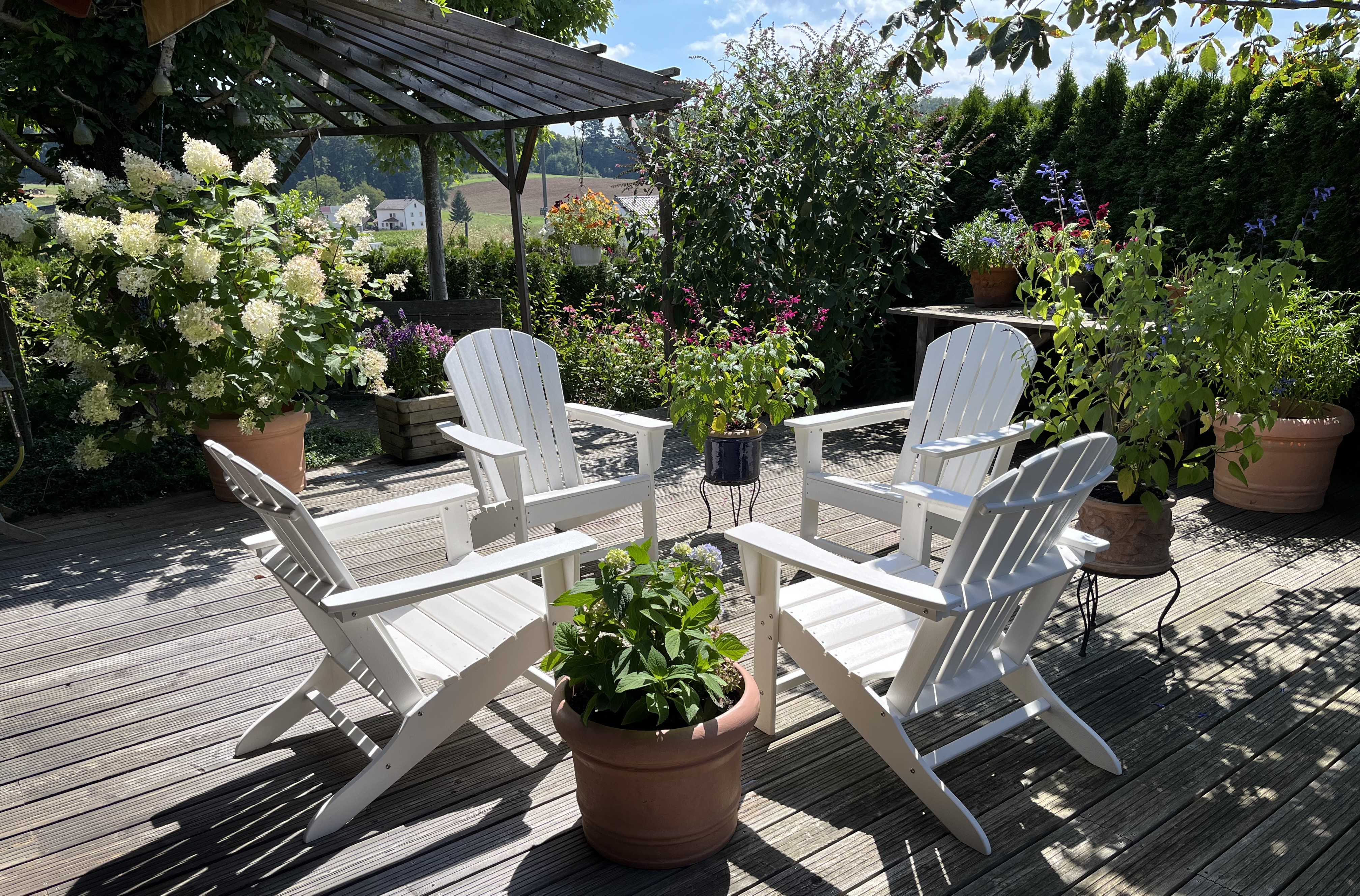 I am particularly pleased with how the wisteria is blooming this year. This is the first year it has started to bloom profusely … looking more like all those fabulous photos out there that show wisteria in all its glory. I am so glad that my idea actually is starting to work out: the flowers hang down between the pergola beams creating that kind of “blue rain” look. In fact, that is the common name for wisteria in German: Blauregen, which translates into – you guessed it – blue rain!