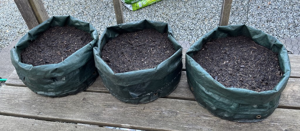 Yesterday, I planted the potatoes using the potato sacks. You cover the bottom of the sack with about 15 cm of soil, place your potatoes on top and then cover them with another 10-15 cm of soil. Once the plants sprout and grow about 5 cm, then you add more soil. You keep doing this “lasagne” approach until the sack is just about full. Then, aside from watering, you just let the plants develop. Oh yeah, there is the small matter of the potato bug. Since I don’t use any pesticides or anything, I have to use the manual method of removing the bugs by hand and crushing them – sorry!!! But, we are a month or so away from that. I roll the potato sacks down so that as much soil as possible is exposed to the sun; that’s why they look so squat. But, as the plants grow and I add soil, I will be unrolling the sides. So, here’s how the potato sacks look now …