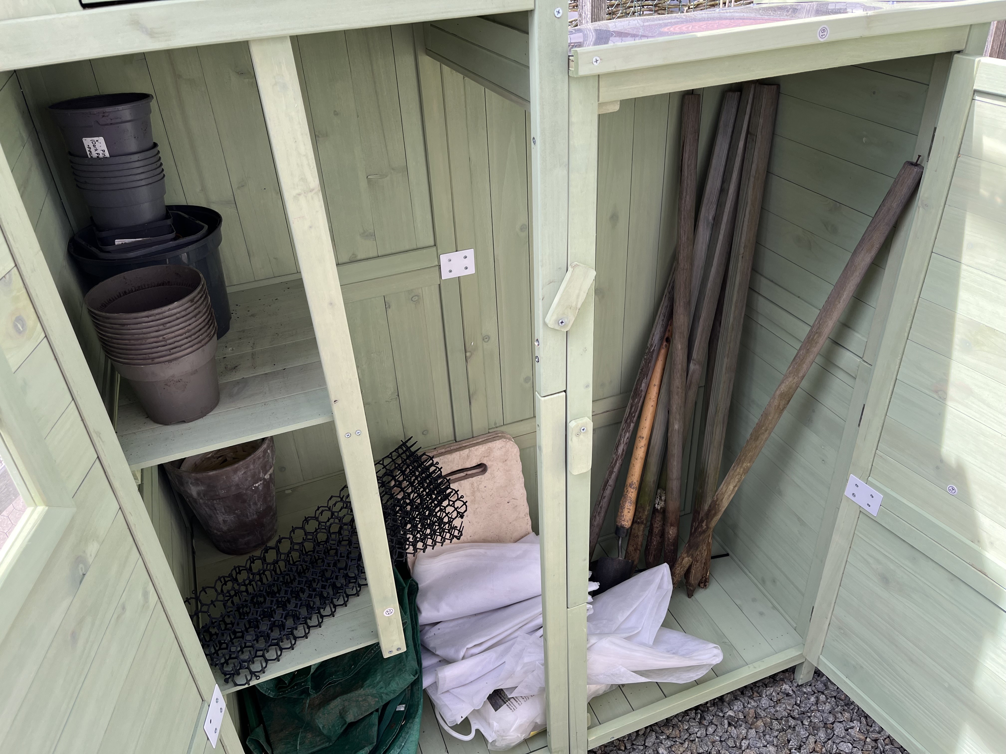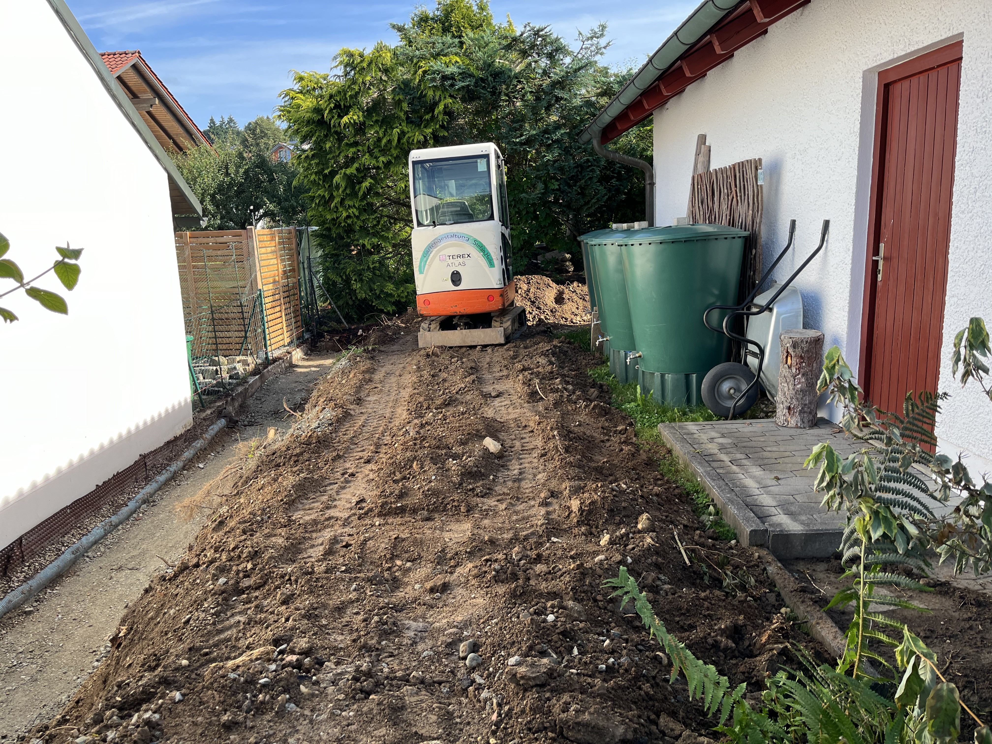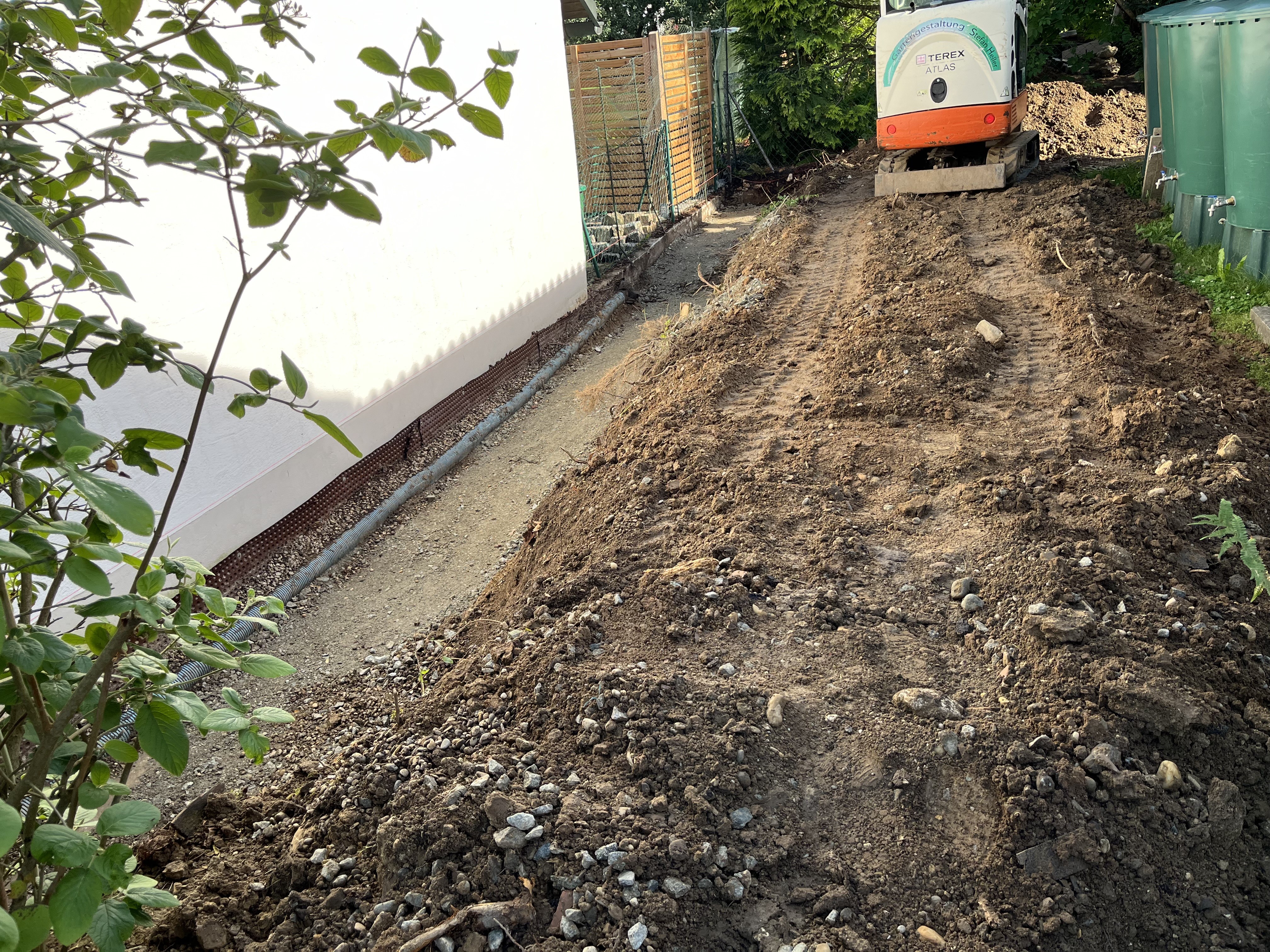 The rainwater barrels are connected and collecting rain water. We had the first thunderstorm of the year yesterday and one rain barrel is completely full already!