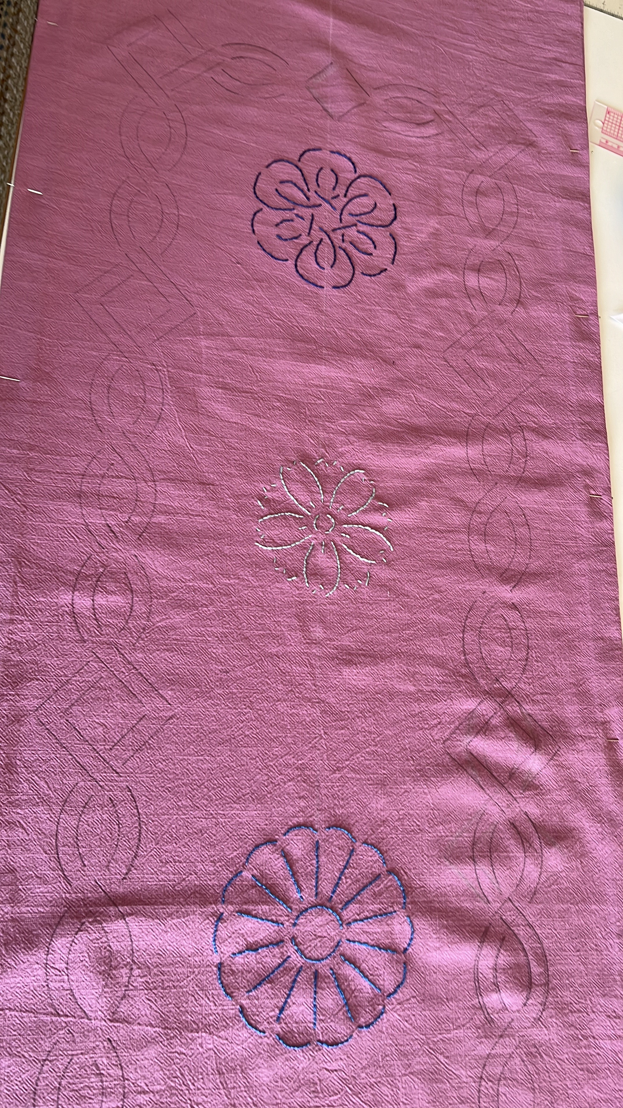 I am almost halfway finished and wanted to show you how these pre-printed panels work … incredibly easy! The design is outlined with water-soluble ink. You just stitch along the design, wash it out thoroughly when you are done, iron, edge and voilá!