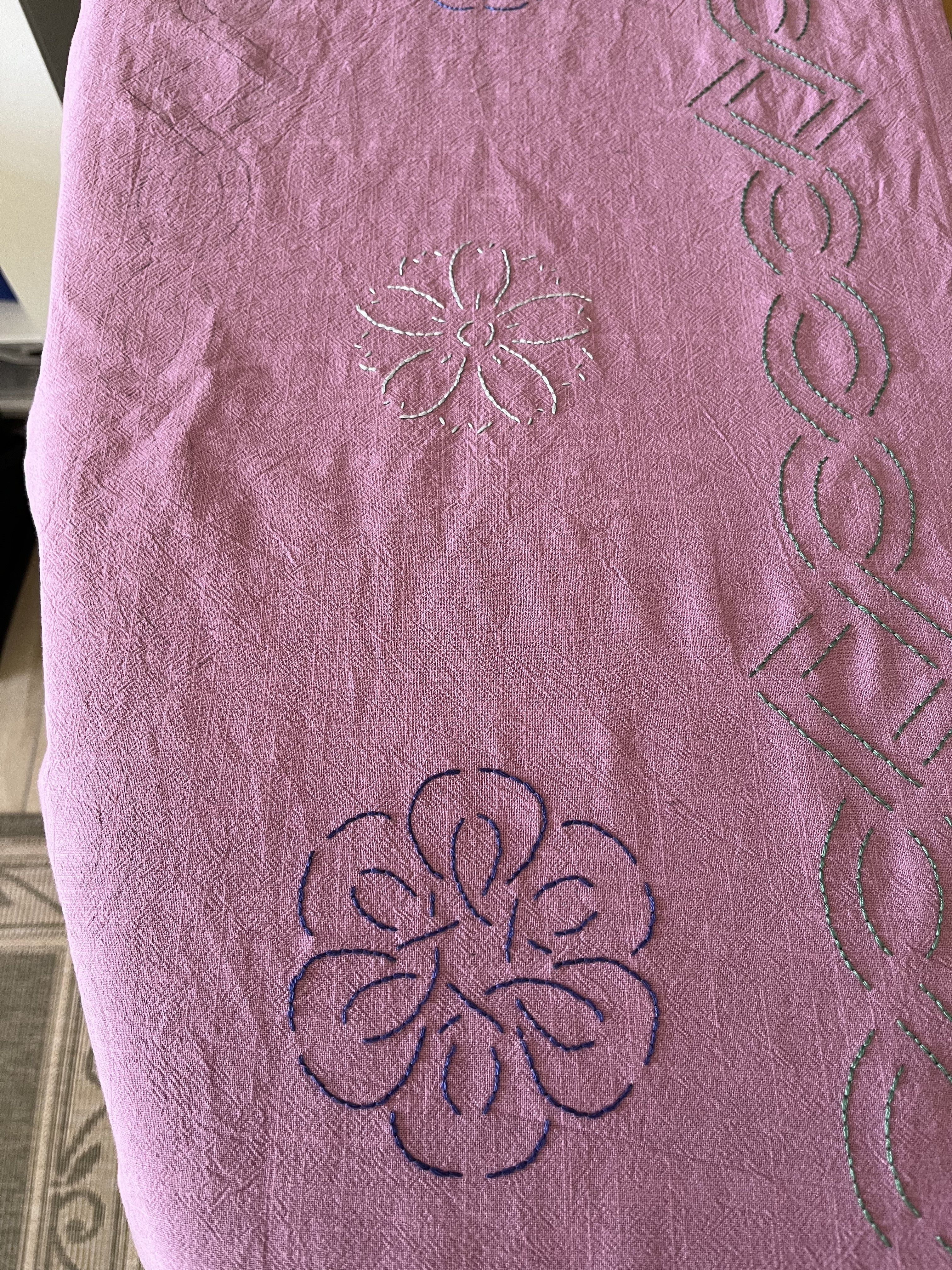 In the meantime, I have been working on the TRP (Table Runner Project). It took me a while to decide what to do with the table runner. Given that I had already started with a floral design, a sashiko design or an abstract/geometric design probably wouldn’t have worked. My first idea was to create a circle in the middle of the runner, a clearly separated space, for a second floral design. I am still kind of toying with that idea – possibly using the same floral design in the corners somehow.