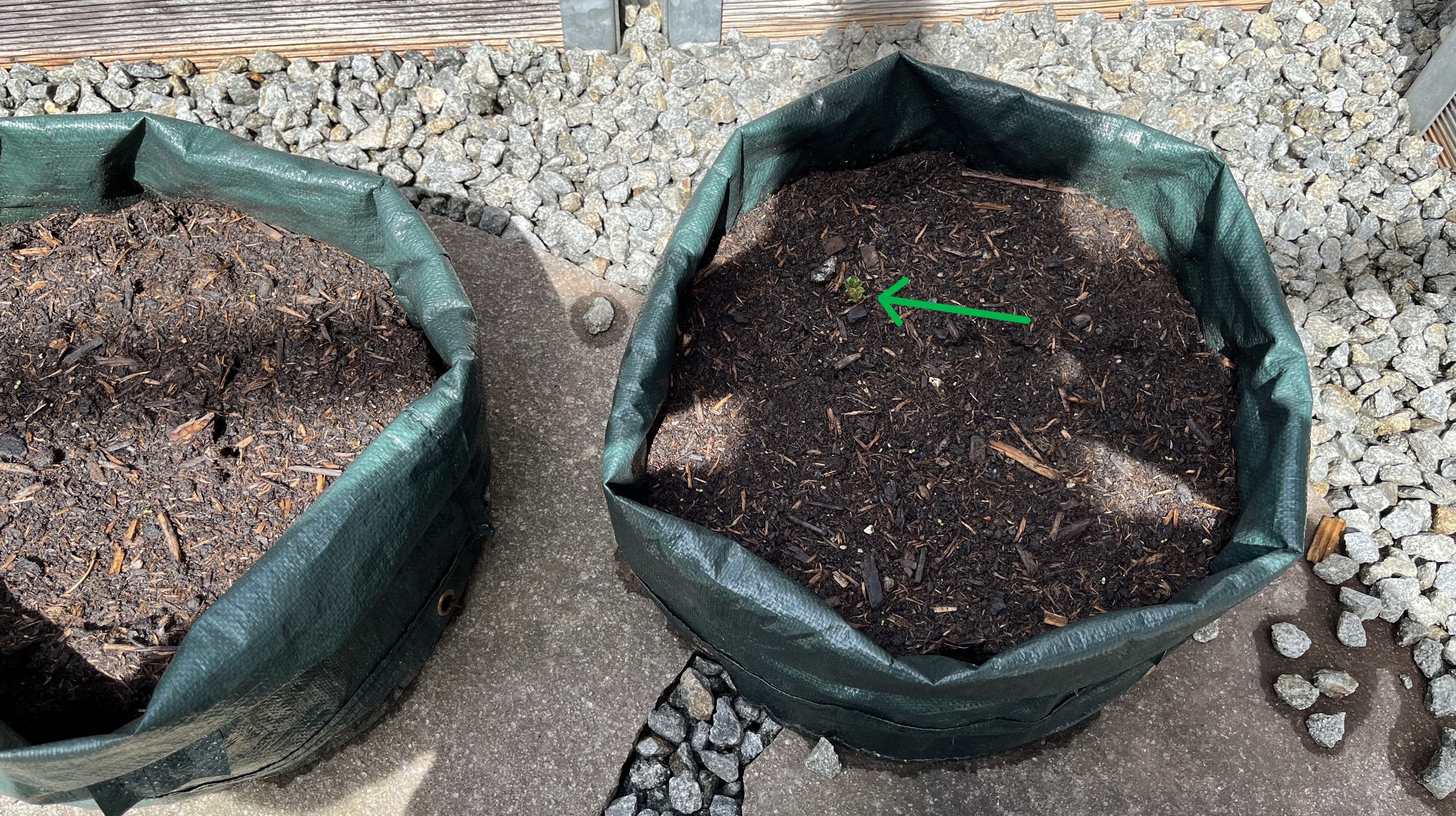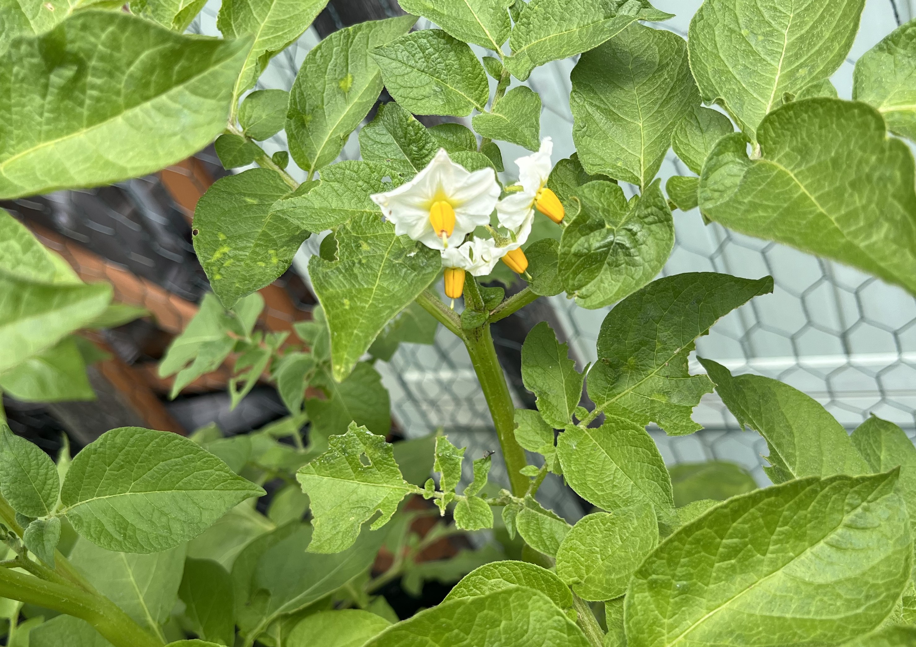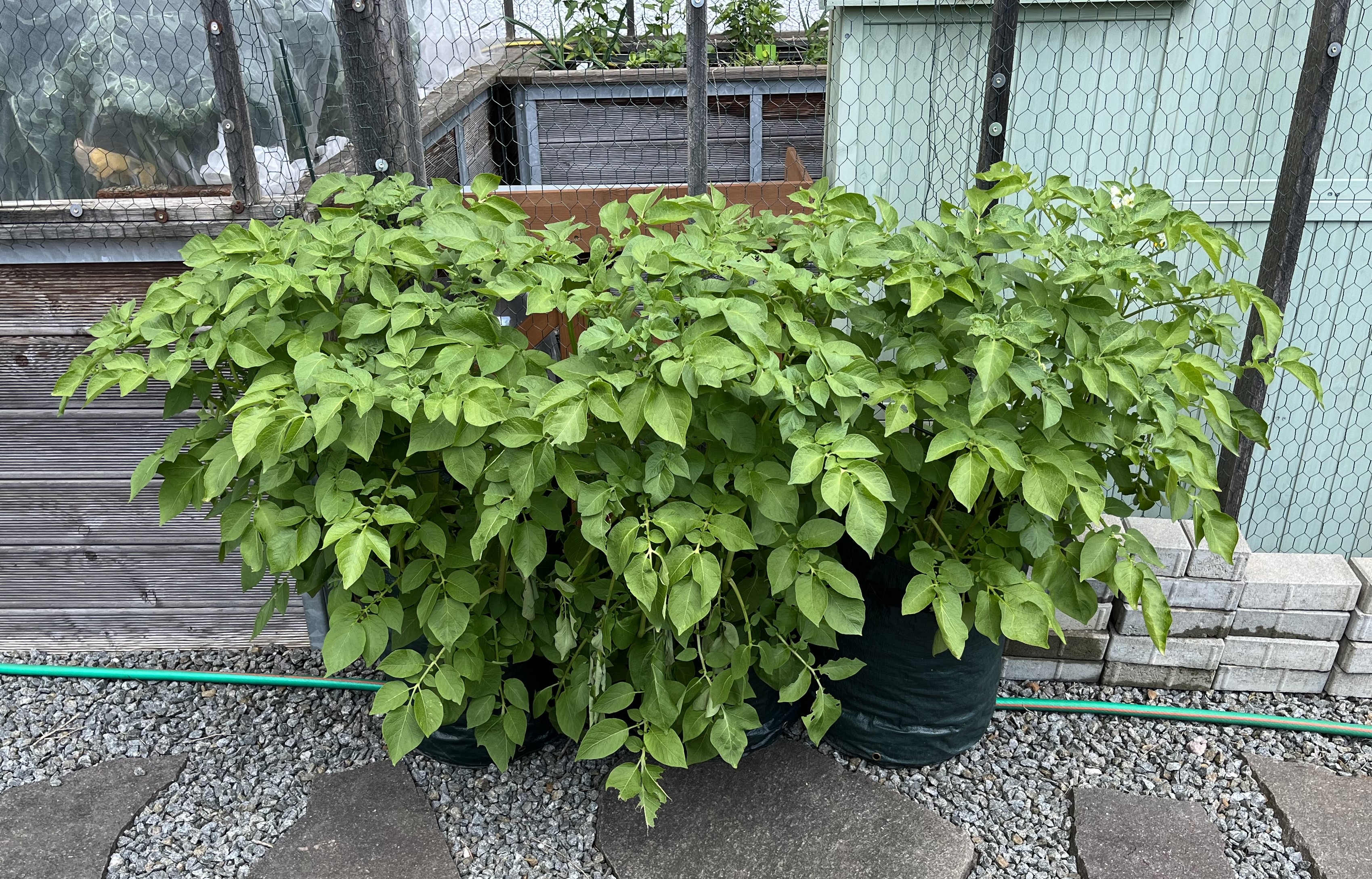 The potatoes are coming along. I wasn’t sure if they’d survive the overnight frosts. Being planted in a sack doesn’t provide much protection from freezing temps but they survived and have started to sprout! I have already covered them over with additional soil … twice!