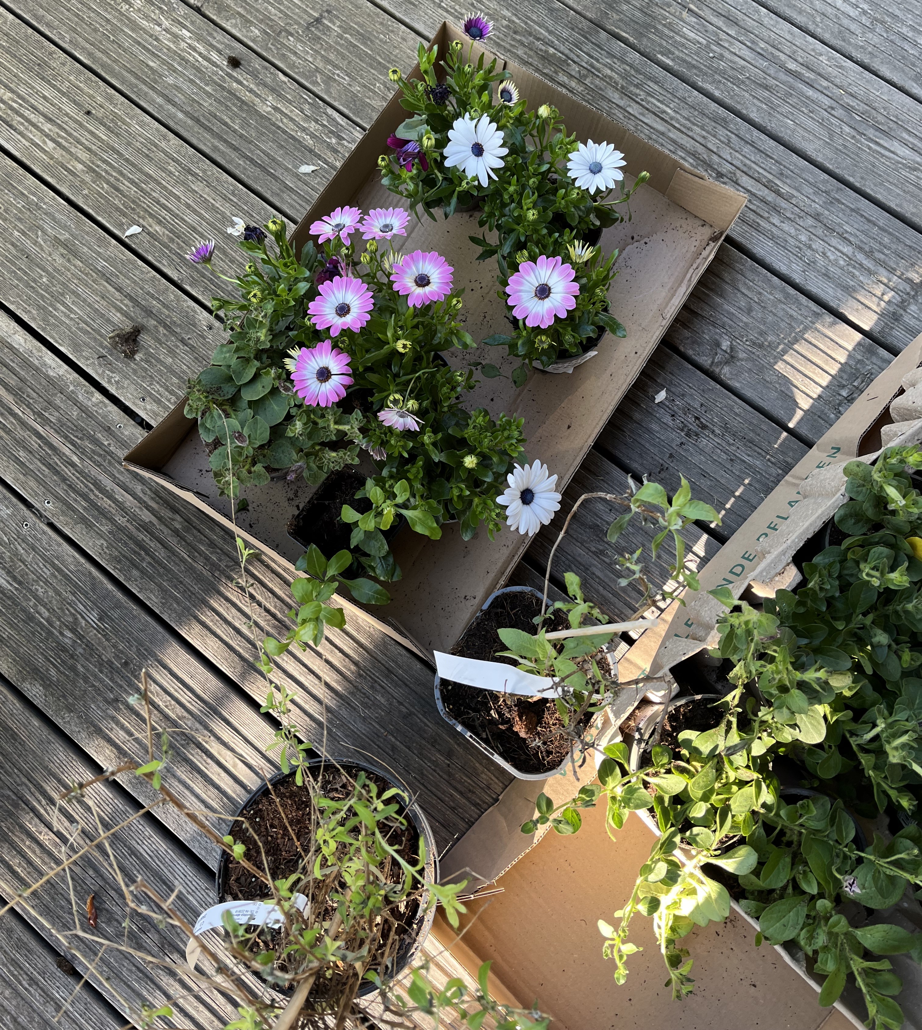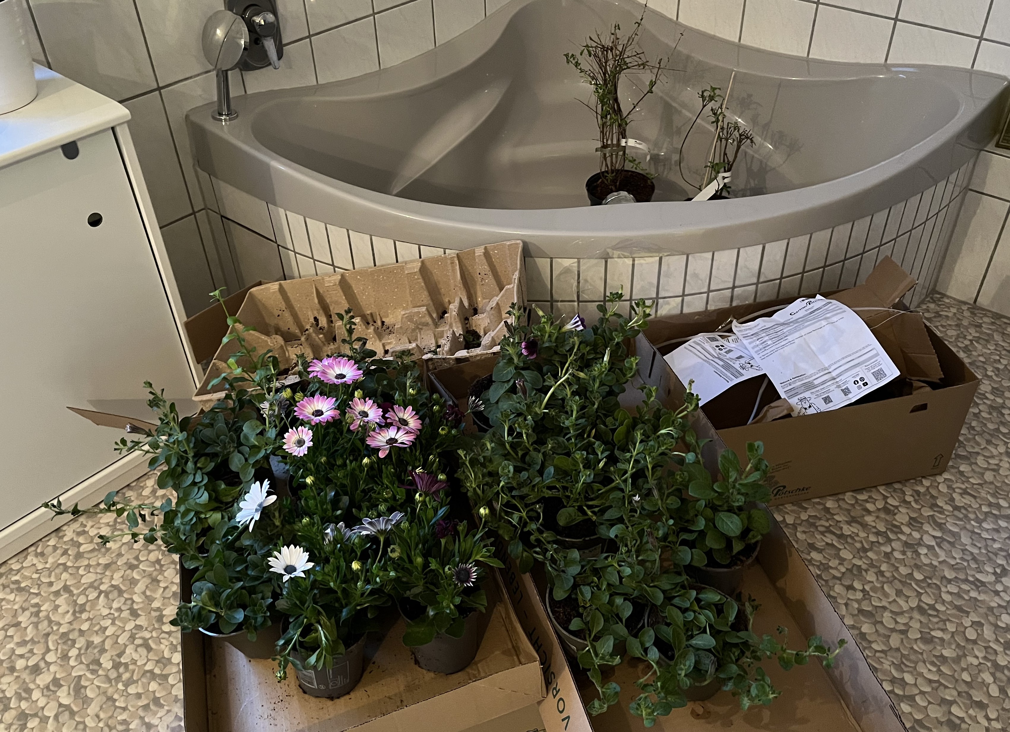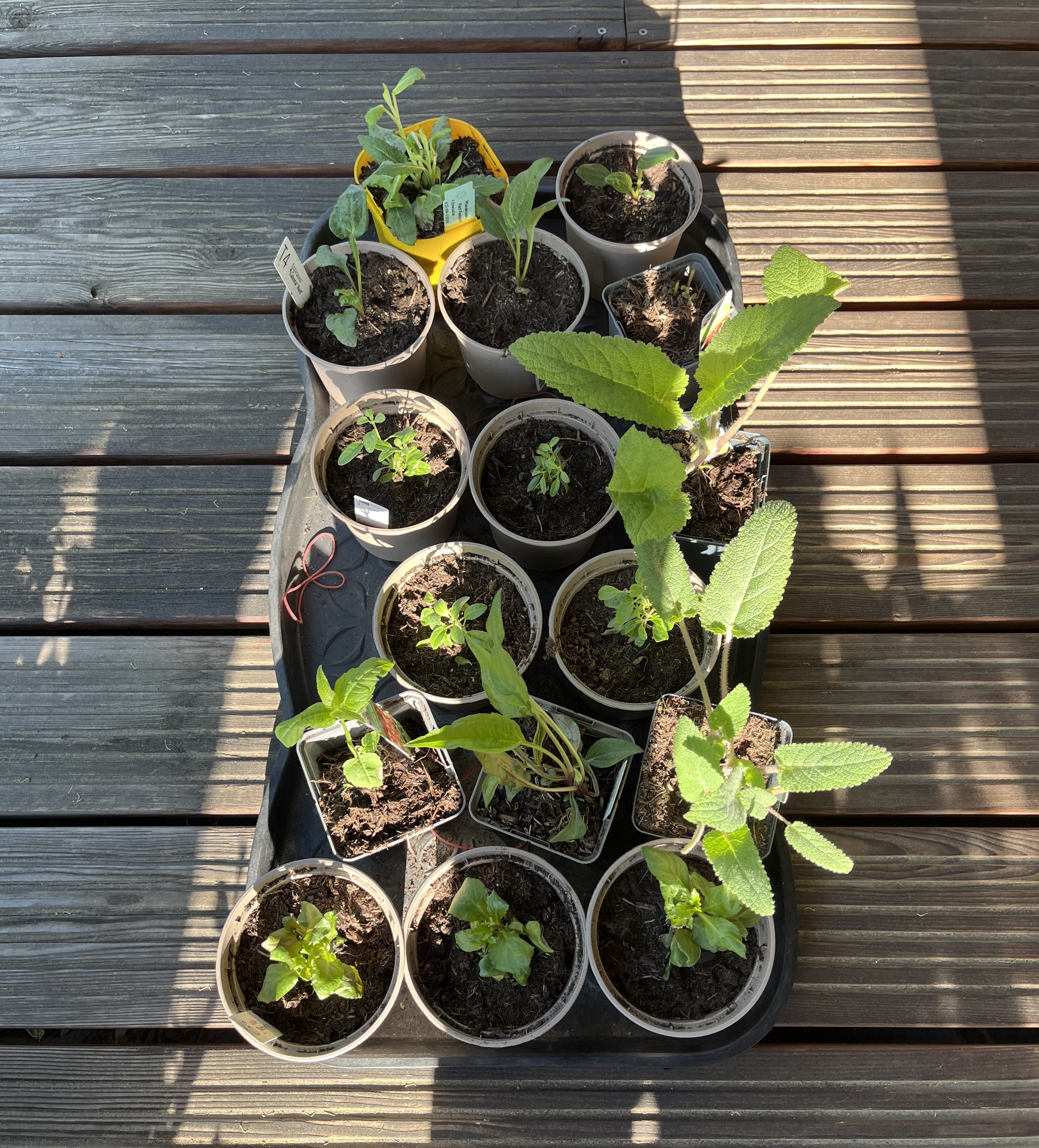 Finally, a large portion of the plants I ordered have arrived or are arriving this week. Those which arrived 10 days ago haven’t even seen the outside yet. I had to re-pot them in tiny pots and am keeping them moist until the soil outside has warmed up again.