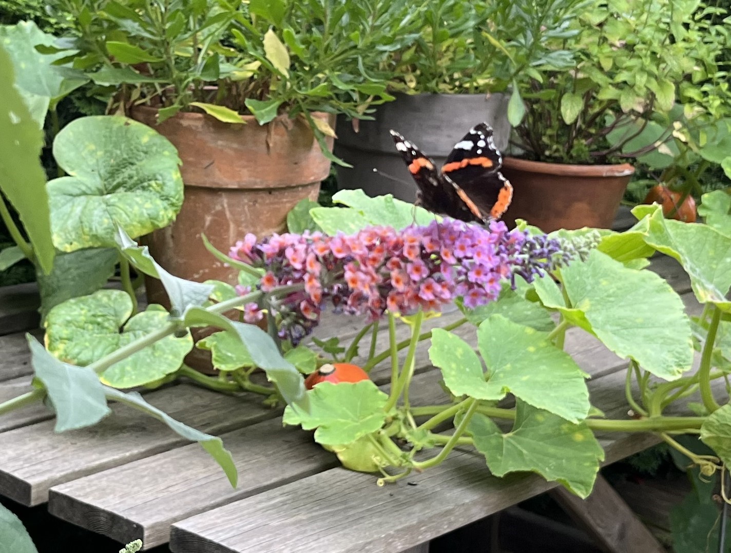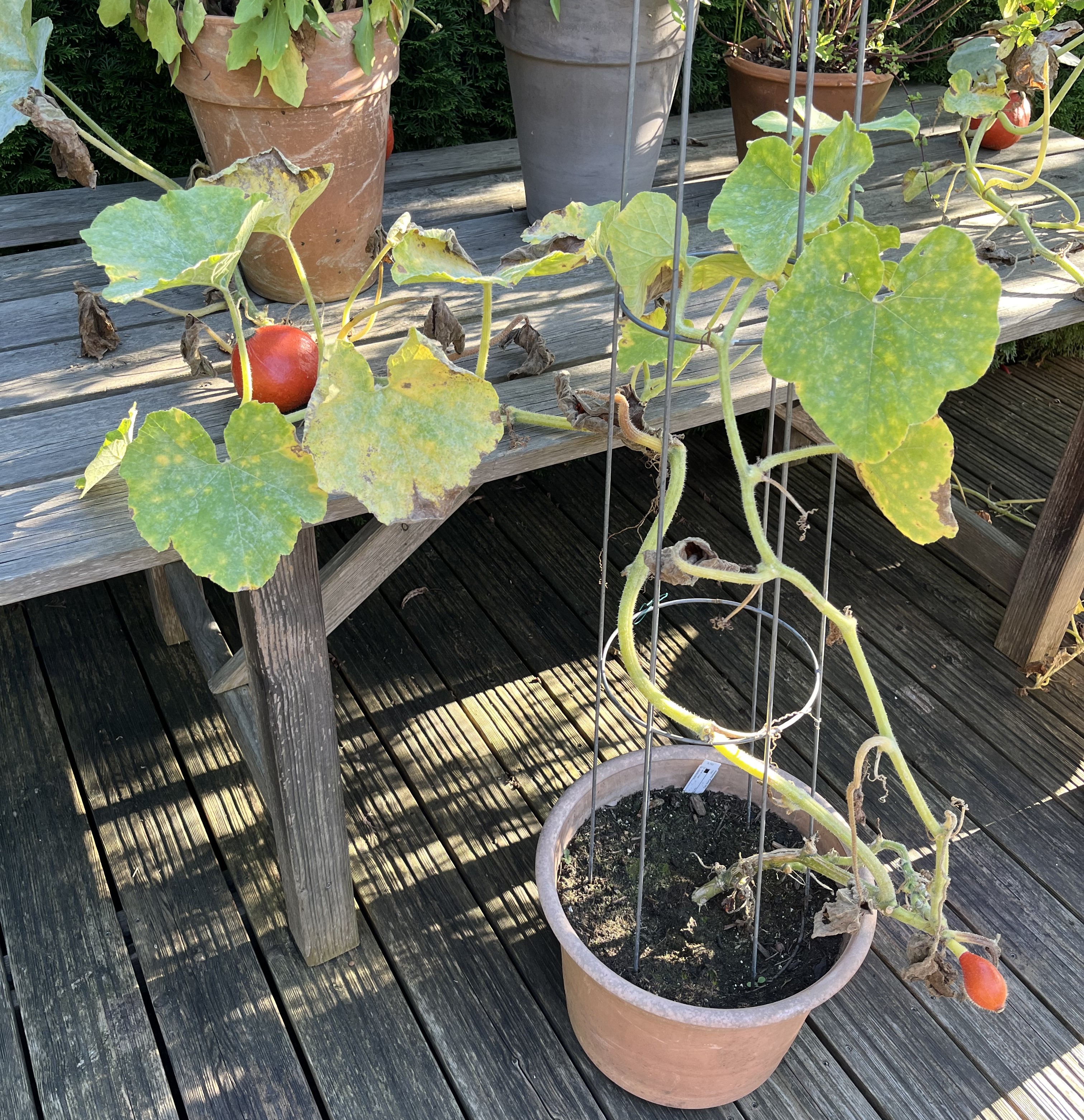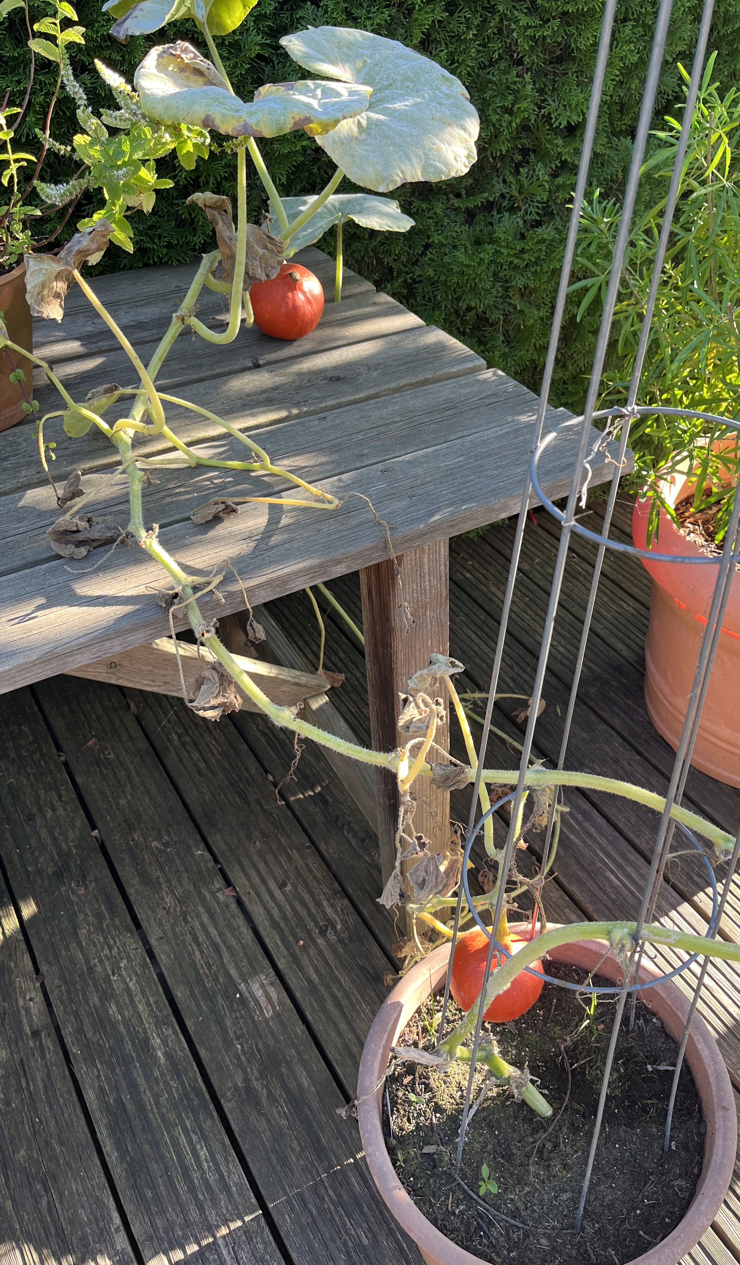 Along with the flowering plants on the terrace, there are now two pots with hokkaido pumpkin plants. Unfortunately, the first two plants did not survive the frost and I had to replace them. Soon the new plants should start to sprout and grow and I will wind the plants around the plant pyramid. Again, thanks to a youtube video, I am a little smarter now about how to keep hokkaido plants from overtaking a space. We’ll see how I do this year.