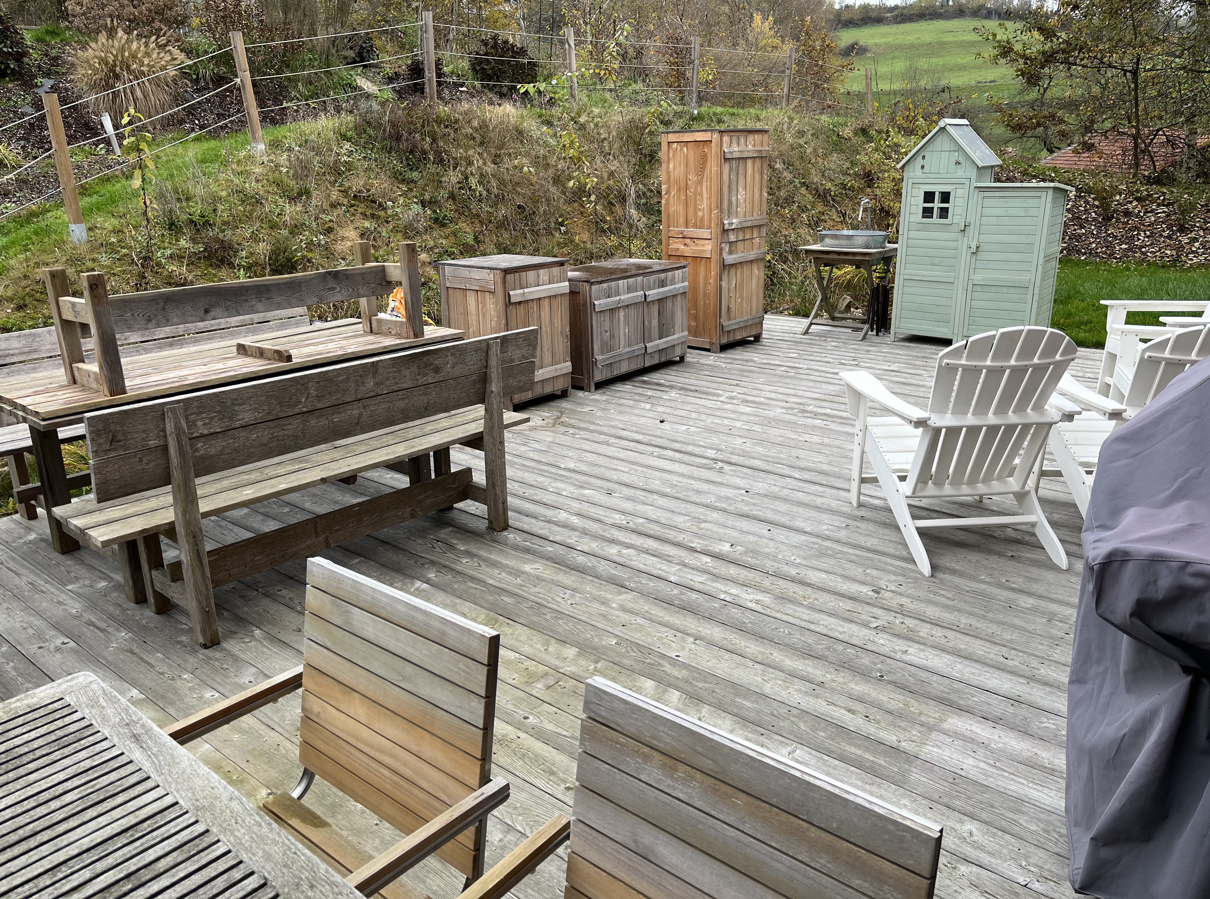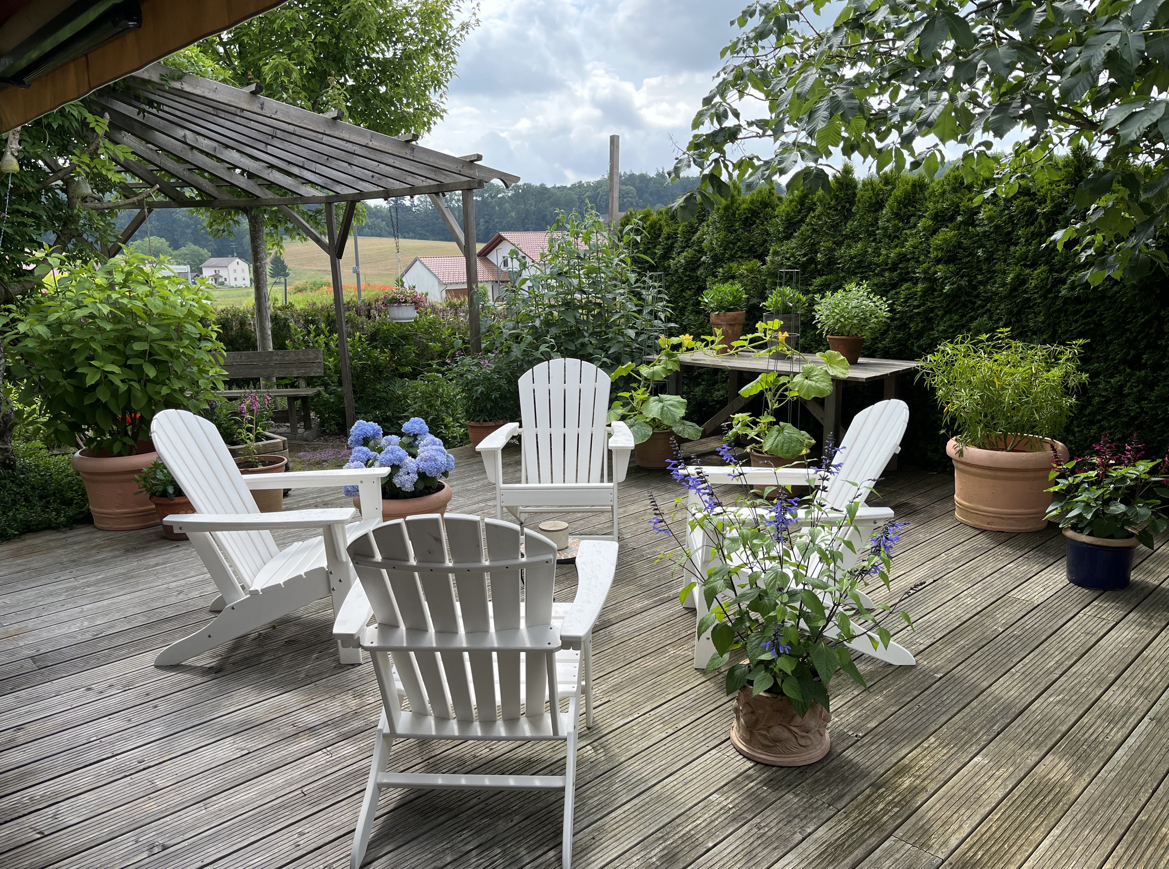 Here are some photos from the terrace that give you an idea of the area around us … can you say hilly? 😉 Sometimes we can see horses grazing on the field up the hill from us; you can see the field in the picture on the right below.