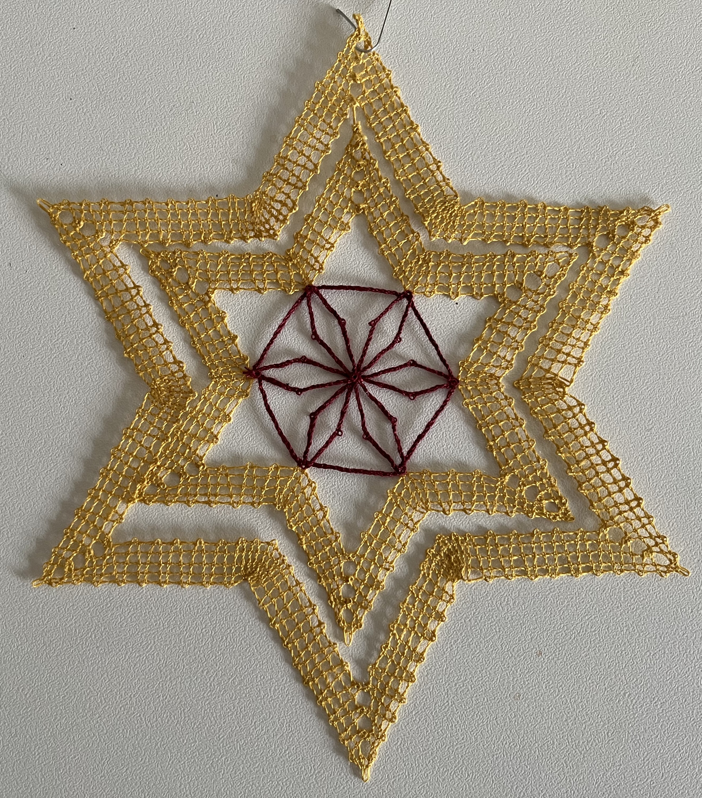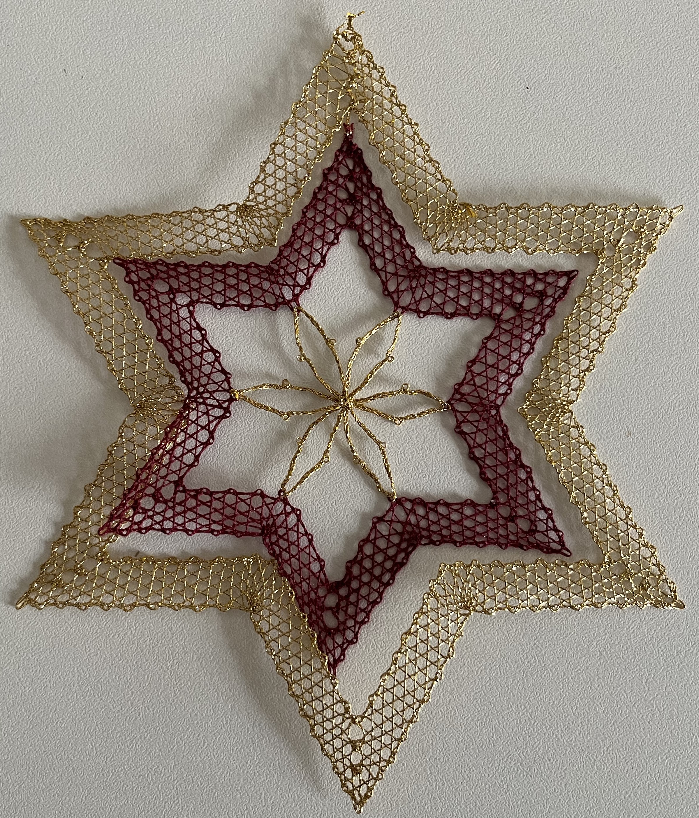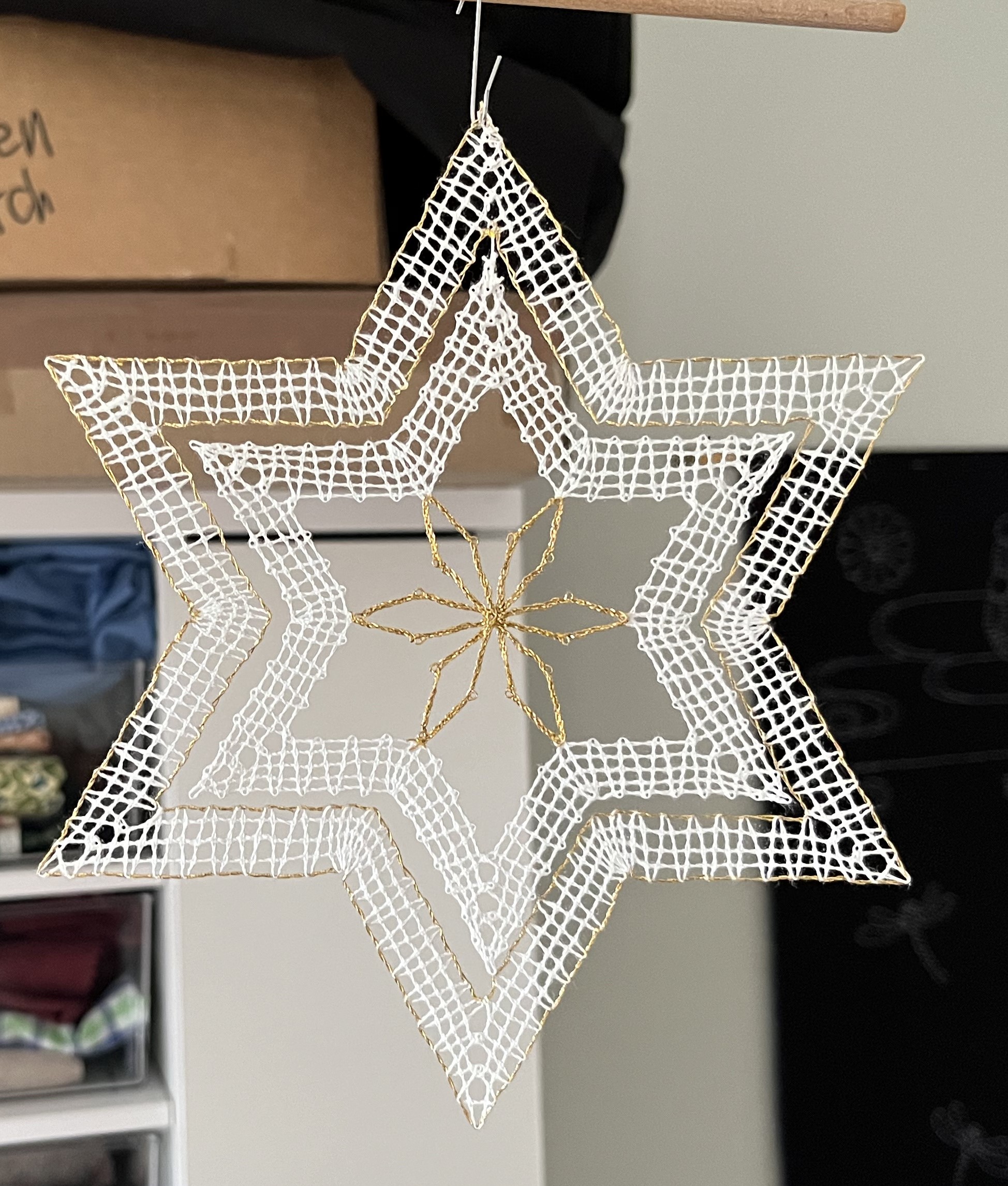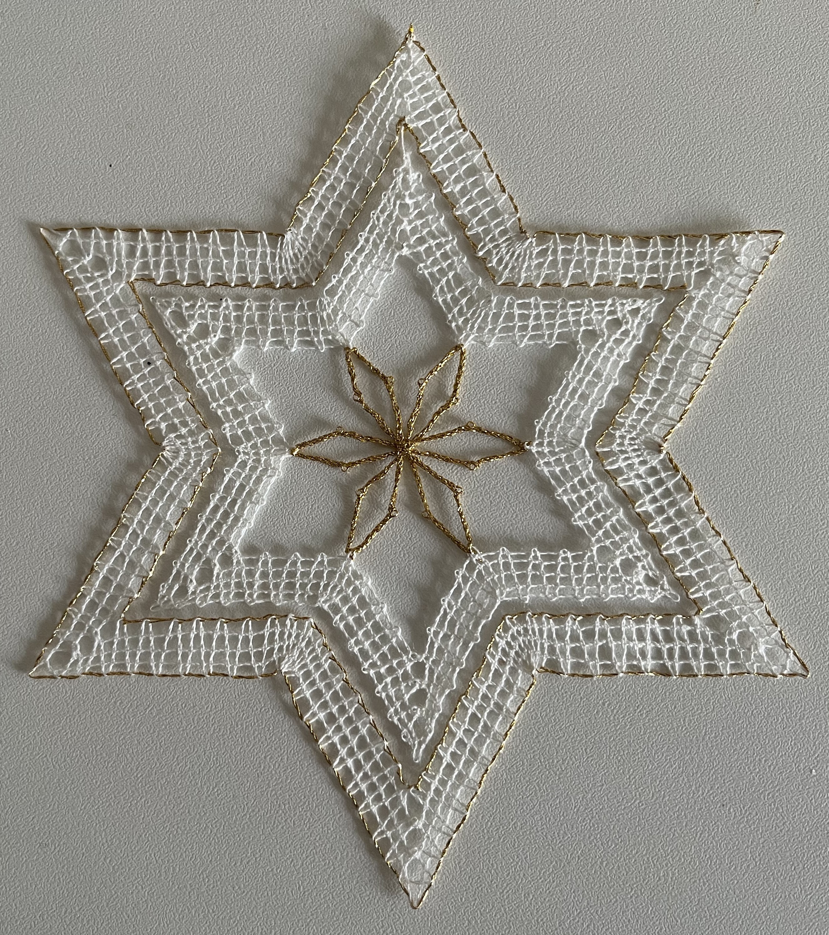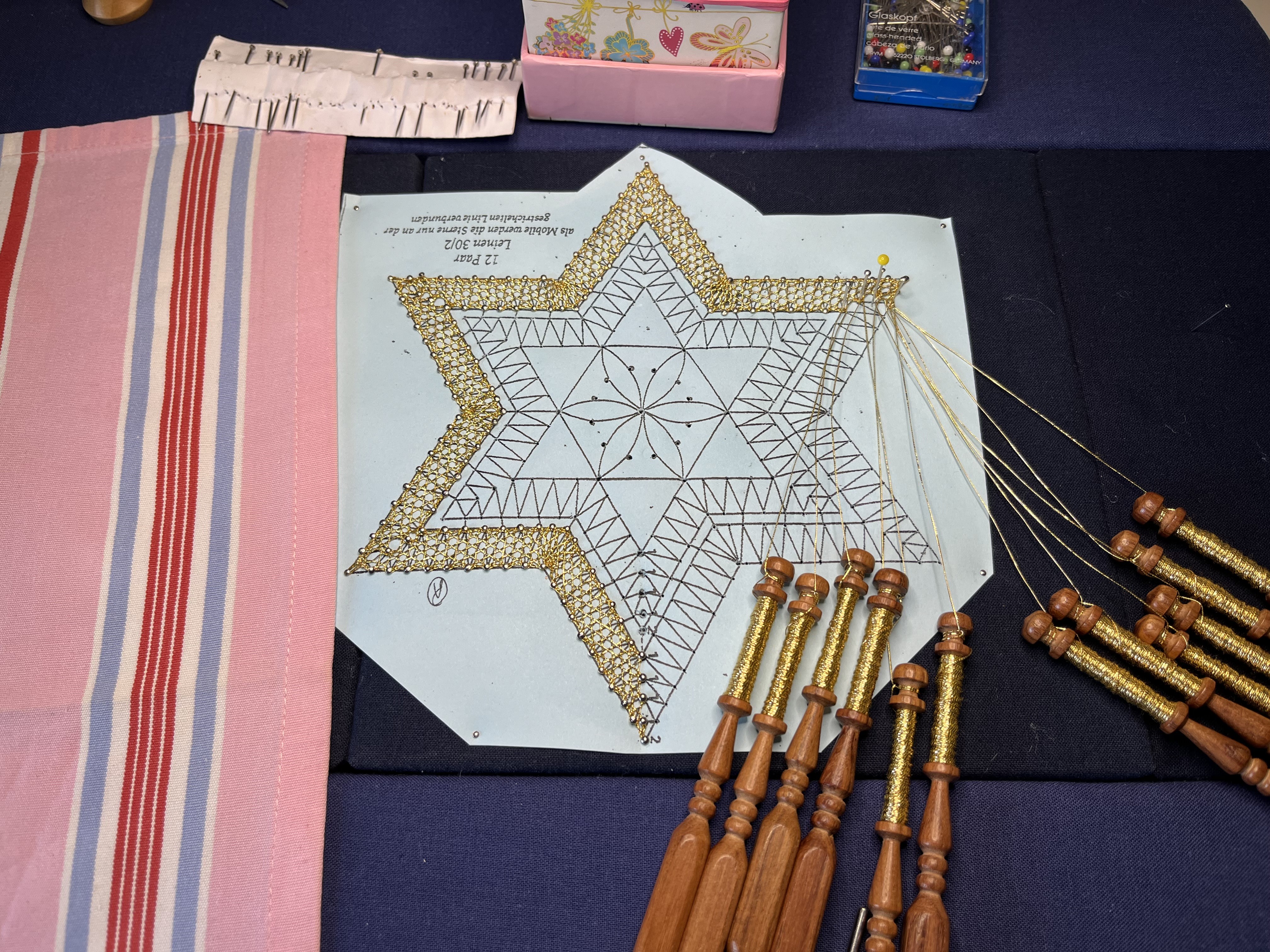 While visiting a friend in Schwarzenberg in the Erzgebirge (one of the bobbin lace centers of eastern Germany), we visited the local lace-making school and I picked up a star pattern.