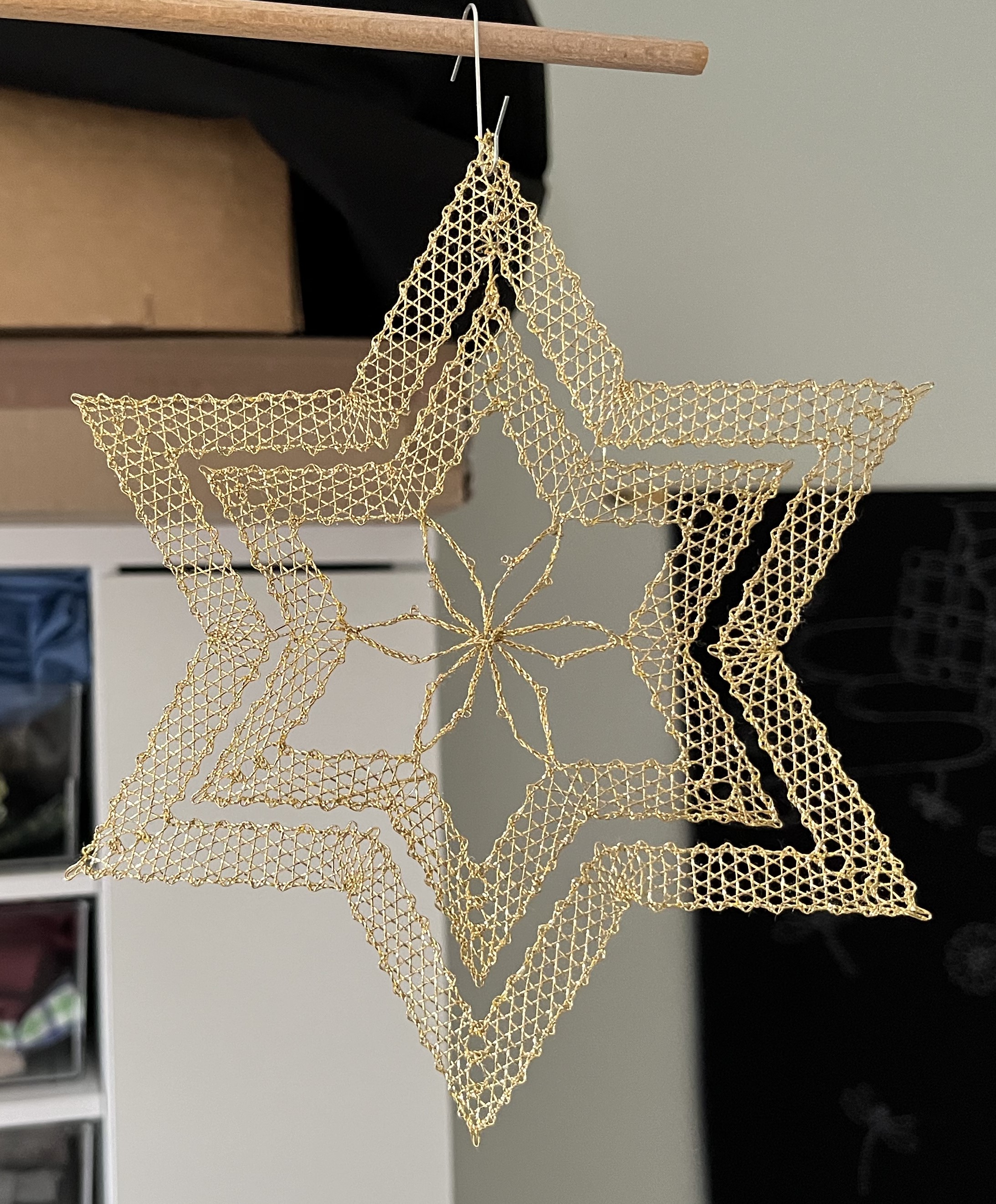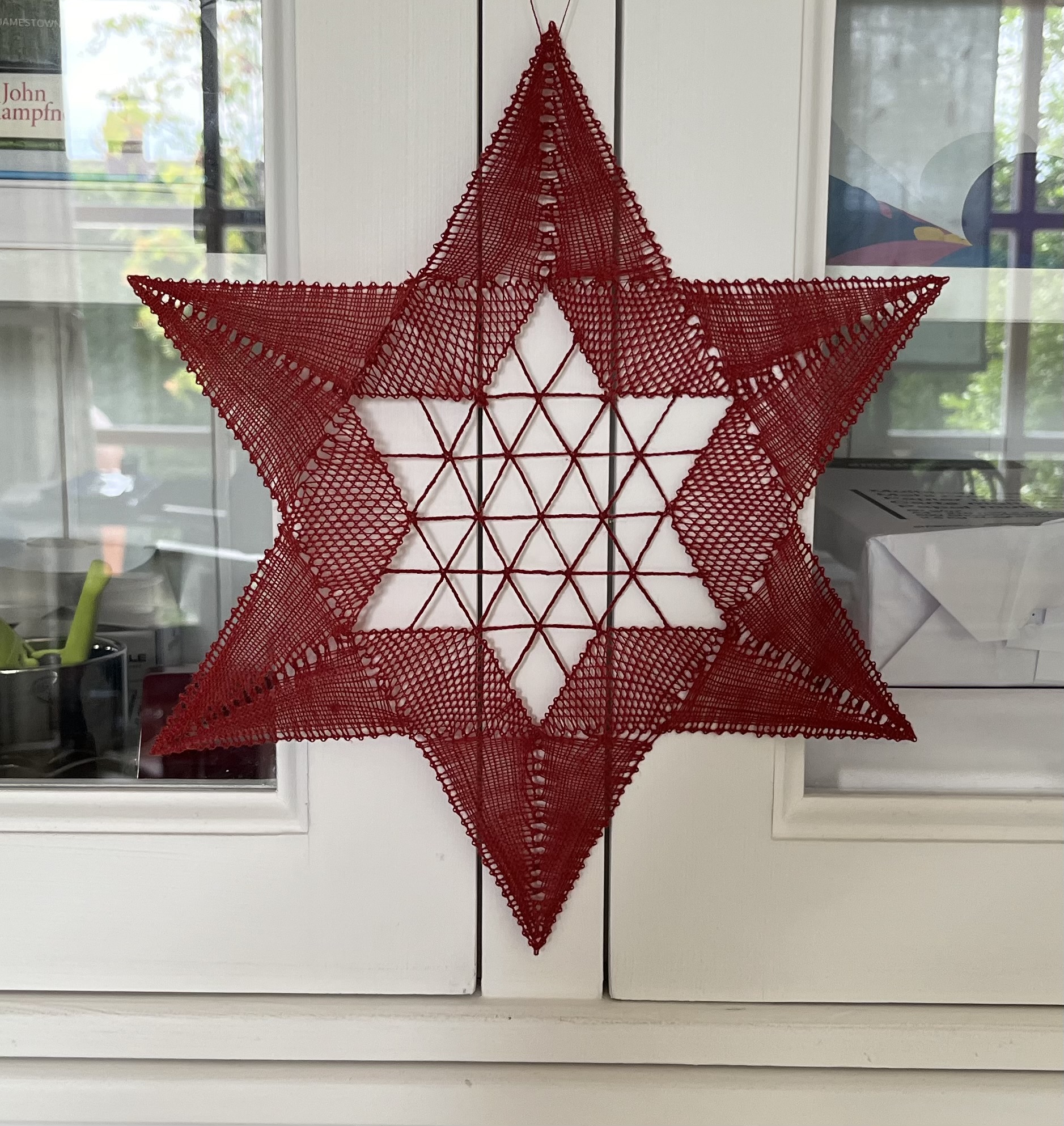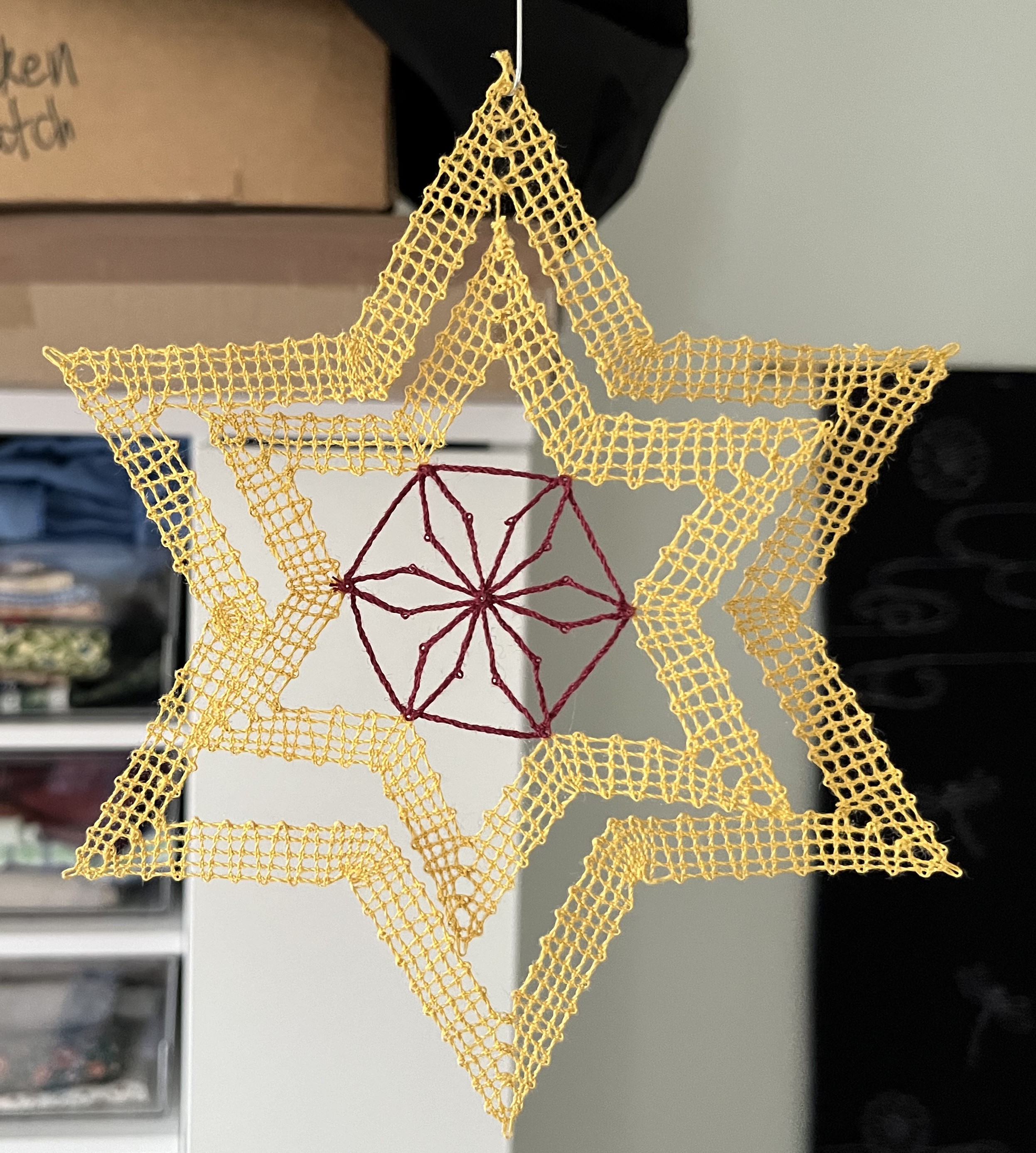 And, of course, I continue working on my bobbin-lace star. Progress has been slow because I’ve had to undo and redo some sections repeatedly. Well, I started bobbin-lace as part of an effort to gain more patience … and it never disappoints! Bobbin-lace making will try anyone’s patience! Here are a couple of photos of my progress: