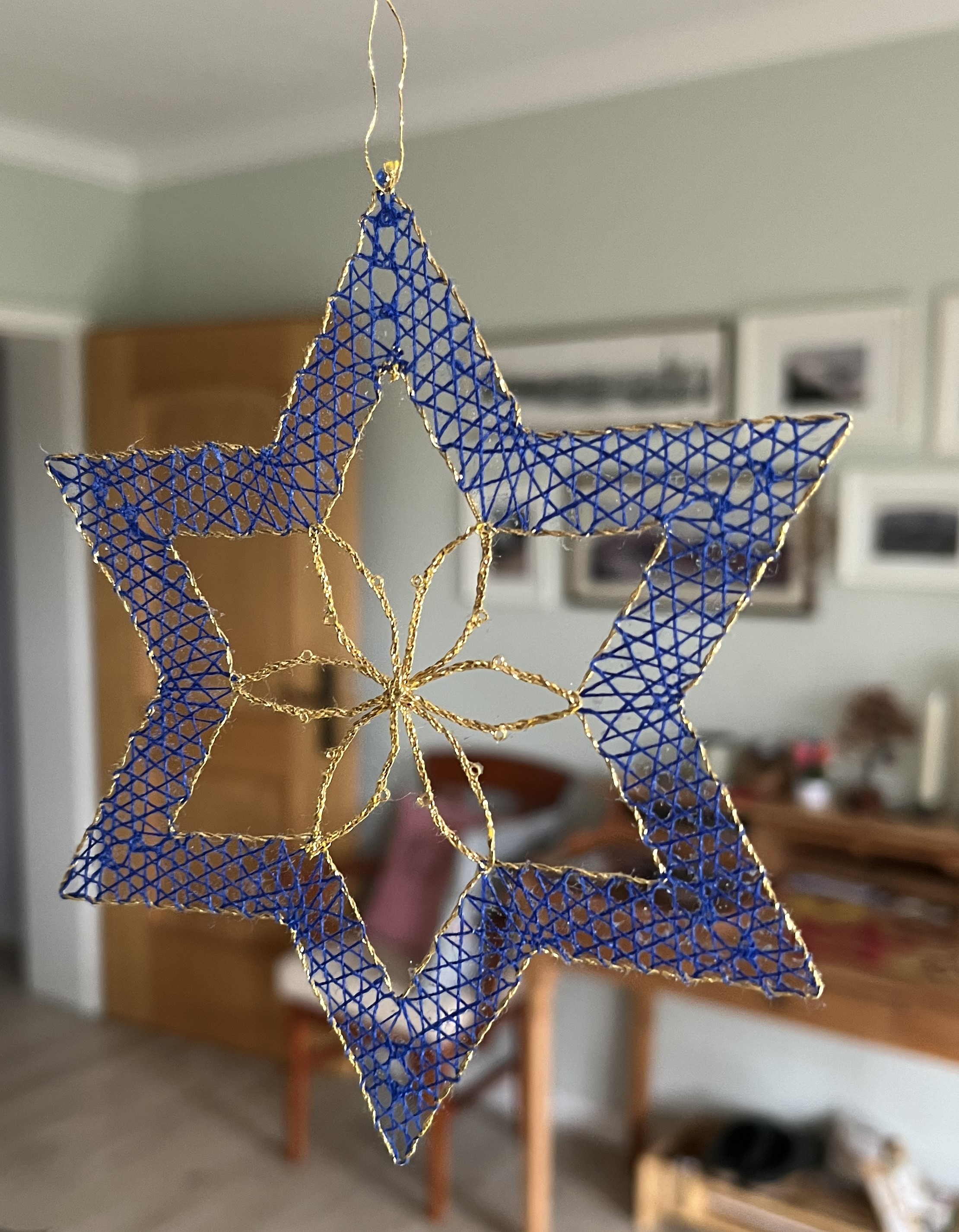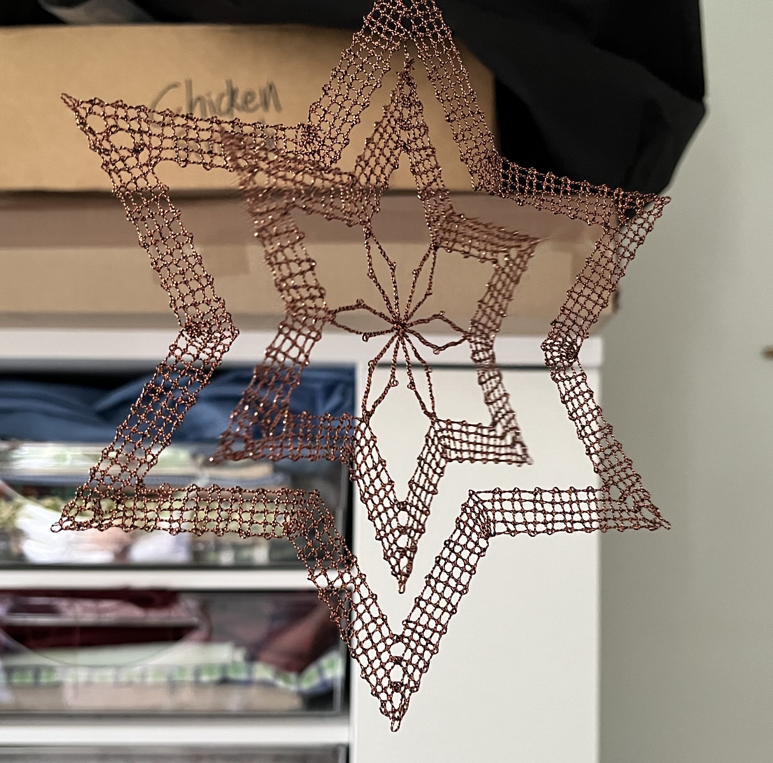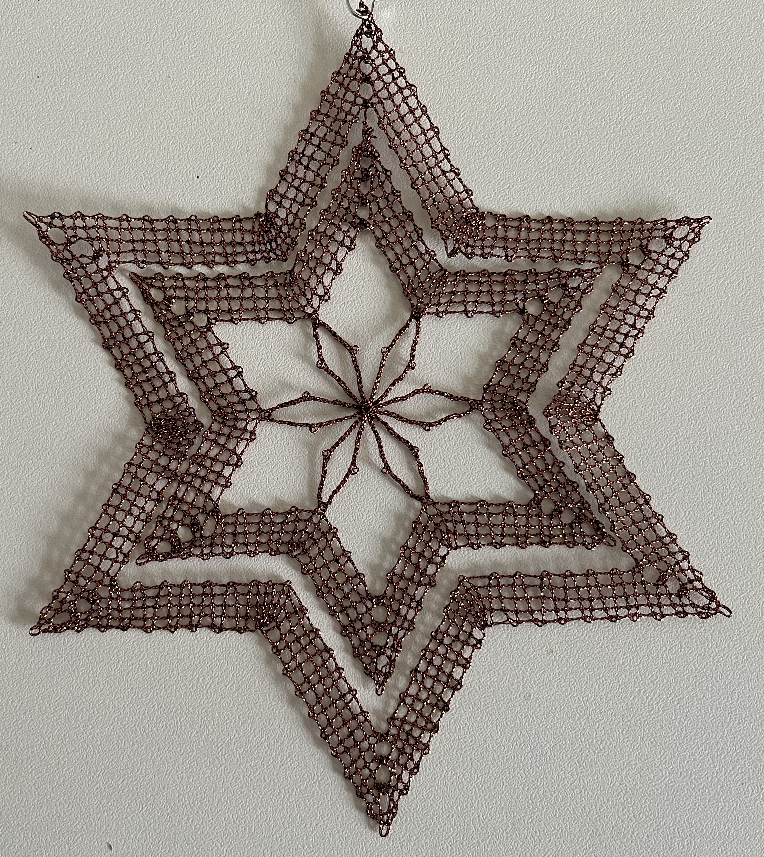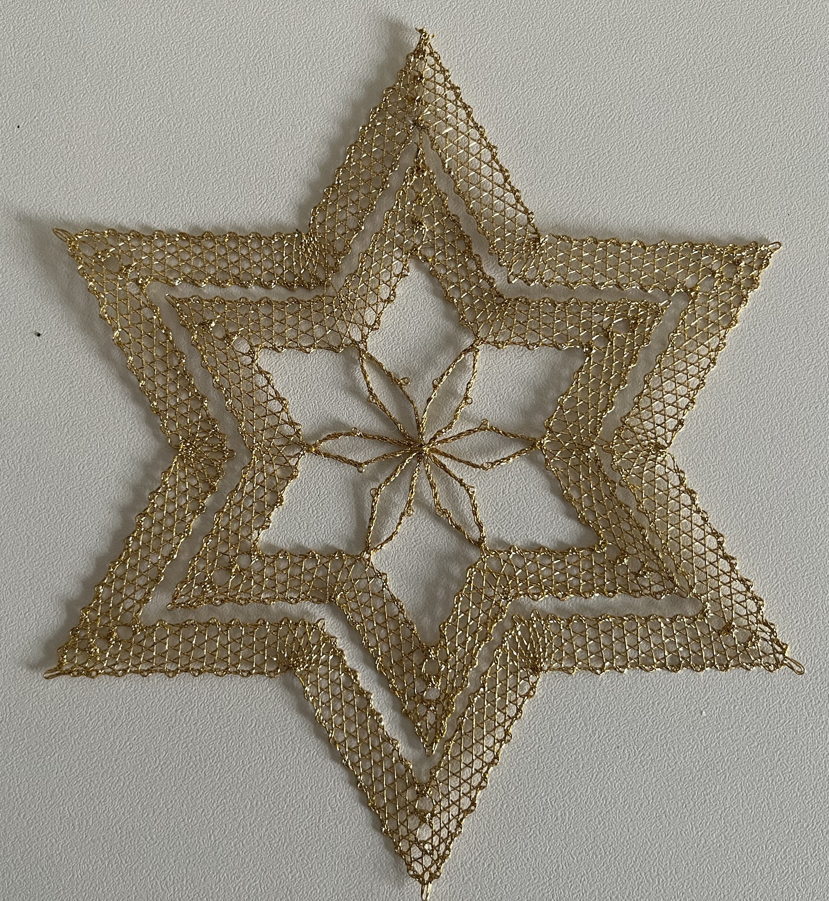 And, of course, I continue working on my bobbin-lace star. Progress has been slow because I’ve had to undo and redo some sections repeatedly. Well, I started bobbin-lace as part of an effort to gain more patience … and it never disappoints! Bobbin-lace making will try anyone’s patience! Here are a couple of photos of my progress: