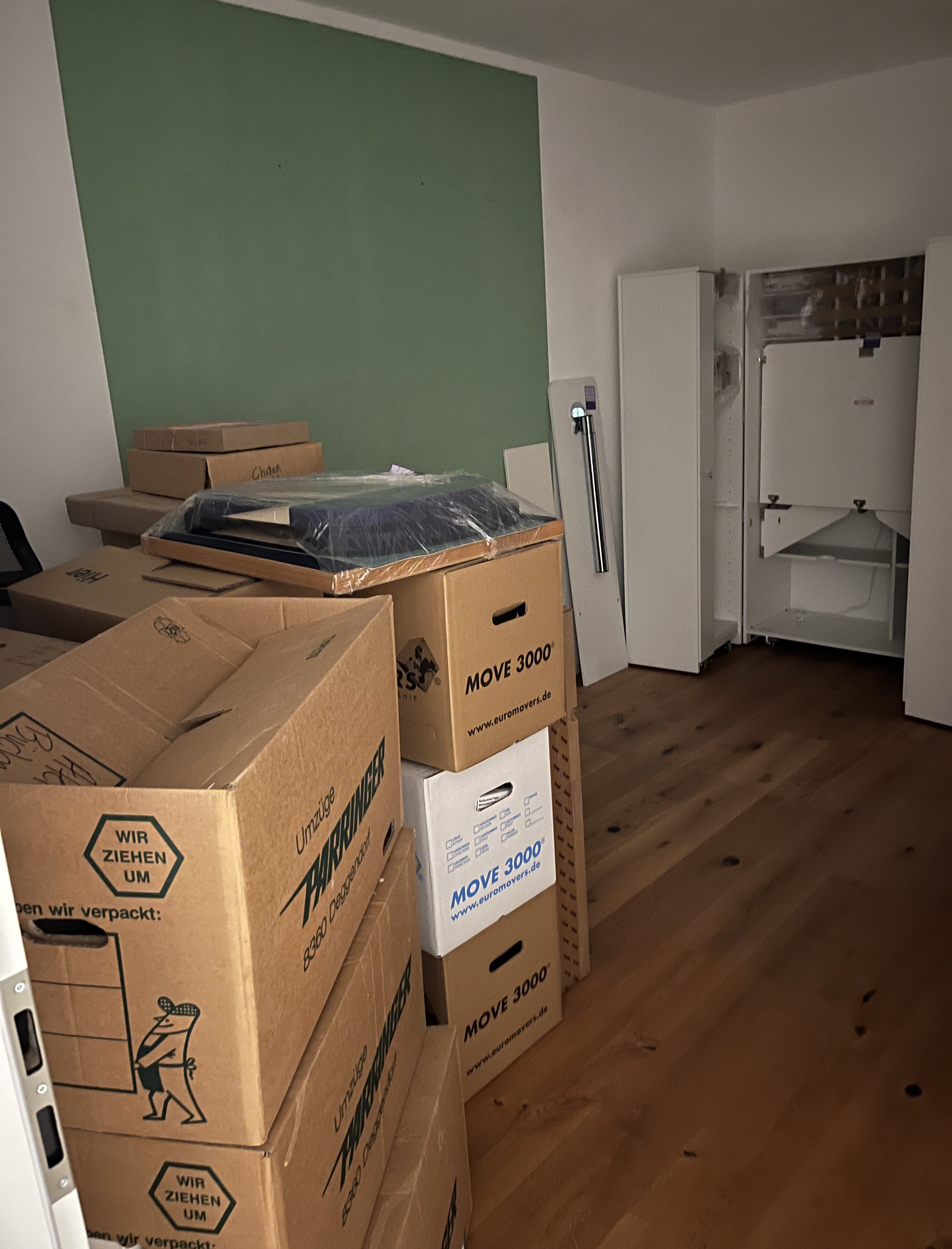 I decided to flip my plan 90° and instead of putting the crafts-closet at the far wall, I decided to center it on the main wall, which the previous owners had painted a nice, friendly shade of green in the middle. Seemed perfect – the largest piece of furniture against the largest wall and centering the crafts-closed in front of the green wall appealed to my sense of symmetry. Then, I placed my desk opposite to the crafts-closet, in front of the floor-length windows. Lots of light and every time I looked up, I could gaze out onto the apricot trees east of the house (can’t wait to harvest them!).