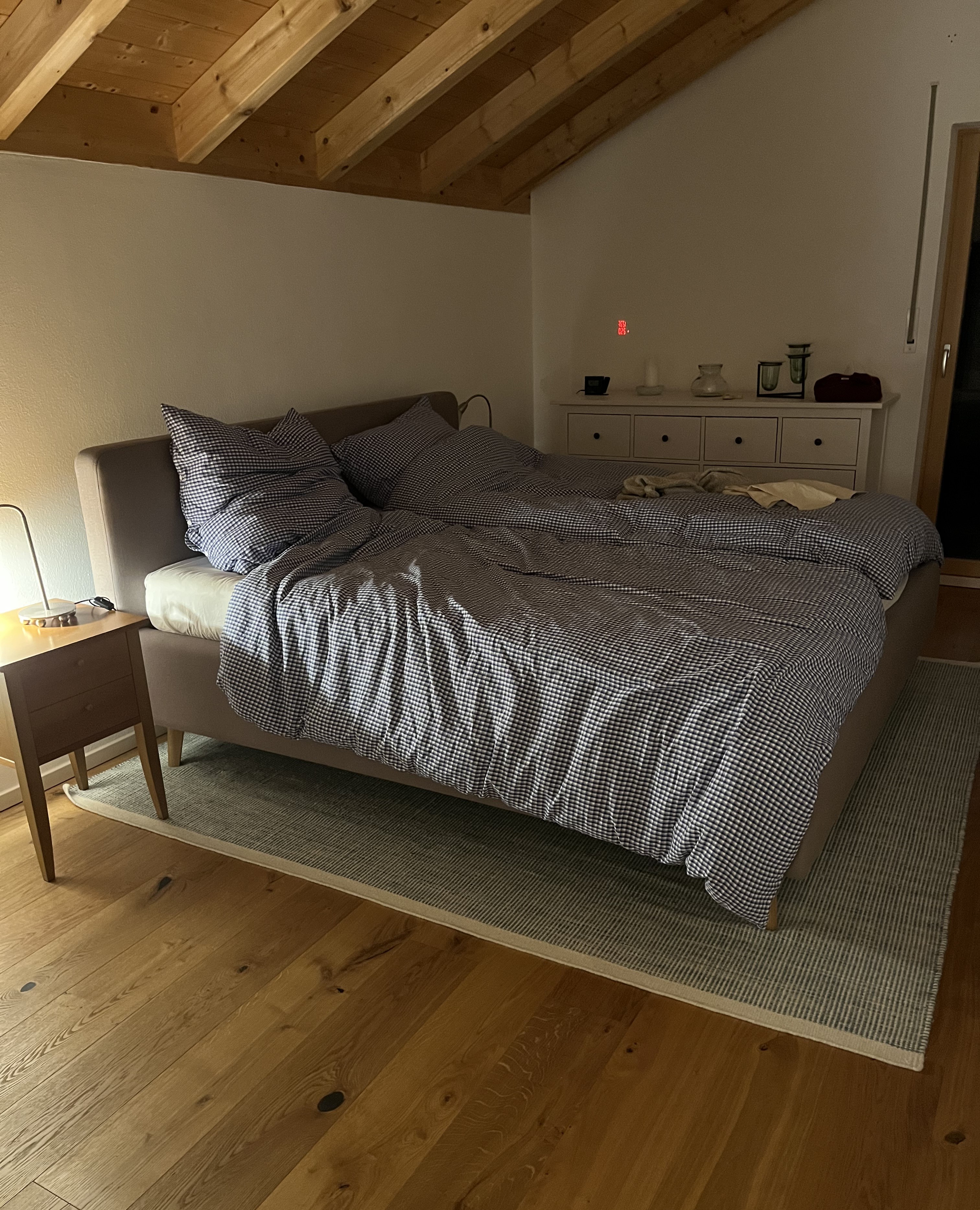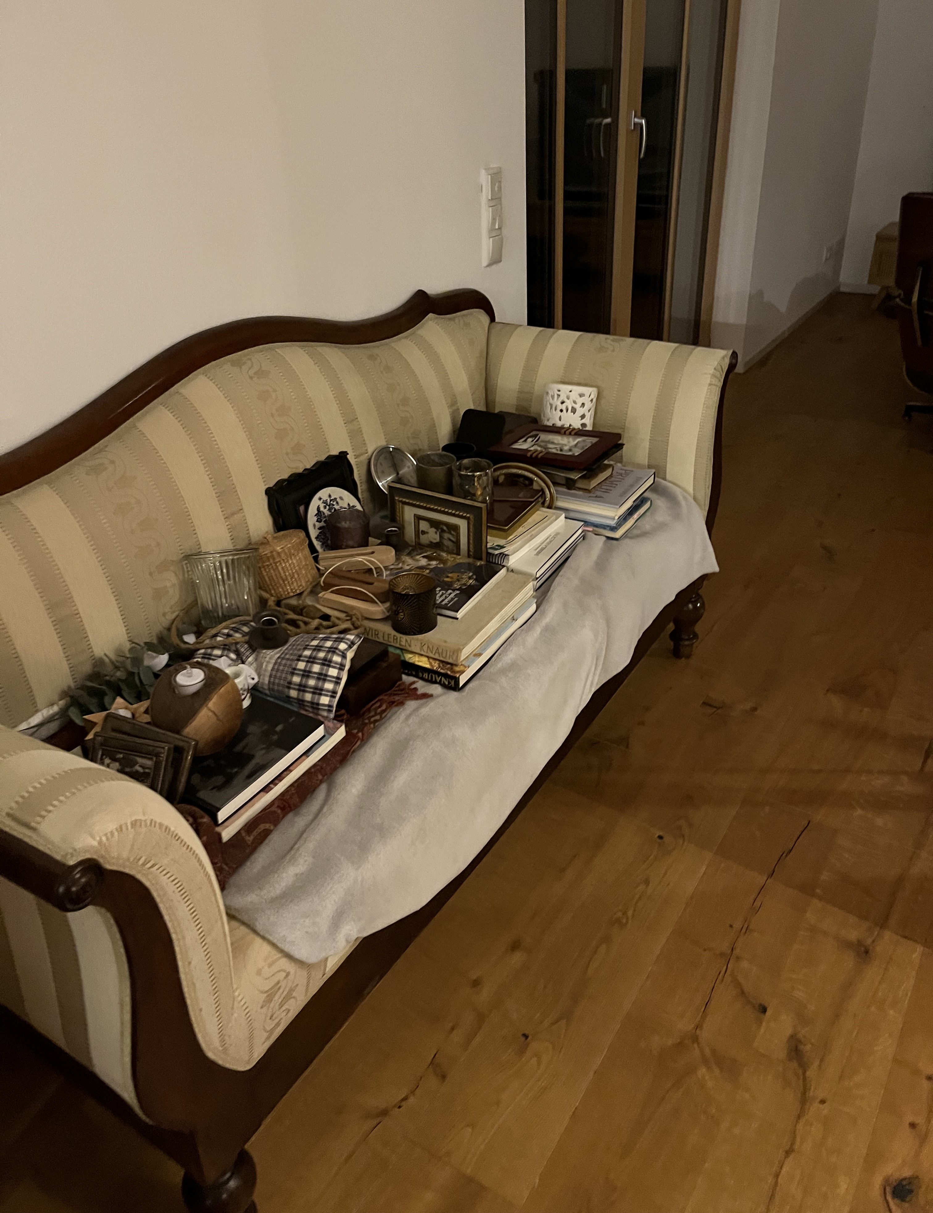 When we decided to buy the new house, I used the floorplans to get an idea of what furniture would fit and what would not. I measured our furniture and made cut-outs using graph paper. Then, I moved the pieces of paper around until I got what seemed like a good arrangement. For some rooms, this was a cinch, like for the bedroom: a bed, two night-stands, a dresser, and a closet (what Germans call: Schrank). Not a lot of furniture plus a good-sized room. With the atelier it was harder. Not only was the furniture larger but I also had to make sure there would be room for a guestbed/daybed/sleeper sofa. In the new house, the atelier serves also as guest bedroom.