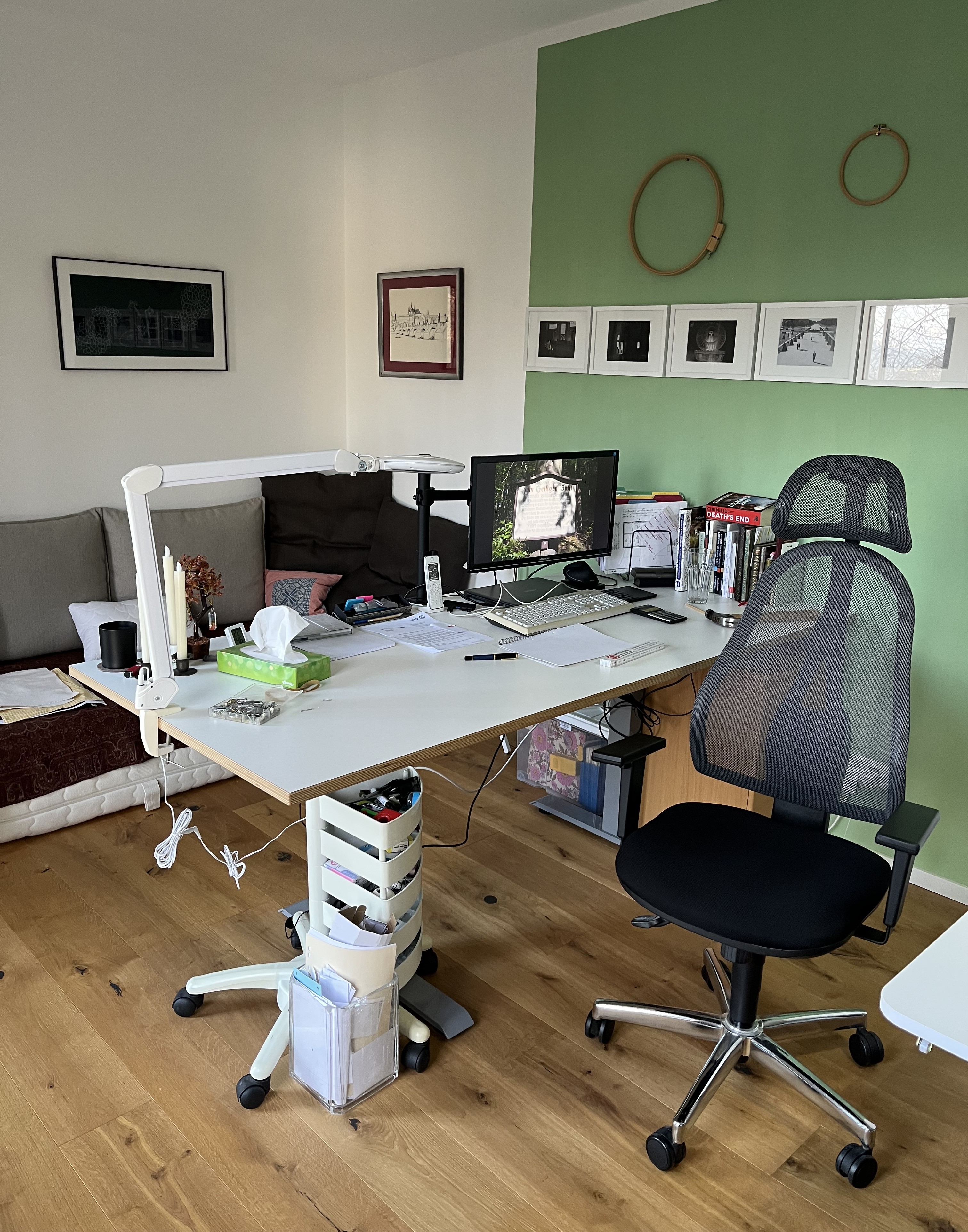There were a couple of benefits I hadn’t counted on in changing things back to the way they were. For instance, the row of black&white film stills on the back wall now hang on the green wall, which makes them pop better. The full access to the floor-length windows is also really nice; once we get insect screens installed, it will be wonderful to throw open the doors and let the fresh air in. And finally, the new (old) spot for the guestbed helps the flow of the room. Instead of being stuffed in the back corner, it is now left of the door as you come in; so, as you approach the room, you see the crafts-closet and my desk but only once you enter the room do you see the “bed”. All in all, the room just flows much better now. Also, I removed the throw rug, which had served a purpose in the old atelier but just got in the way (both visually and physically) in the new one. Here’s the final version: