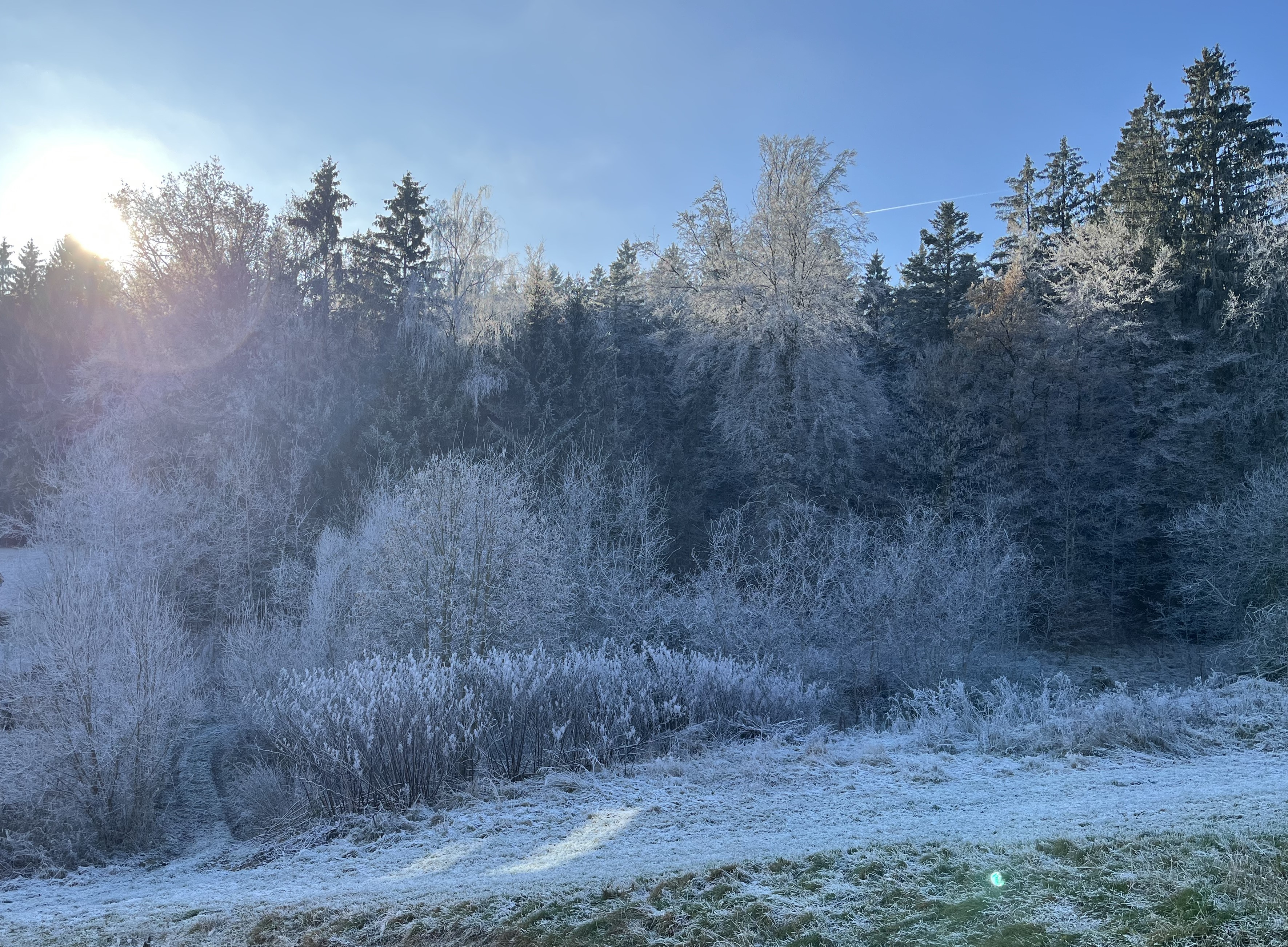 The cool thing about our property is that the shadows cast by the little forest next to us don’t really reach us, not at least until later in the afternoon. So, when the sun shines, we are in full sun and get to gaze at the frozen forest next to us.